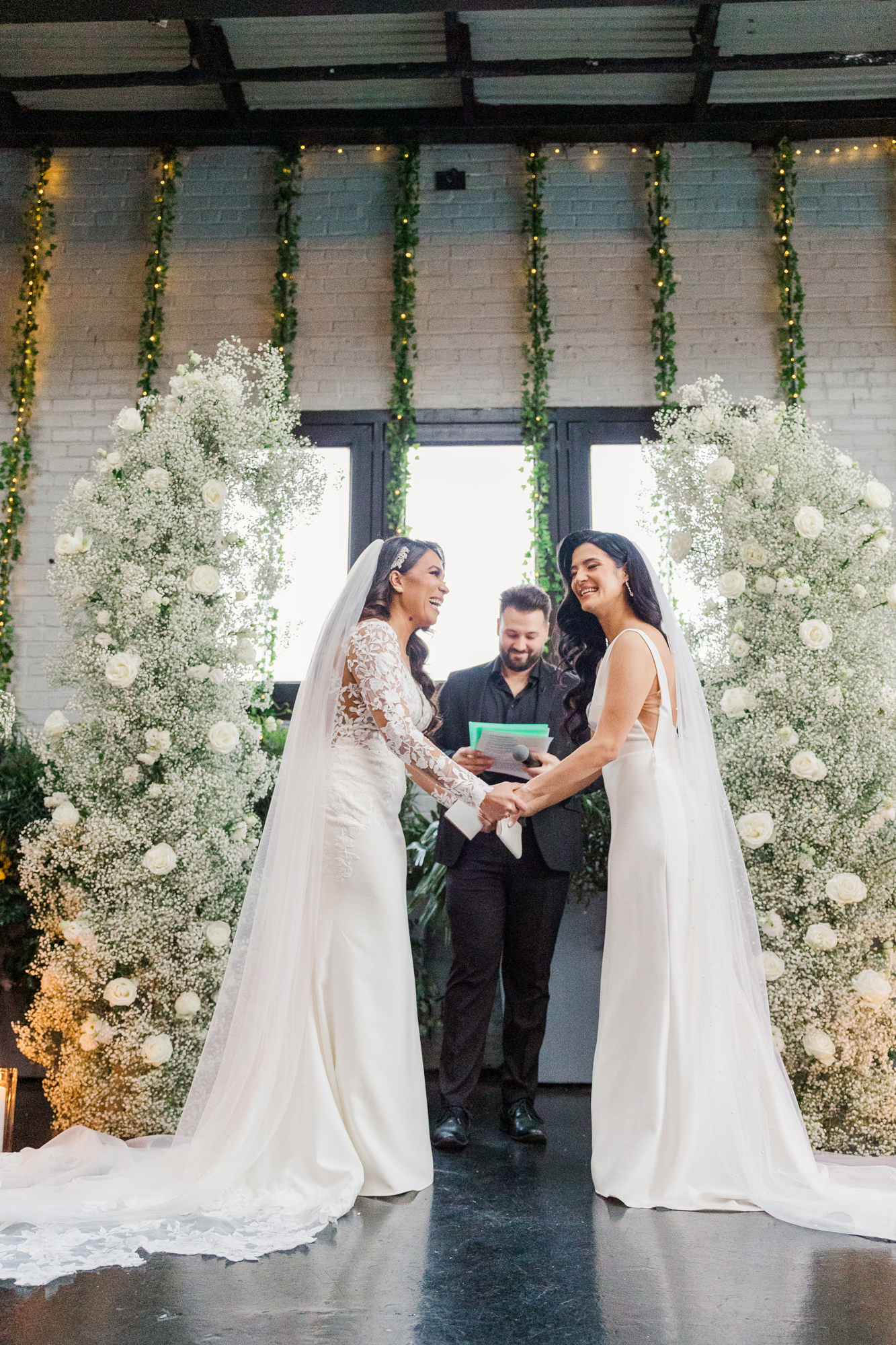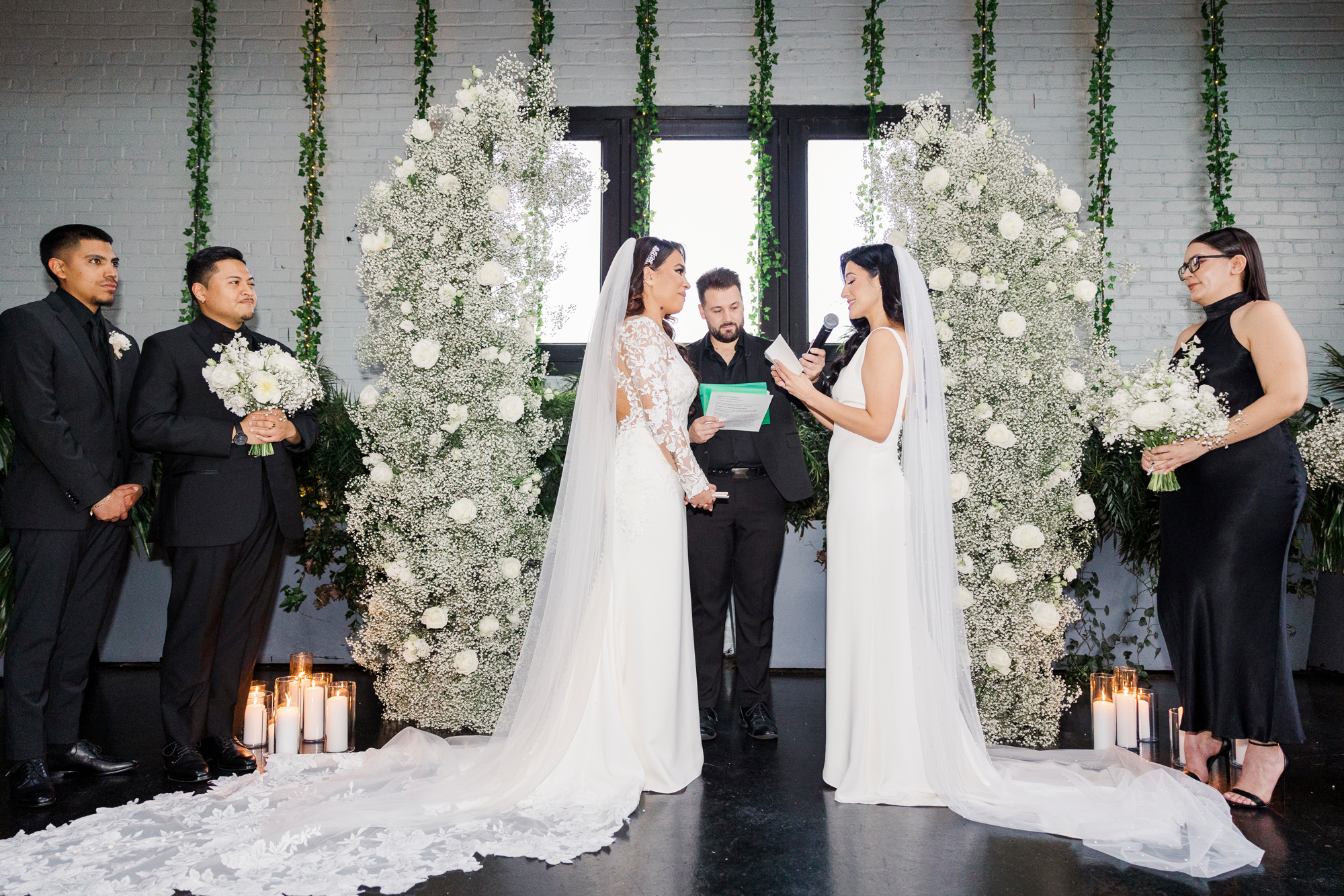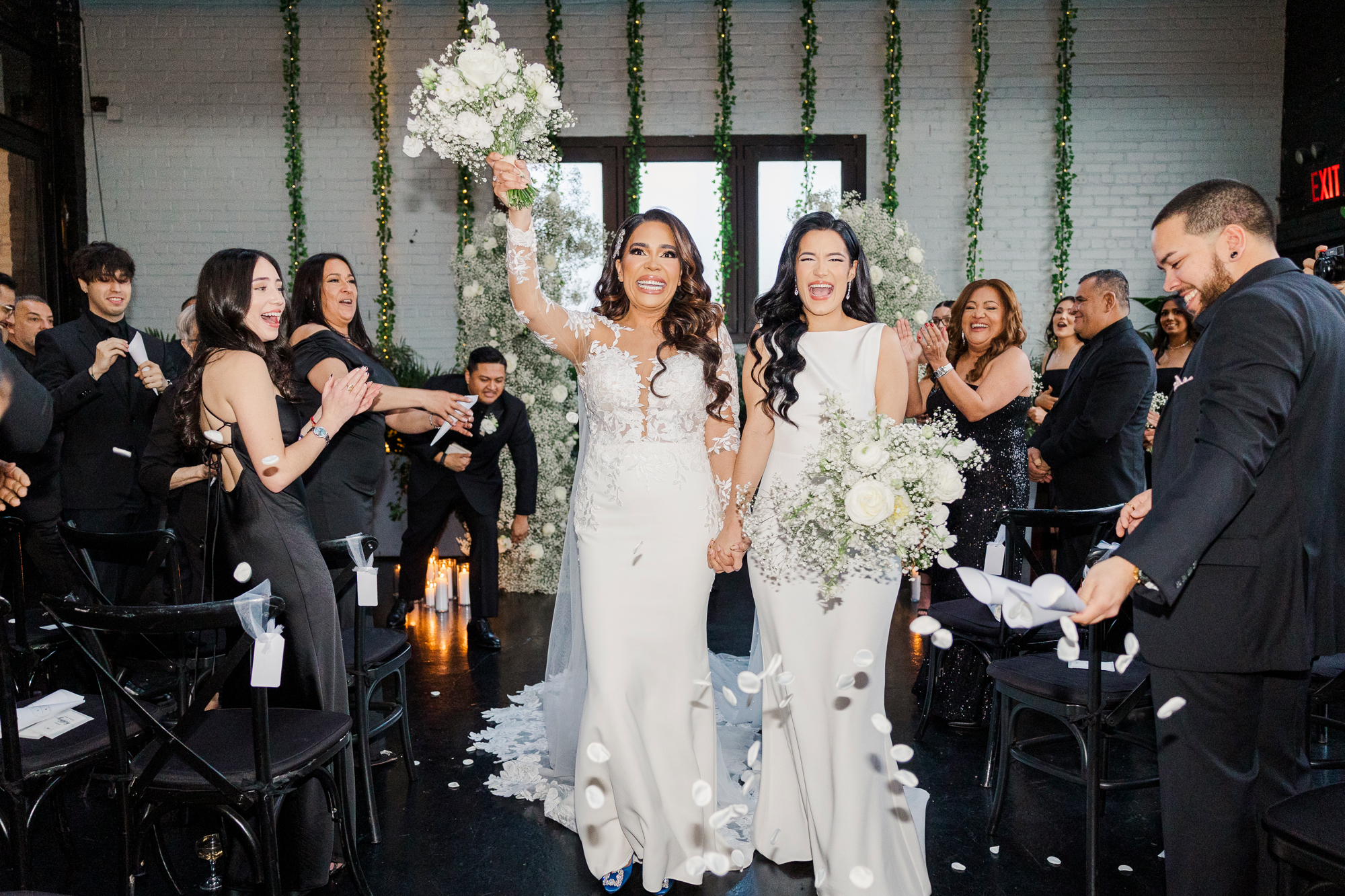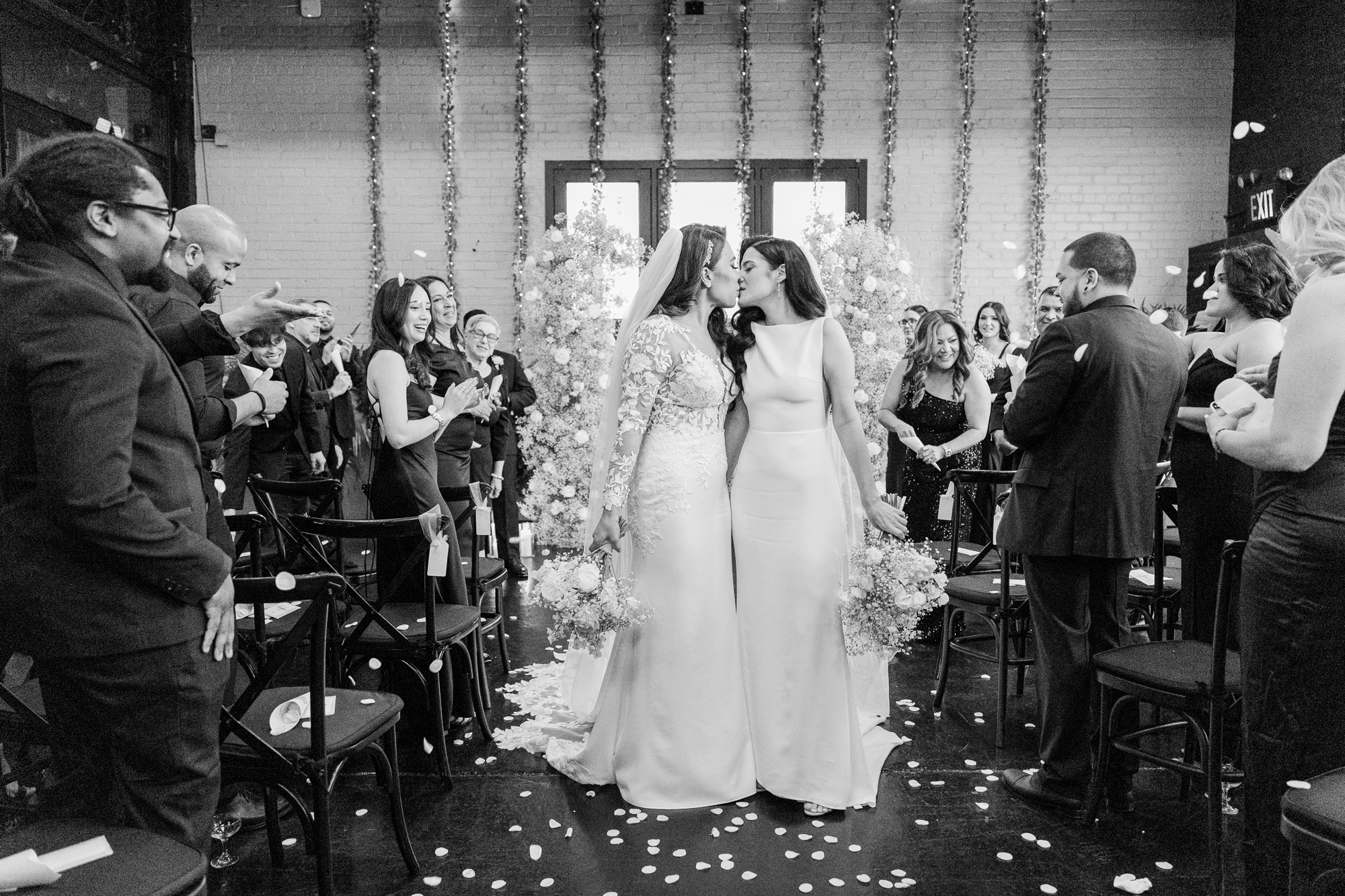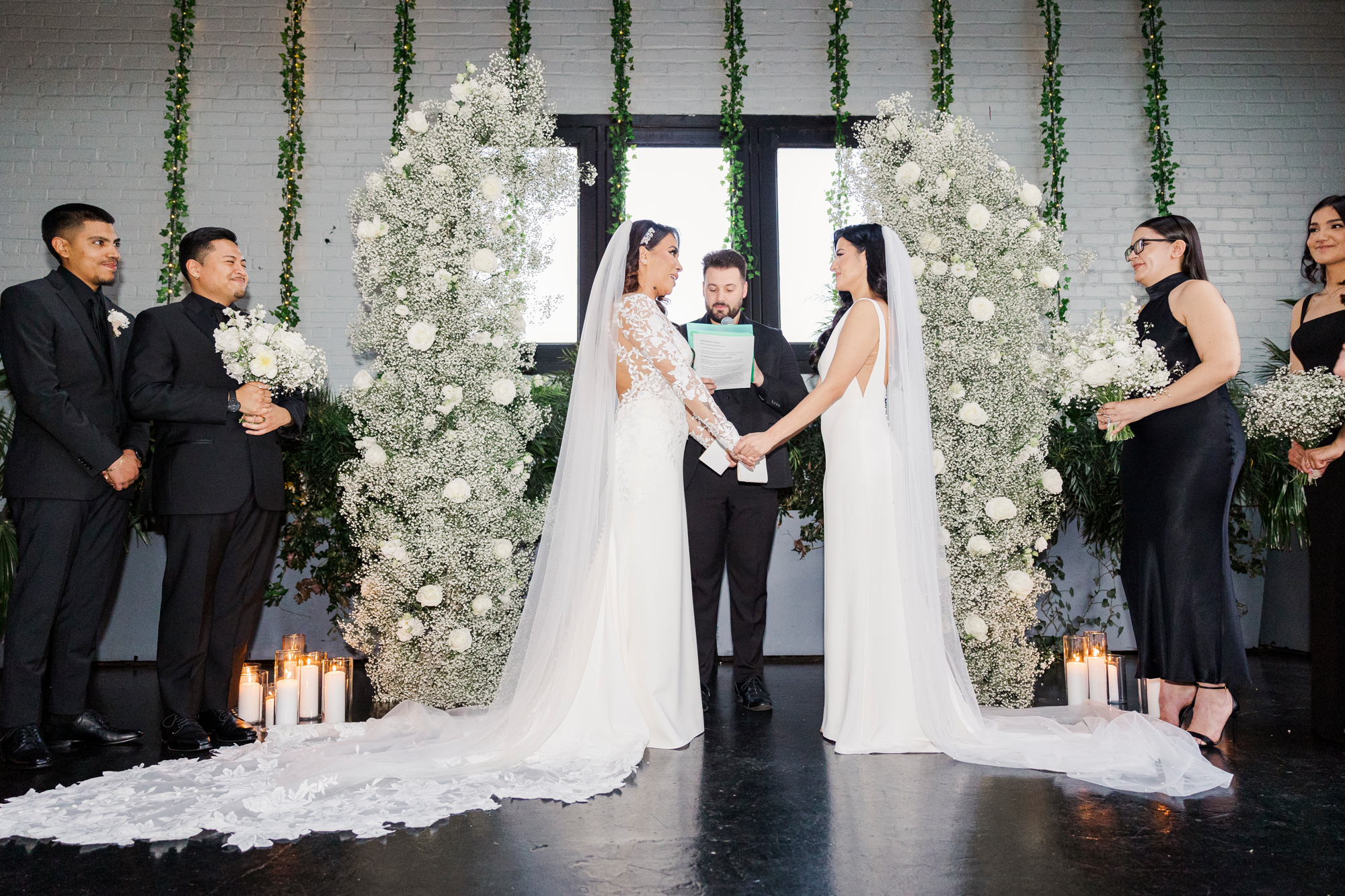 This LGBTQ wedding in Brooklyn featured two gorgeous brides who were so clearly in love. With their dog, Brew, in tow, they had an adorable and intimate wedding day. The two brides were married with an intimate group of family and friends in attendance. This ceremony space is great to accommodate weddings in any season, and you can get great photos indoors for the whole day.