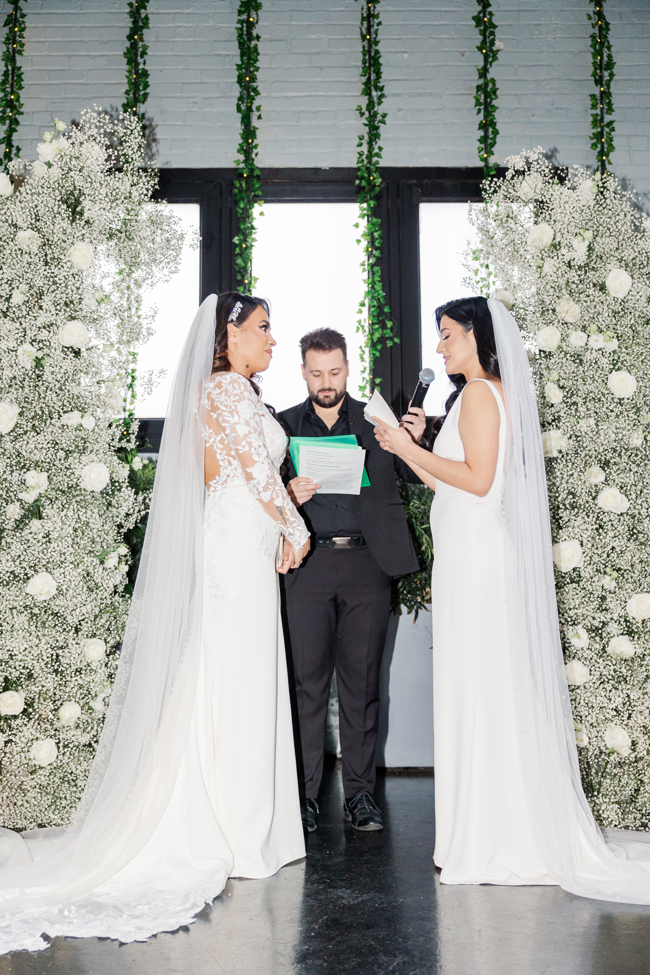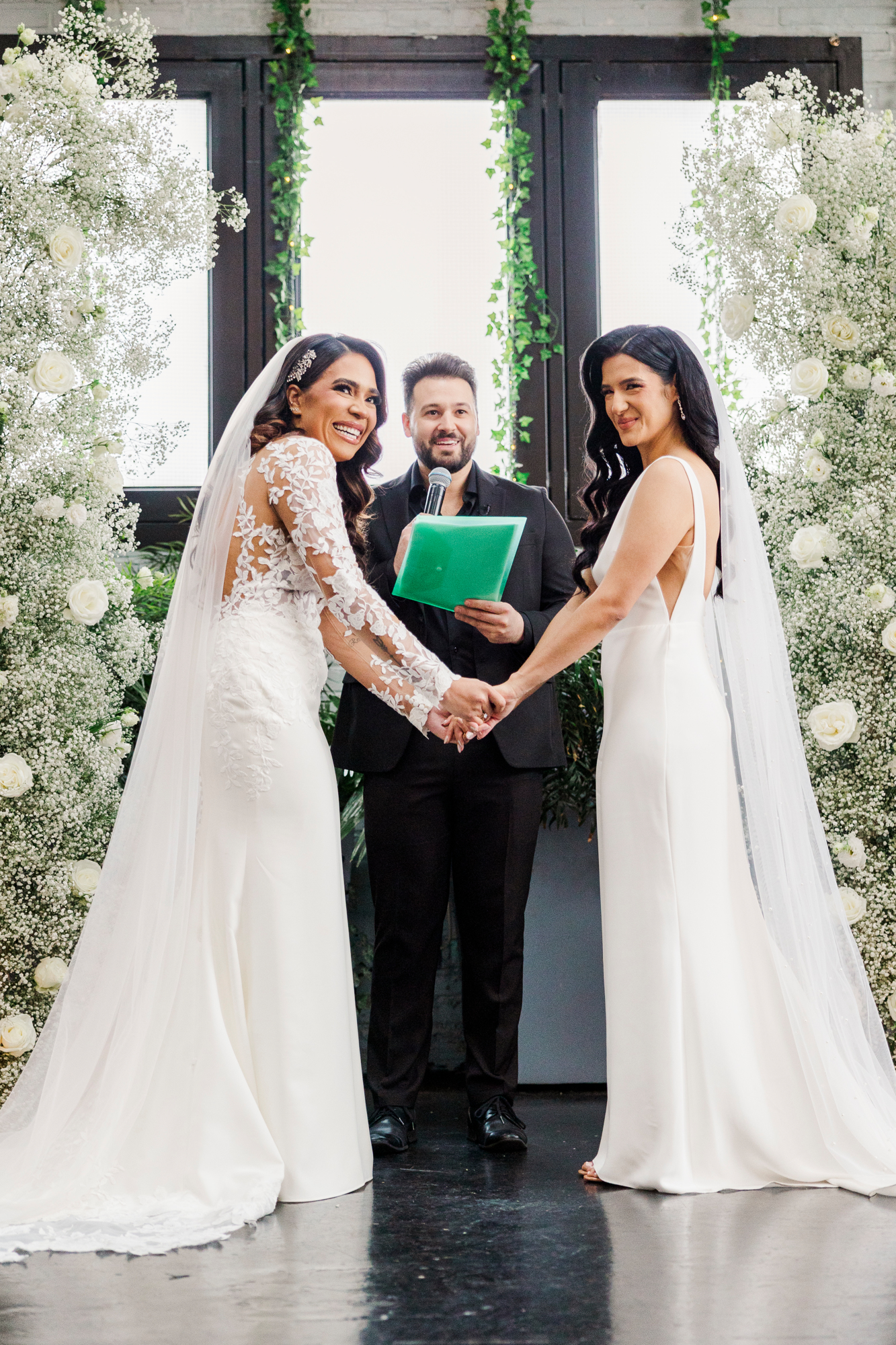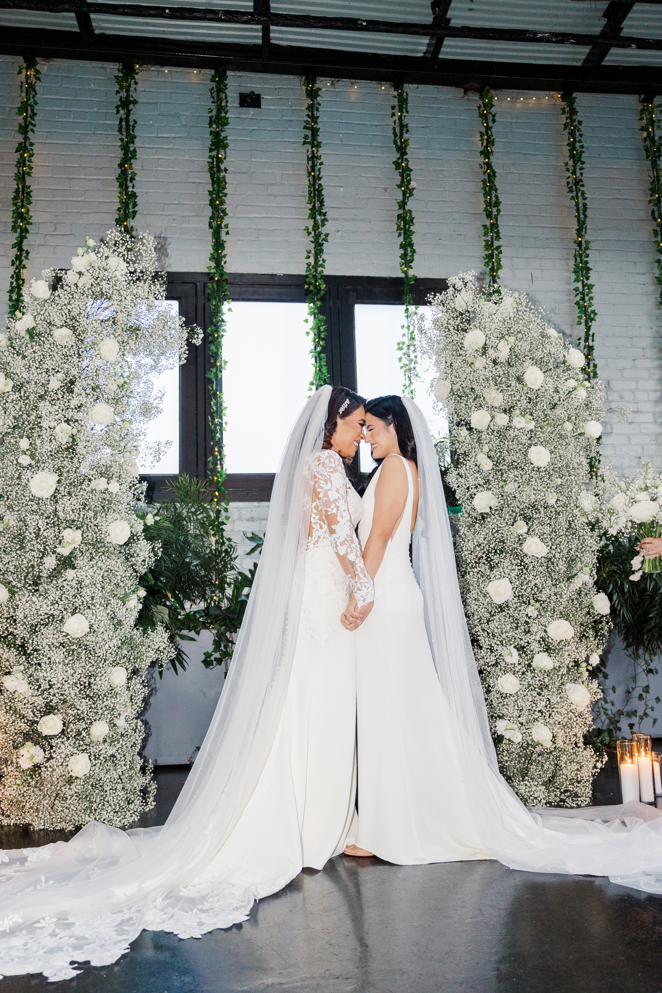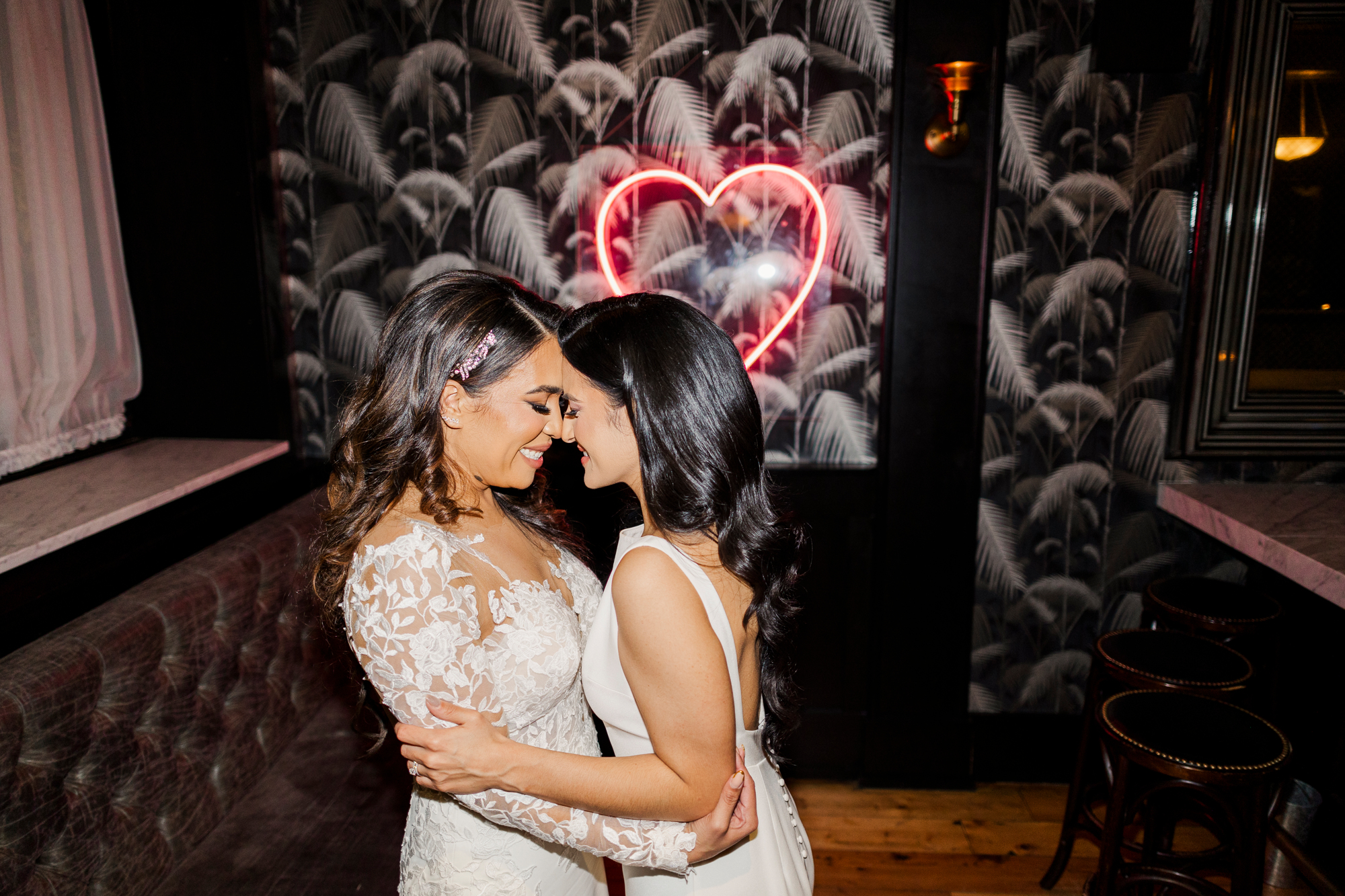 This LGBTQ wedding in Brooklyn featured two gorgeous brides who were so clearly in love. With their dog, Brew, in tow, they had an adorable and intimate wedding day. The two brides were married with an intimate group of family and friends in attendance. This ceremony space is great to accommodate weddings in any season, and you can get great photos indoors for the whole day.
