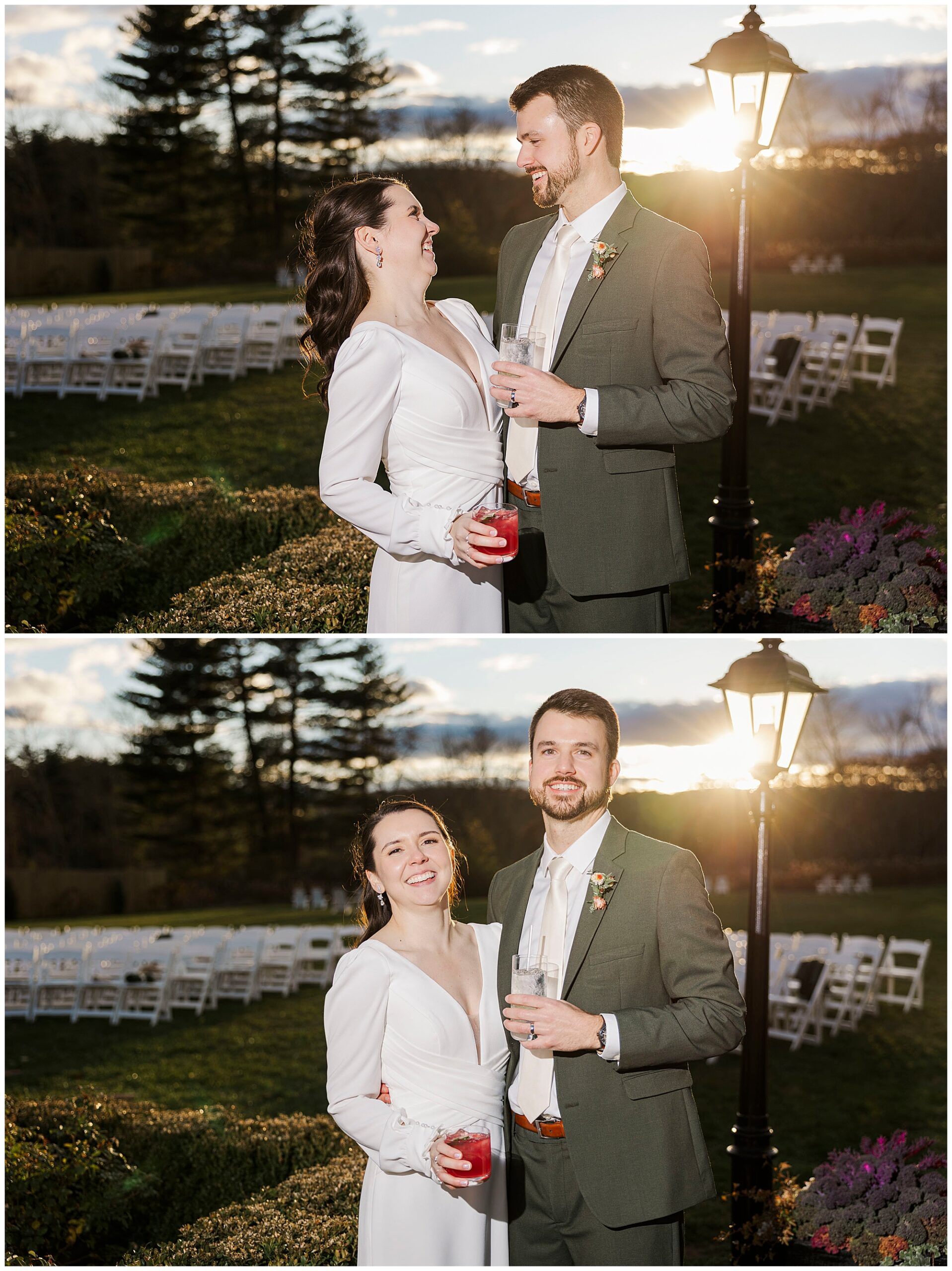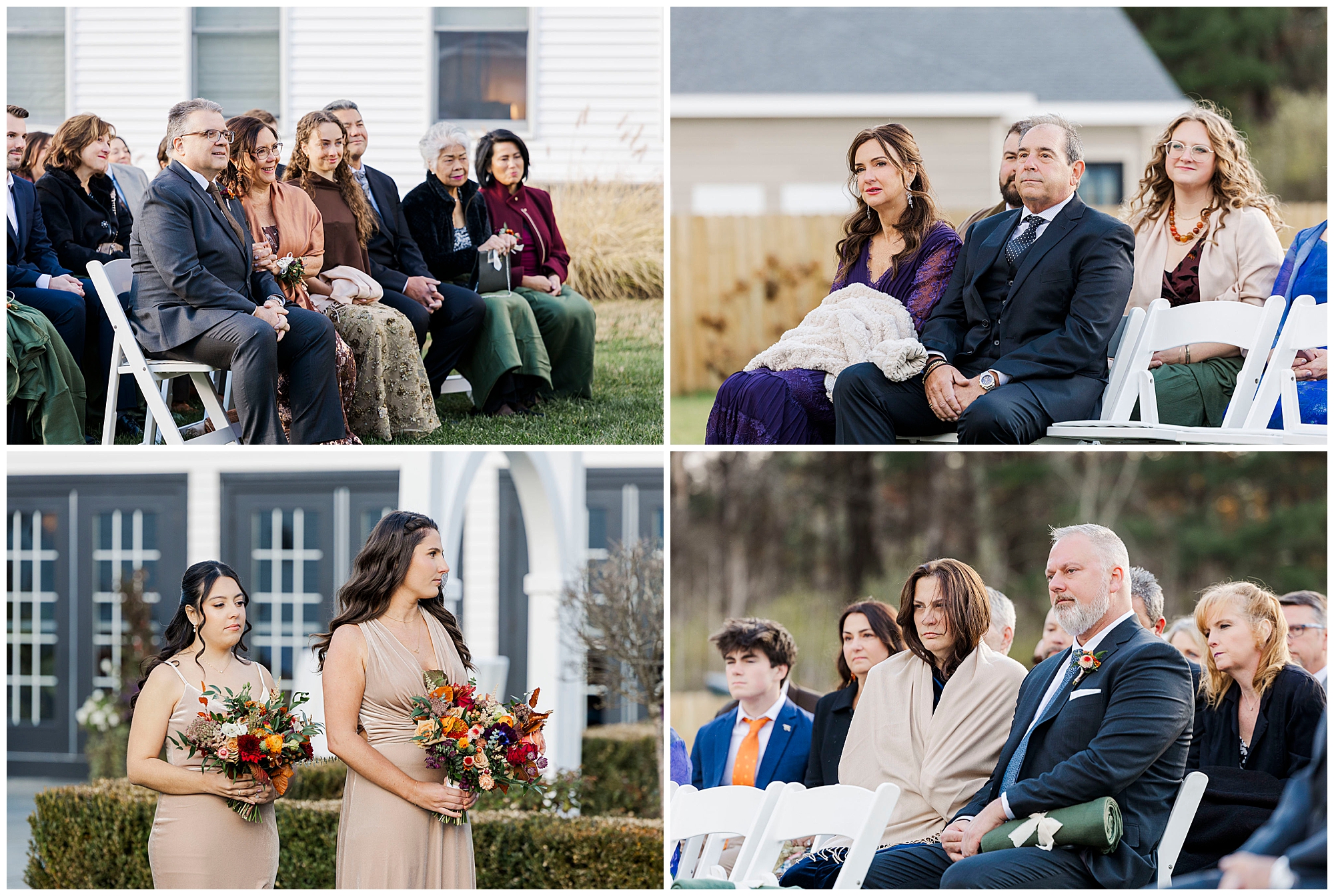 Guests arrive to cozy blankets draped over their chairs, a thoughtful touch for a chilly evening. The ceremony takes place outdoors, with the sun setting just behind the trees. It feels intimate and emotional, filled with tears and quiet joy. As Hudson Valley wedding photographers, we always love when couples embrace the season to make their ceremony feel personal and inviting.