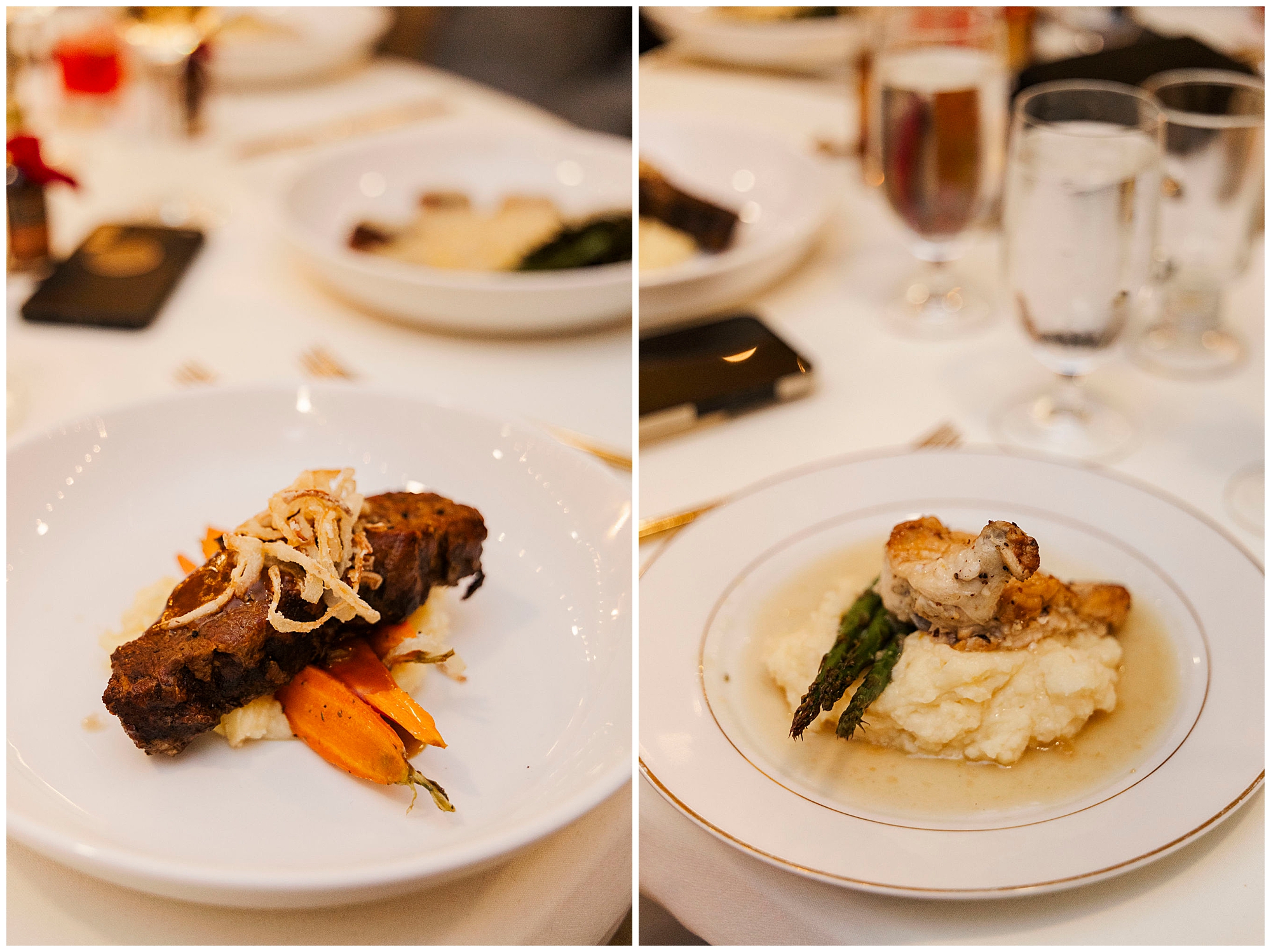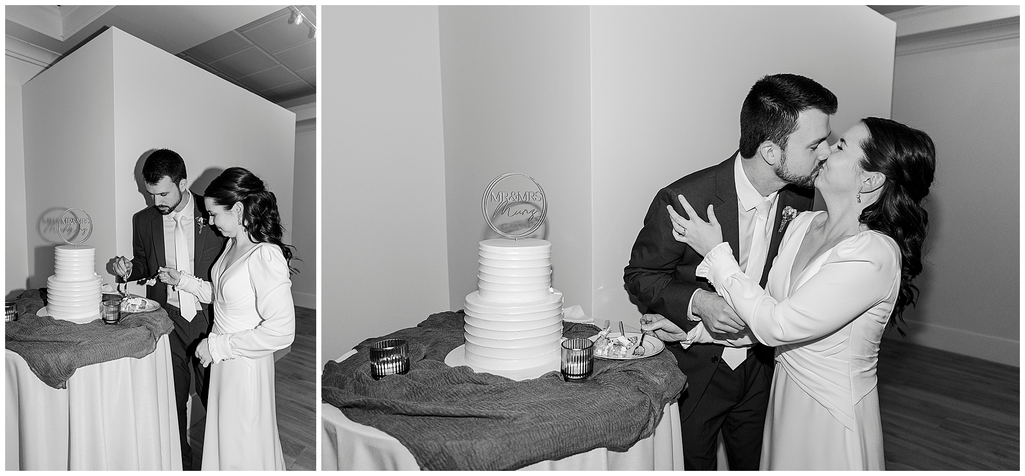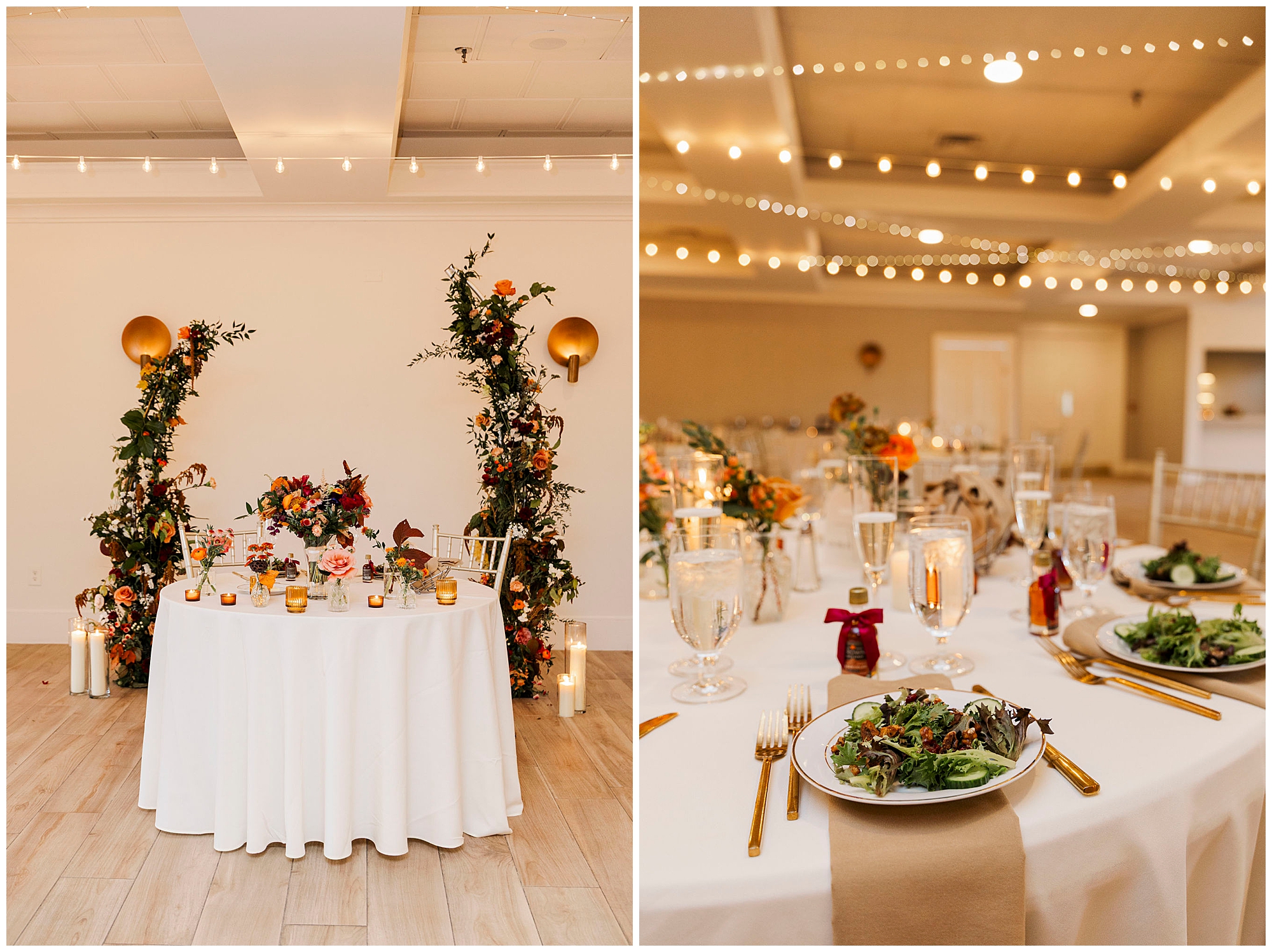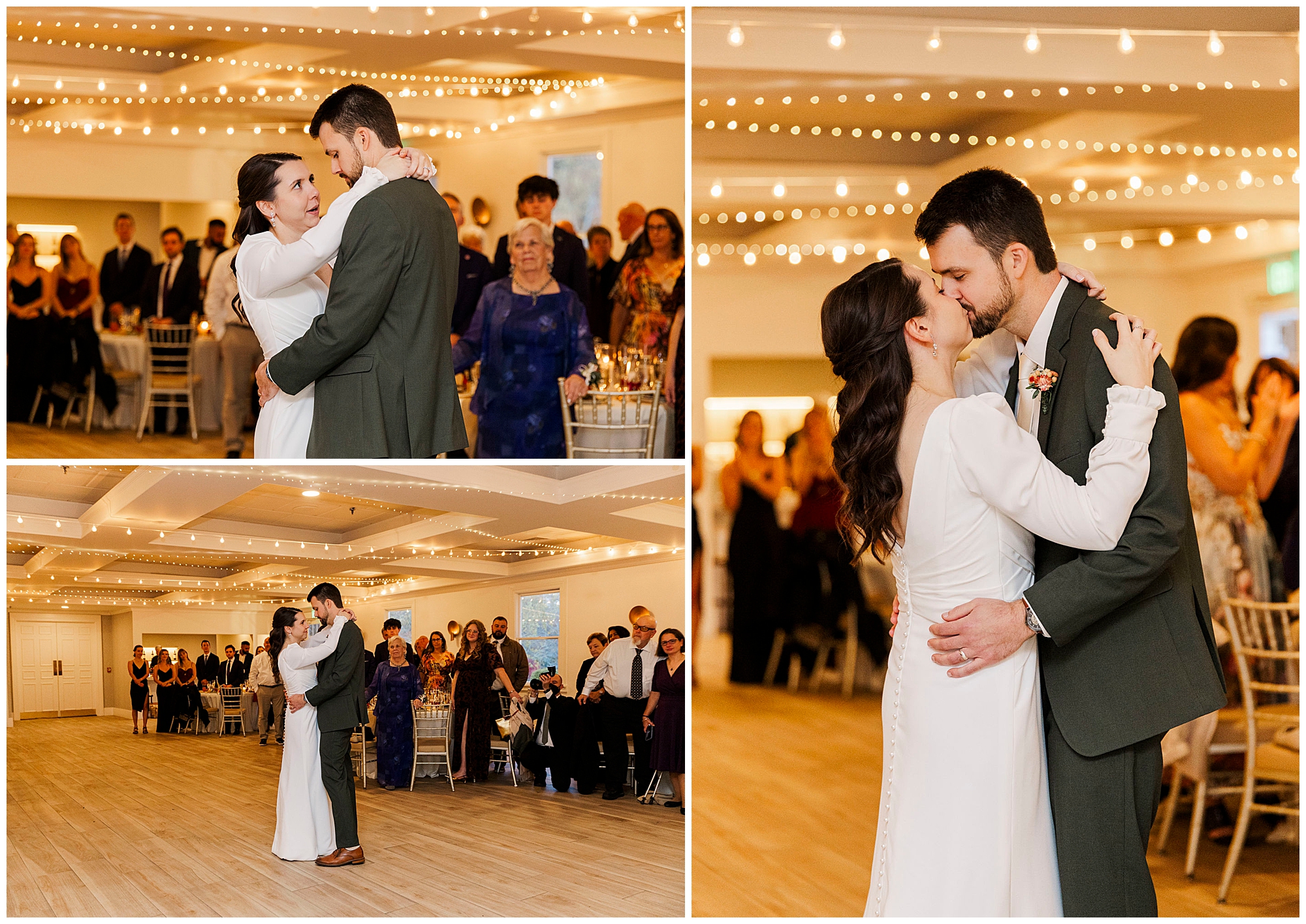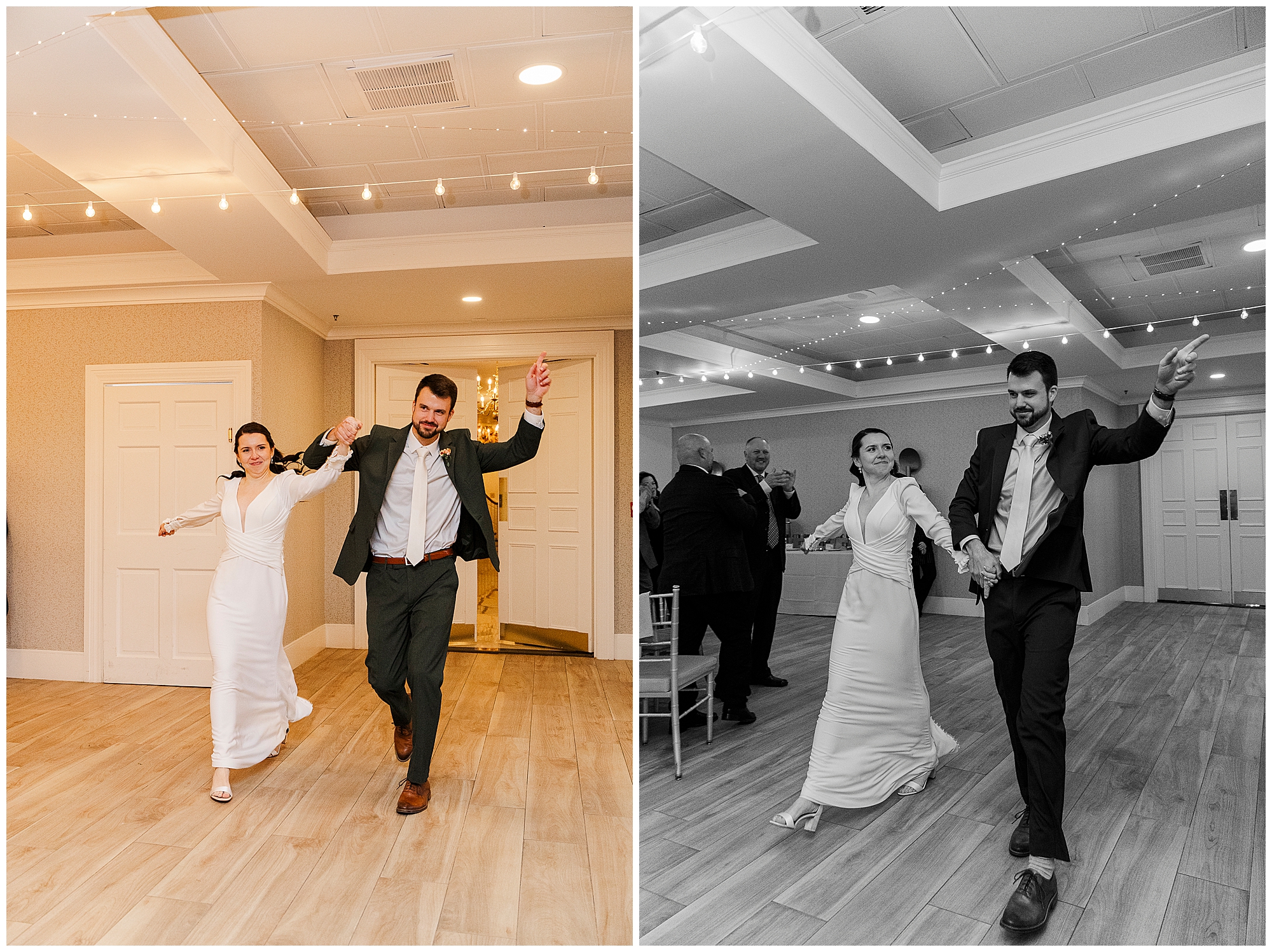 The ballroom’s bistro lights and soft neutral décor set the stage for an intimate celebration. The built-in bar and open layout make the space ideal for mingling and dancing. Jenna and Jordan make their grand entrance surrounded by cheers and applause. Their first dance feels cinematic, with the golden glow of the lights reflecting off the polished tile floors.