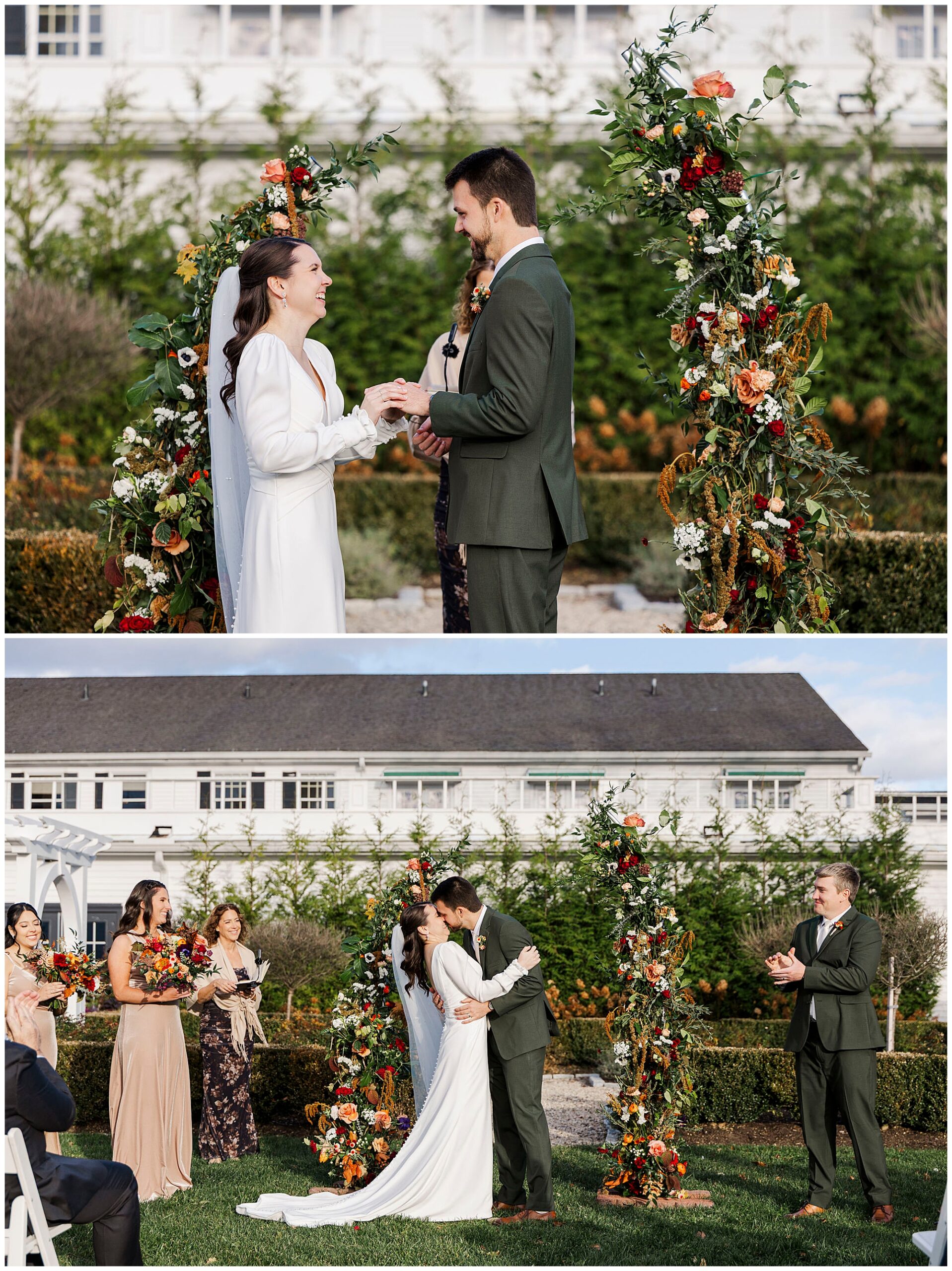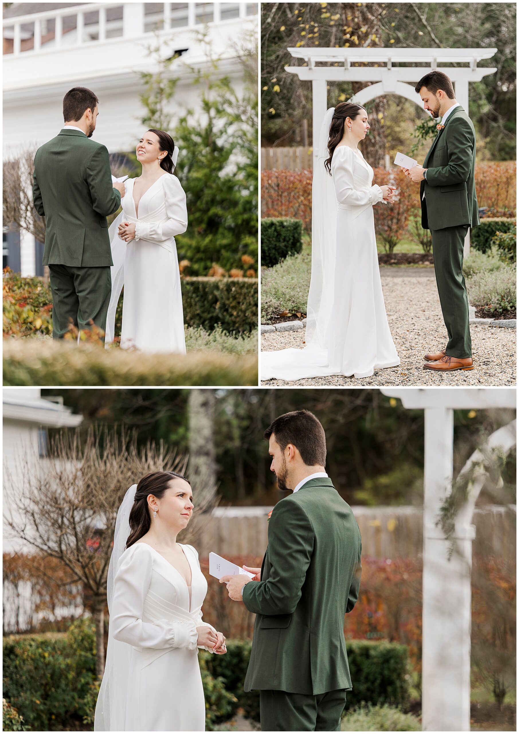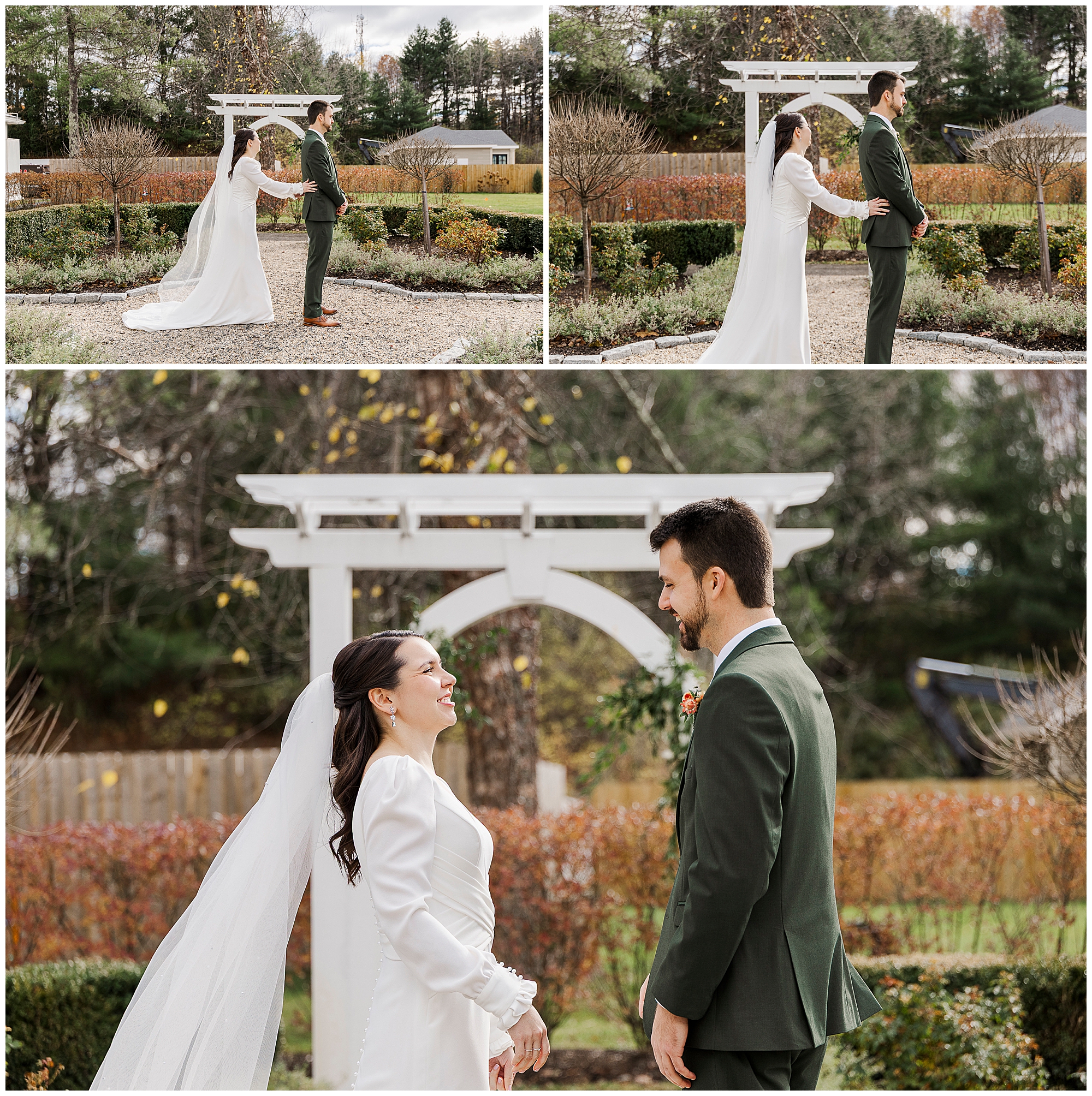 Once they are ready, Jenna and Jordan share a first look in the garden behind the inn. The pergolas and tall grass make a romantic backdrop for this quiet moment. They exchange private vows filled with tears and laughter, creating one of the most heartfelt parts of the day. The fall colors and gentle breeze make it an unforgettable setting for their Litchfield Inn wedding.