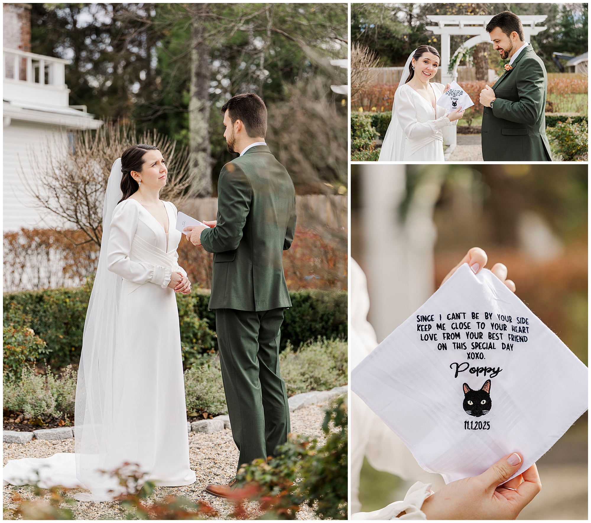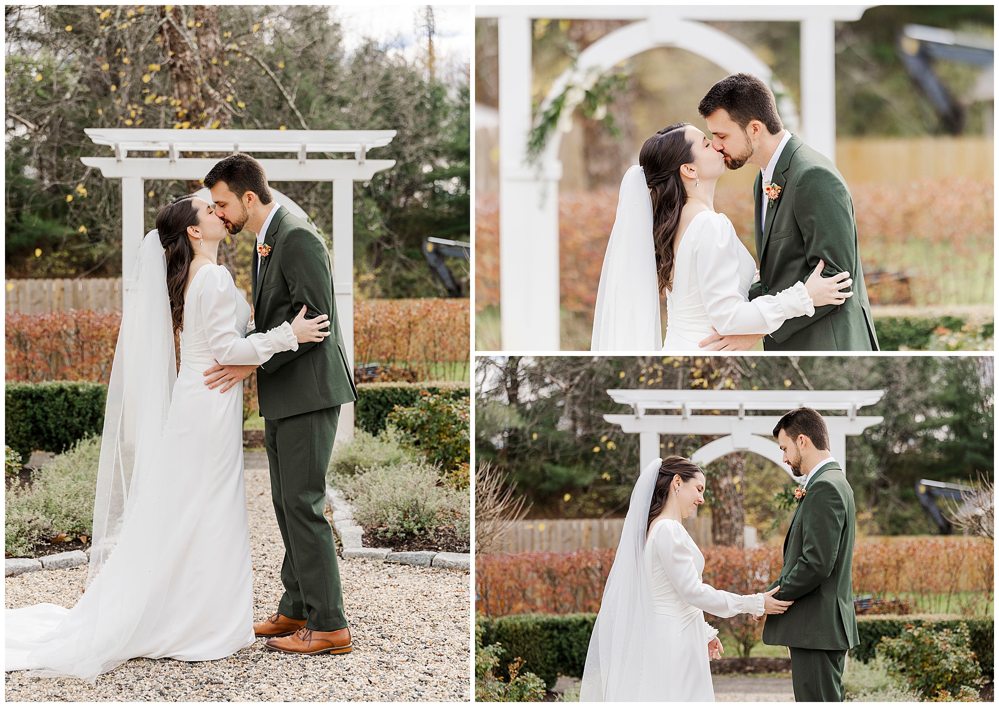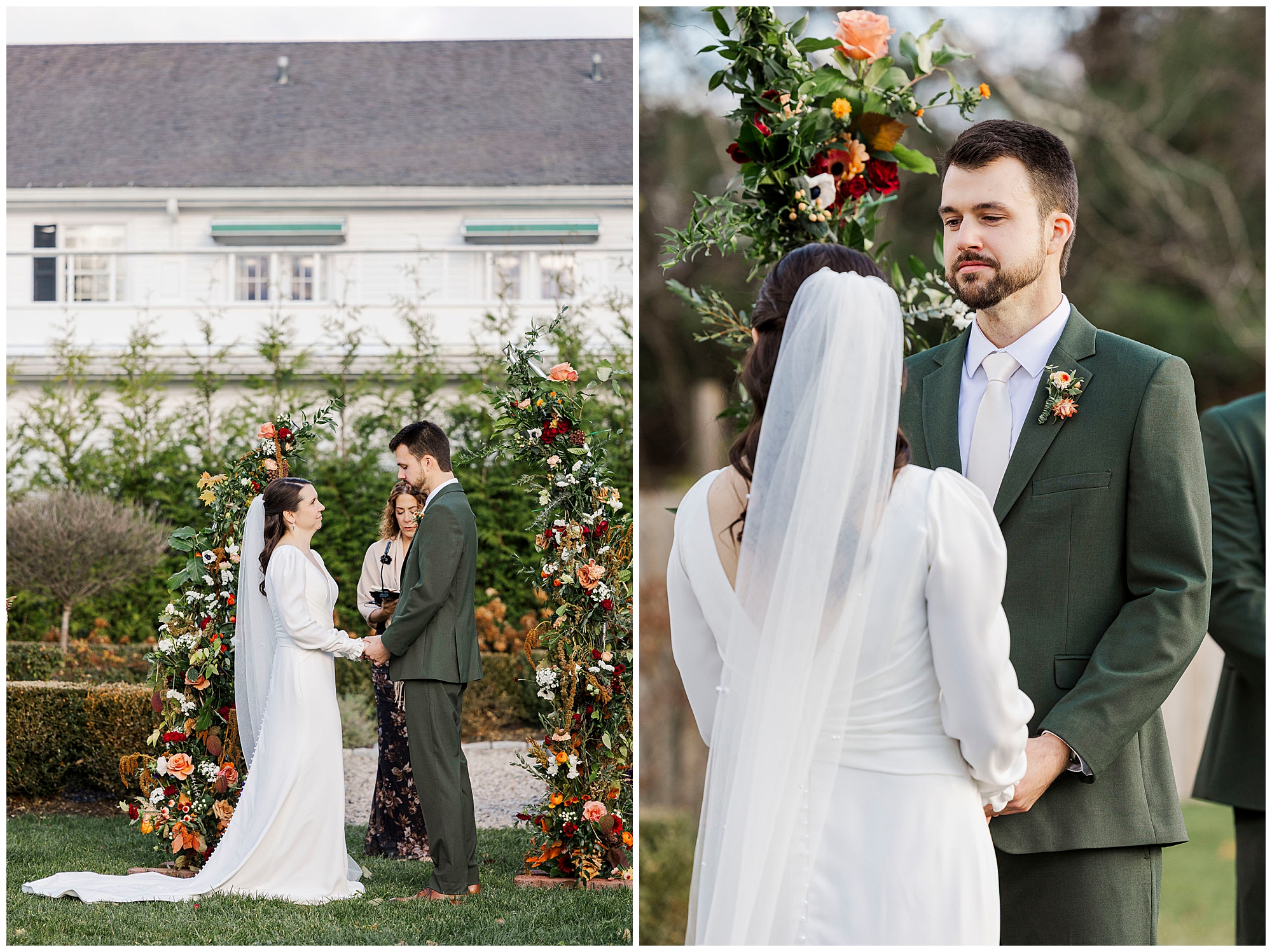 Once they are ready, Jenna and Jordan share a first look in the garden behind the inn. The pergolas and tall grass make a romantic backdrop for this quiet moment. They exchange private vows filled with tears and laughter, creating one of the most heartfelt parts of the day. The fall colors and gentle breeze make it an unforgettable setting for their Litchfield Inn wedding.