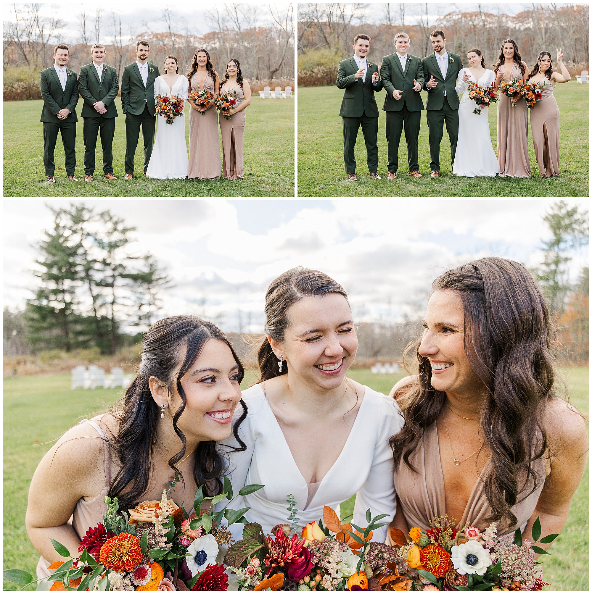 The wedding party joins us for group photos near the back lawn. Everyone is smiling, wrapped in scarves and jackets against the November chill. The laughter and closeness of this group make the photos full of life. Family portraits follow, framed by autumn leaves and soft neutral tones that complement the day beautifully.