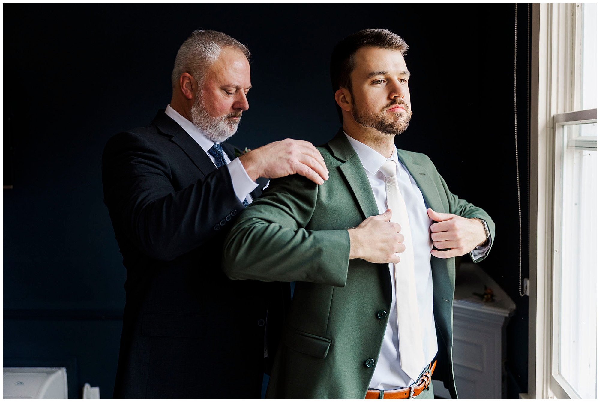 We start the morning in the bright suites at The Litchfield Inn. Jenna gets ready with her bridesmaids, her mom, and Jordan’s mom. The light in her room is soft and airy, perfect for capturing the little details of her gown and accessories. Meanwhile, Jordan gets ready with his groomsmen and dads, surrounded by laughter and quiet anticipation.