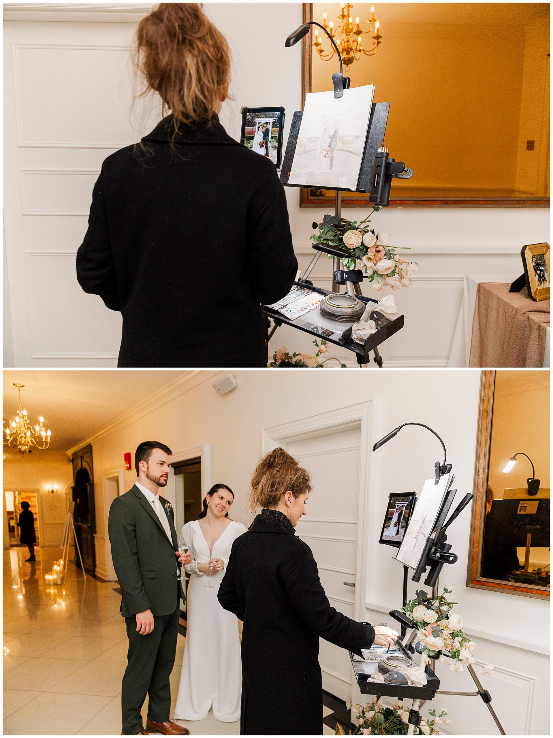 This wedding came together with the help of some truly wonderful vendors. Blush and Brush CT created Jenna’s soft, timeless bridal look, while her gown from White Oak Bridal and designer Hera Couture gave her an effortlessly classic silhouette. The team from Bantam Blooms brought the fall tones to life with lush, textured arrangements. The lighting by AMS DJ and Lighting made the ballroom glow, while Mo Myra Art painted a live wedding scene that captured the heart of the celebration. Guests left with favors from Crown Maple and For Your Party, a sweet way to remember the day. Jordan and his groomsmen wore custom suits from Bogey’s of Danbury, tying the entire look together.