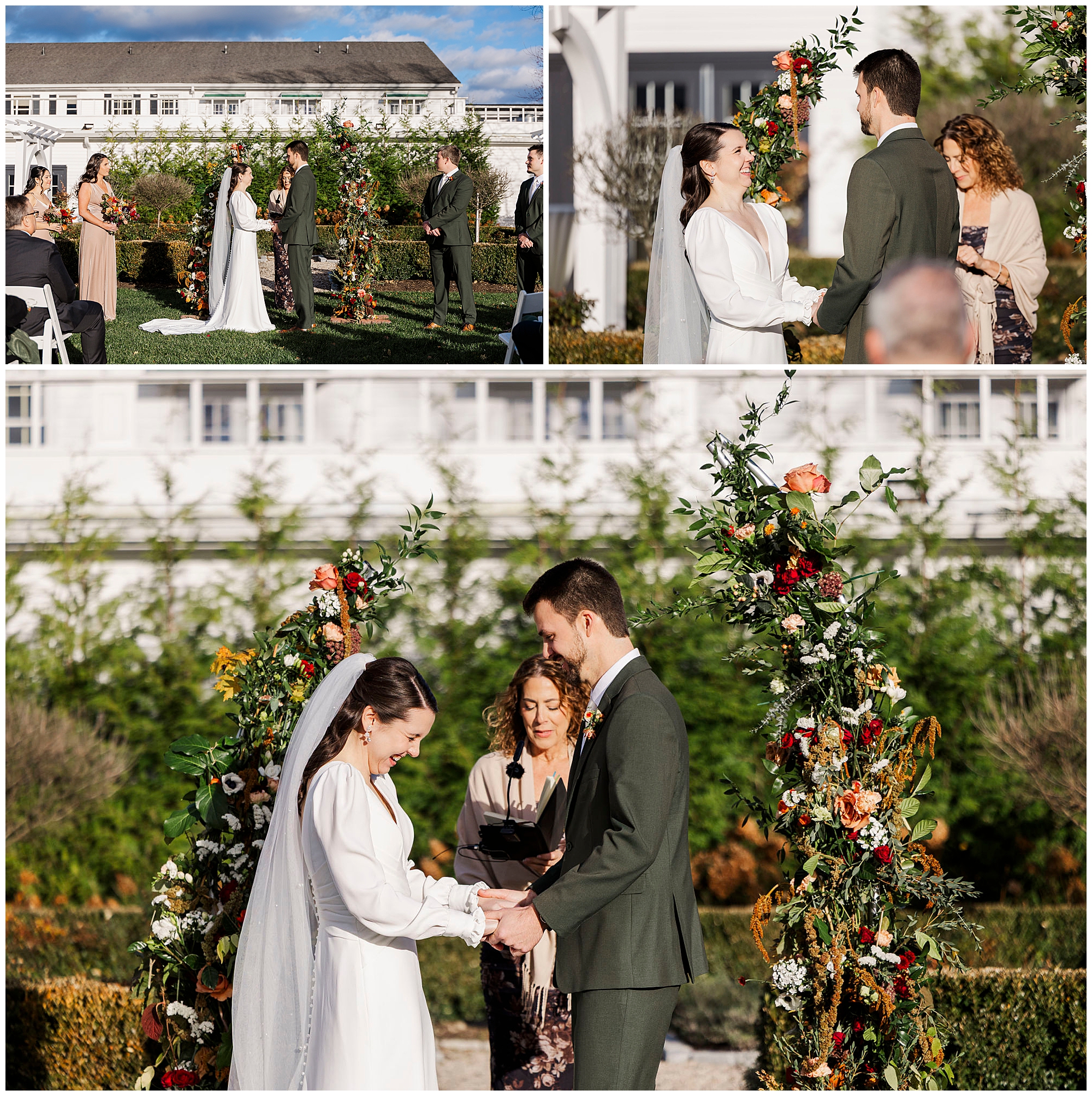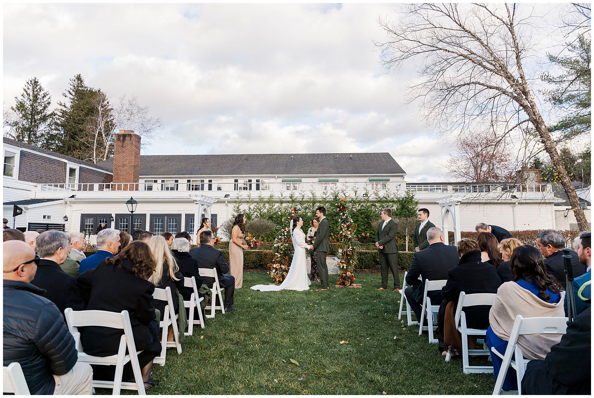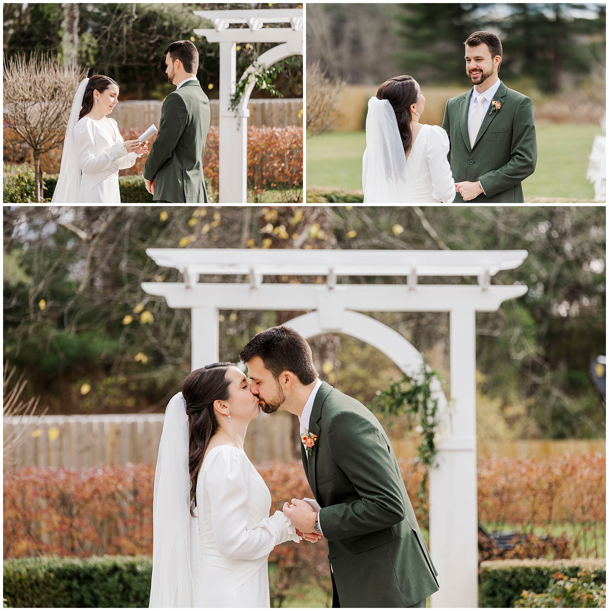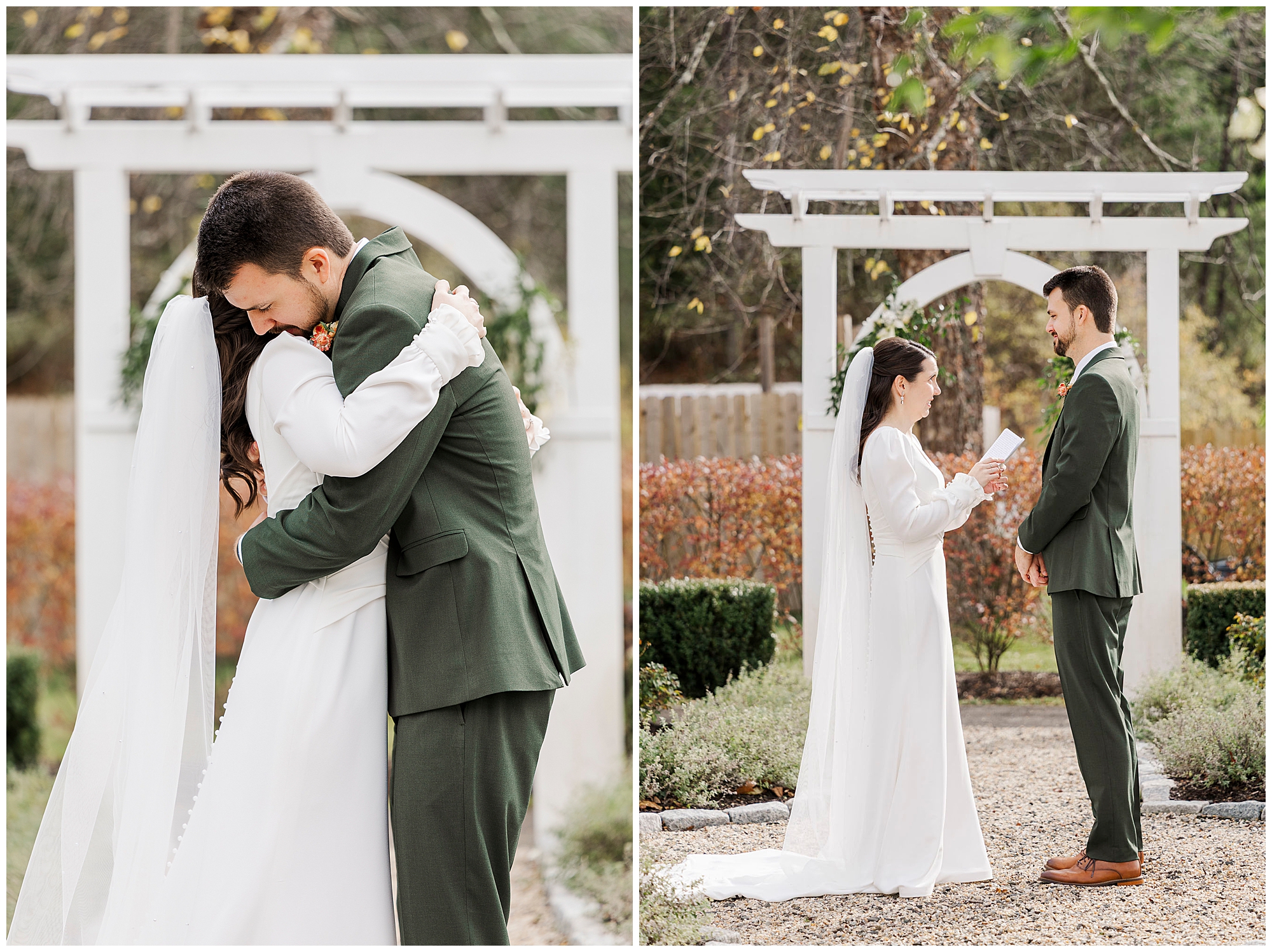 Once they are ready, Jenna and Jordan share a first look in the garden behind the inn. The pergolas and tall grass make a romantic backdrop for this quiet moment. They exchange private vows filled with tears and laughter, creating one of the most heartfelt parts of the day. The fall colors and gentle breeze make it an unforgettable setting for their Litchfield Inn wedding.