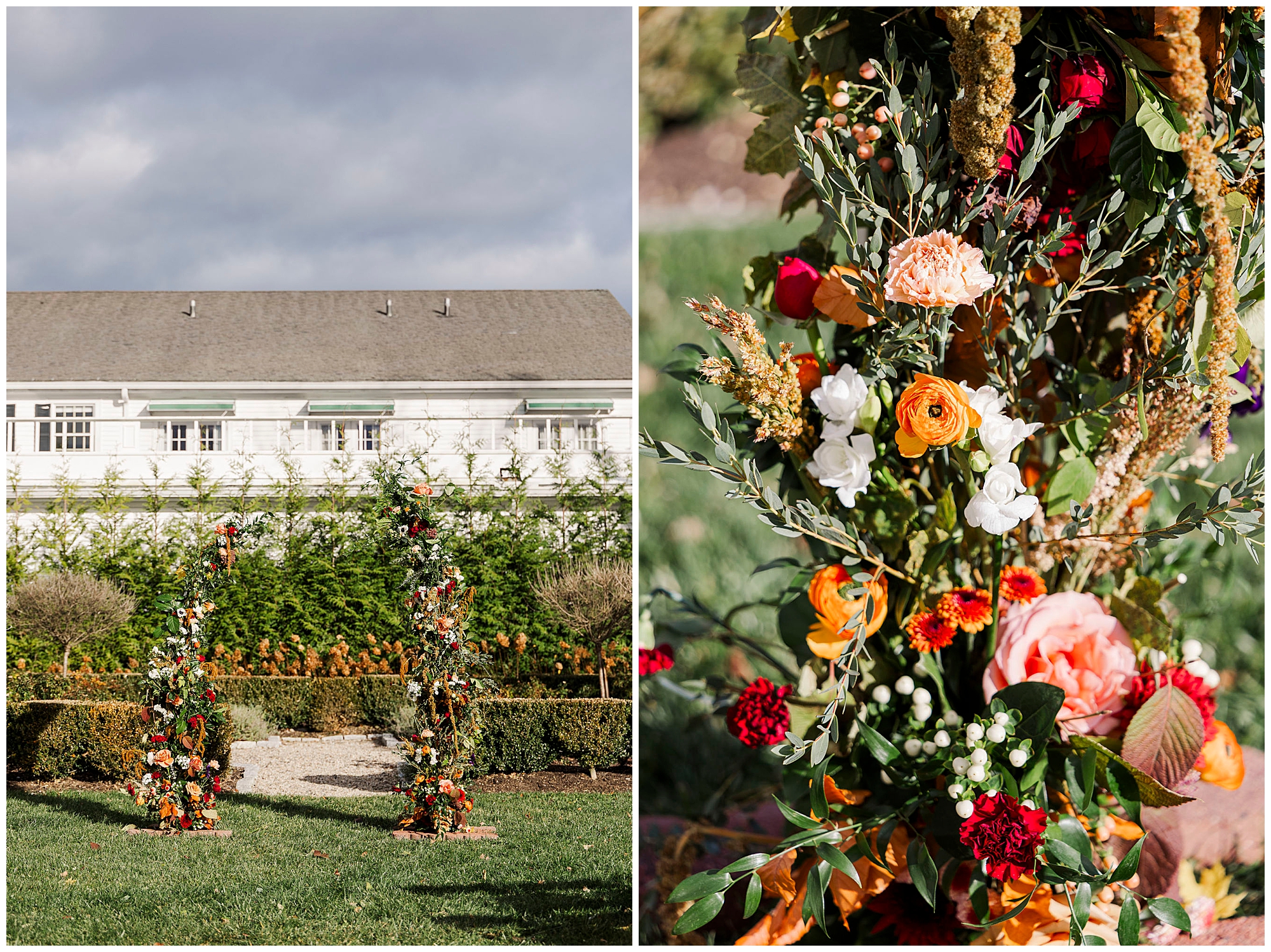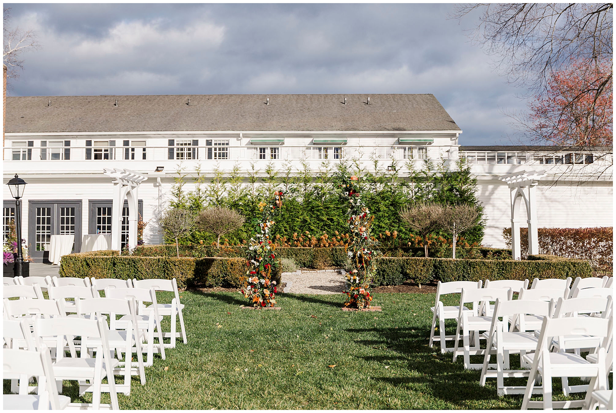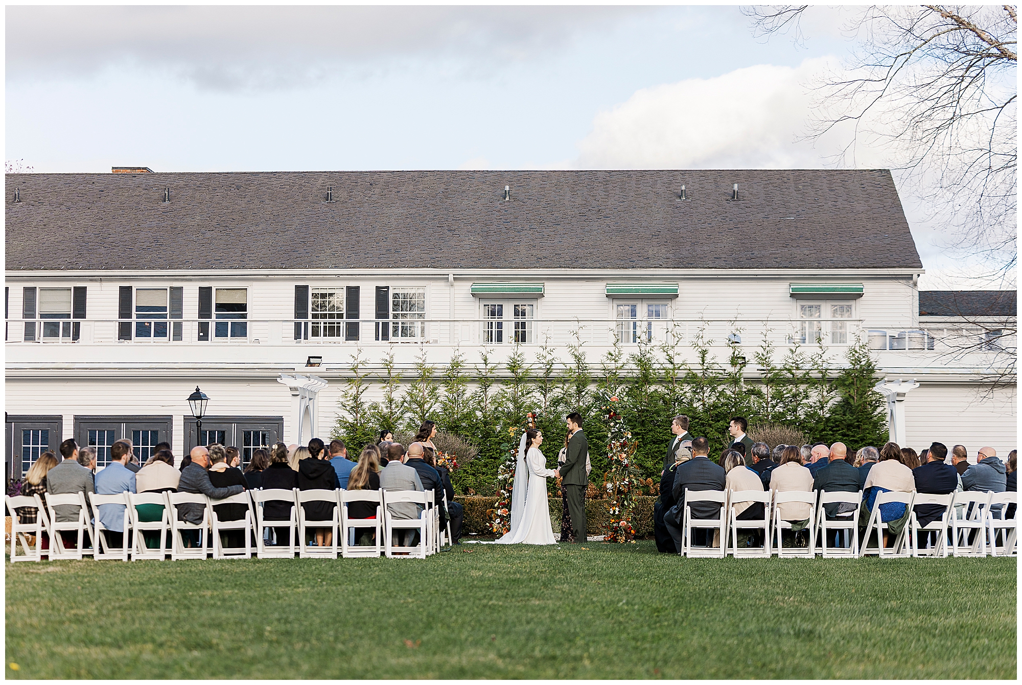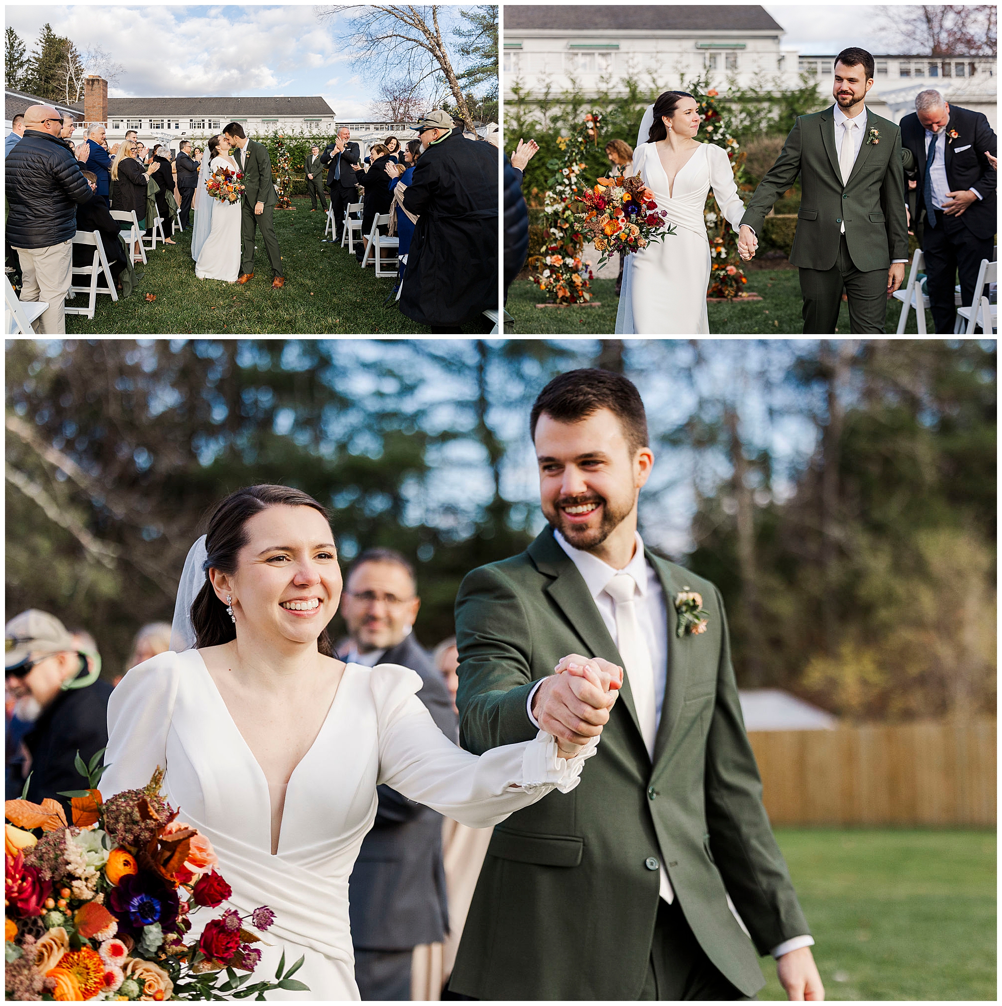 Once they are ready, Jenna and Jordan share a first look in the garden behind the inn. The pergolas and tall grass make a romantic backdrop for this quiet moment. They exchange private vows filled with tears and laughter, creating one of the most heartfelt parts of the day. The fall colors and gentle breeze make it an unforgettable setting for their Litchfield Inn wedding.