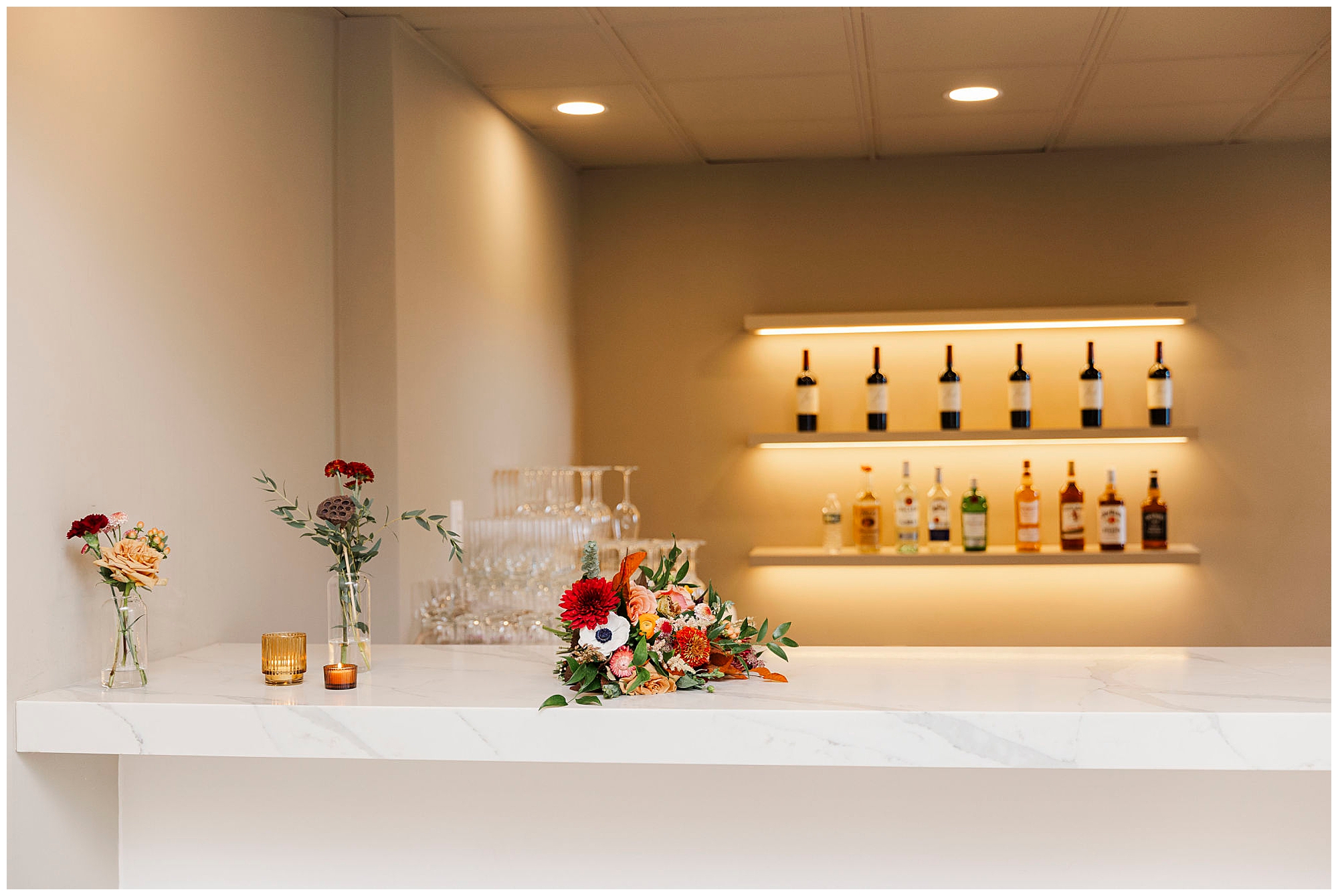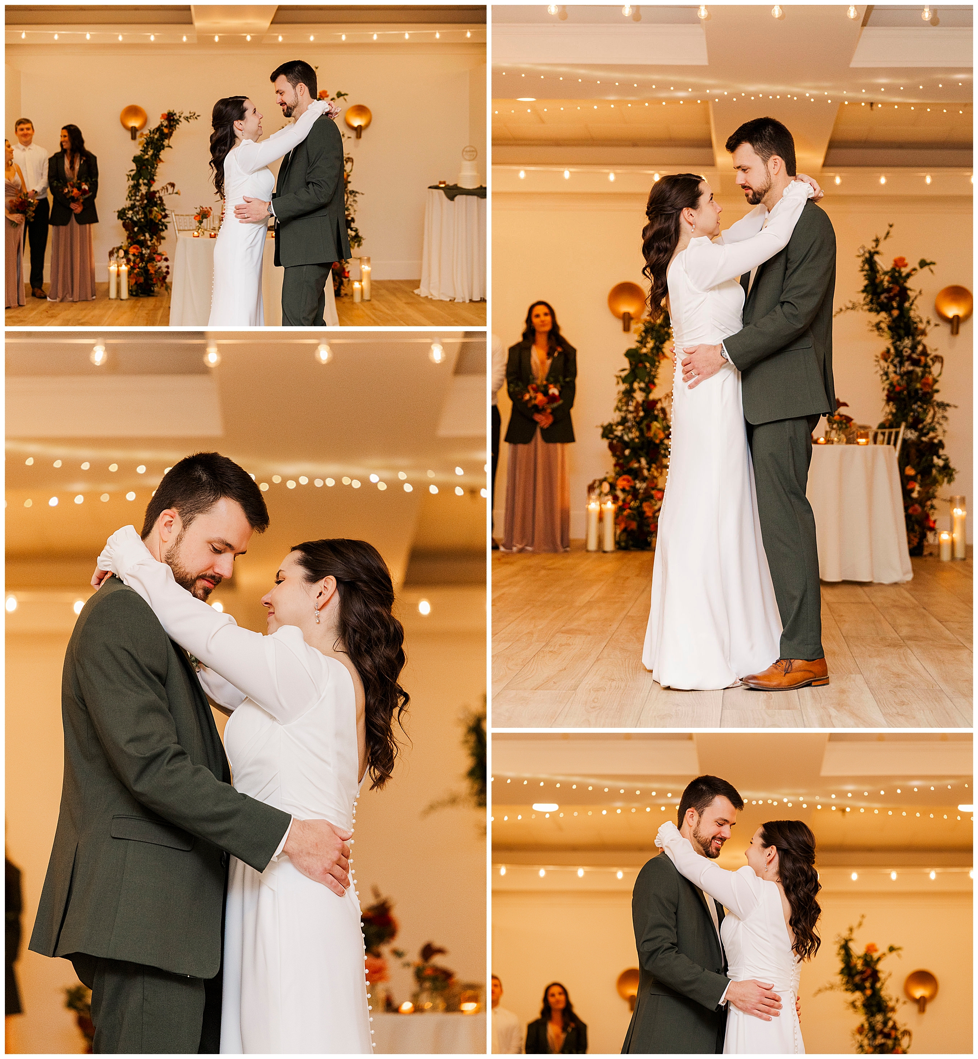 The ballroom’s bistro lights and soft neutral décor set the stage for an intimate celebration. The built-in bar and open layout make the space ideal for mingling and dancing. Jenna and Jordan make their grand entrance surrounded by cheers and applause. Their first dance feels cinematic, with the golden glow of the lights reflecting off the polished tile floors.