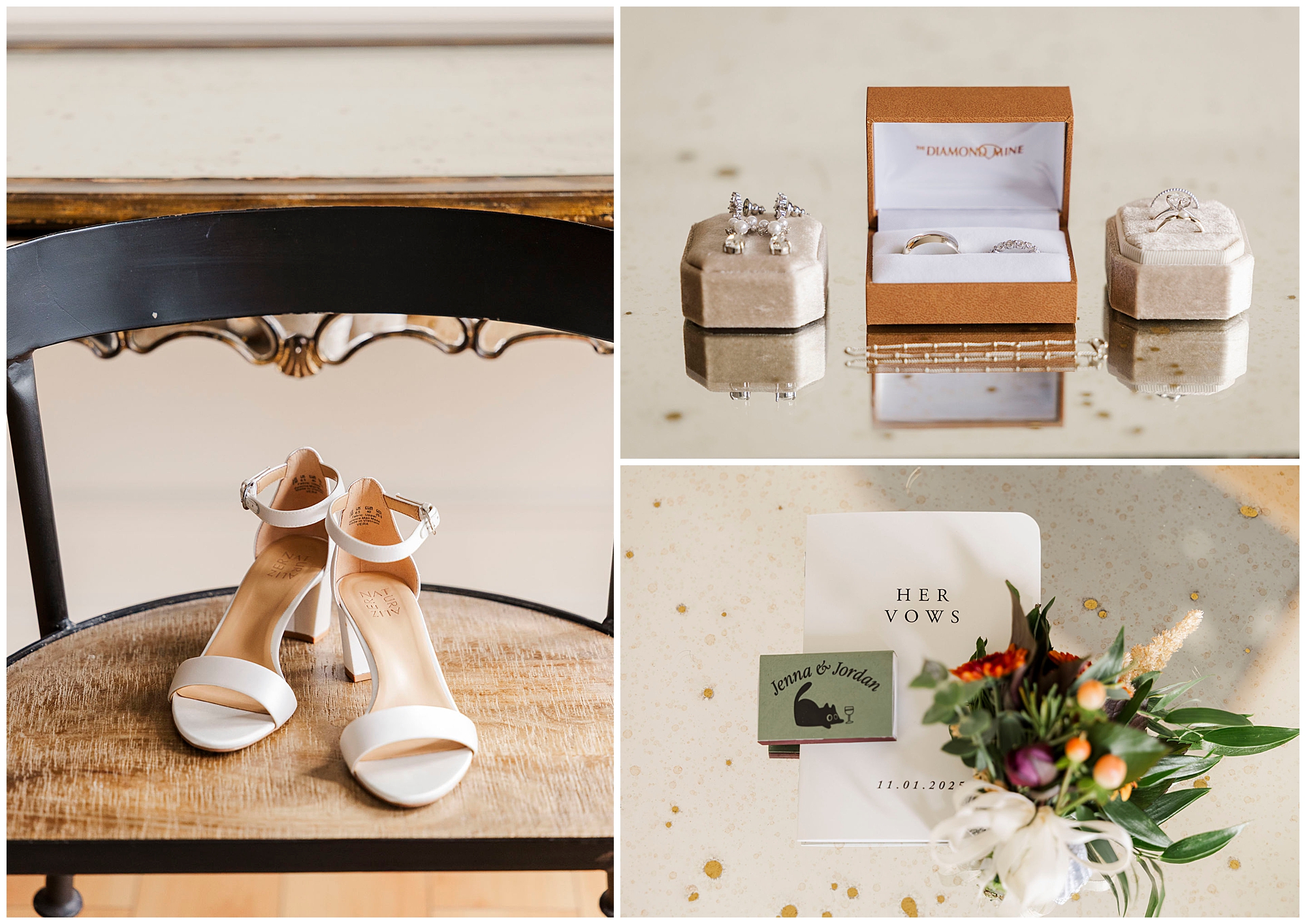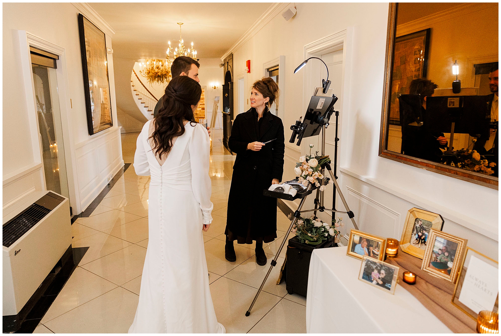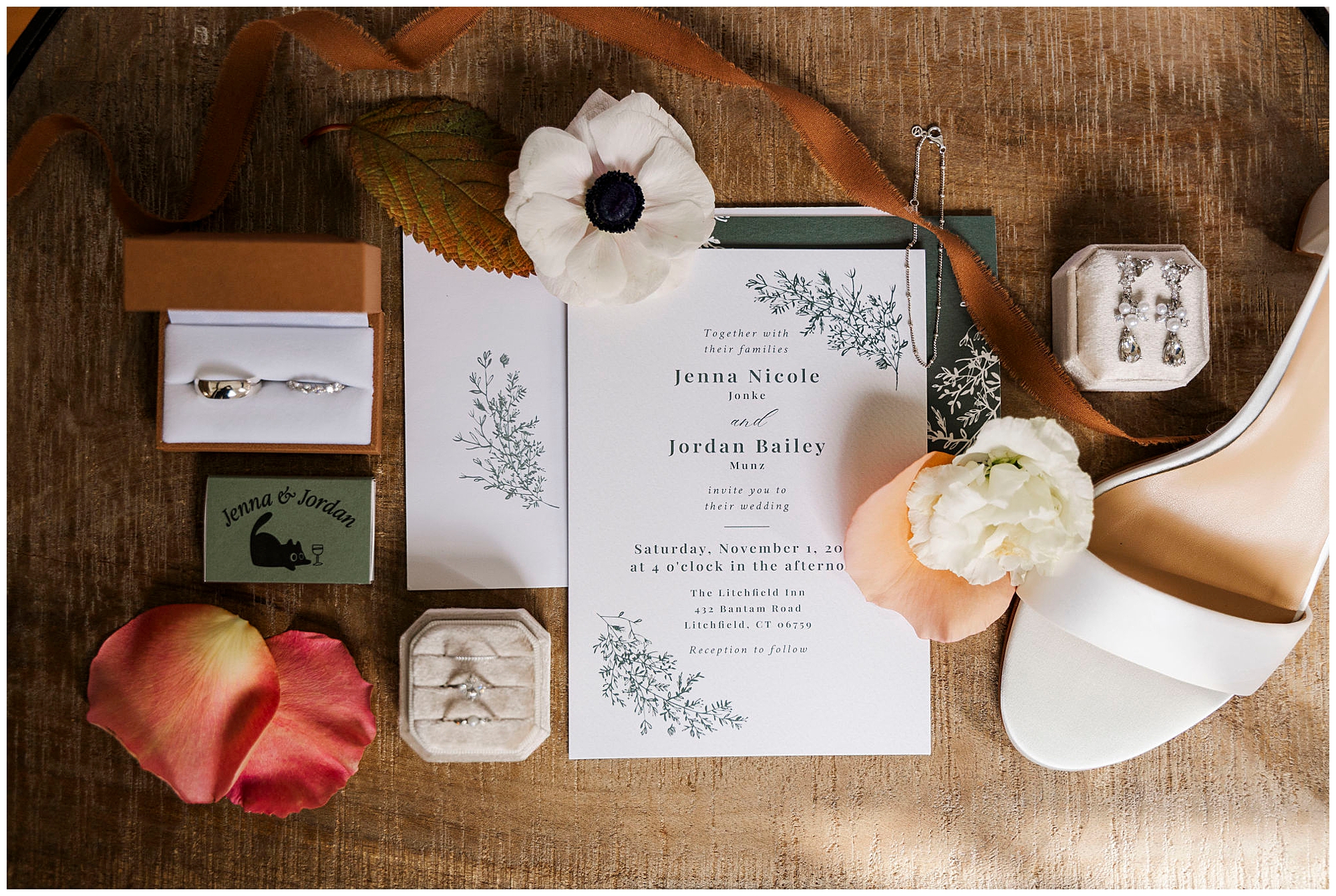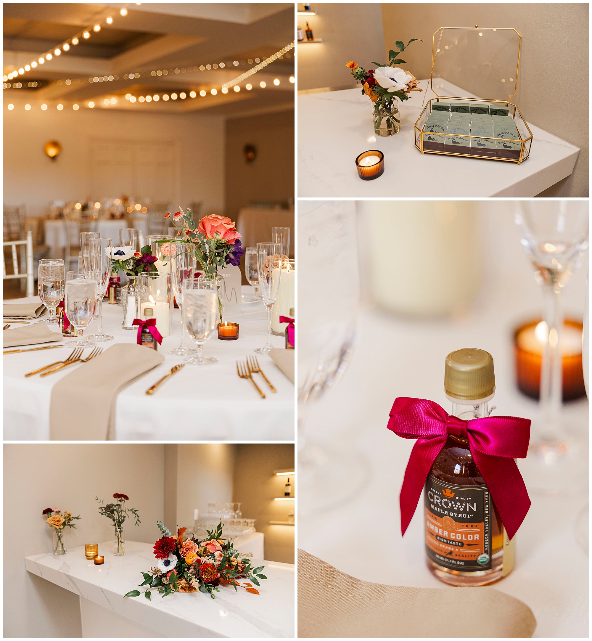 This wedding came together with the help of some truly wonderful vendors. Blush and Brush CT created Jenna’s soft, timeless bridal look, while her gown from White Oak Bridal and designer Hera Couture gave her an effortlessly classic silhouette. The team from Bantam Blooms brought the fall tones to life with lush, textured arrangements. The lighting by AMS DJ and Lighting made the ballroom glow, while Mo Myra Art painted a live wedding scene that captured the heart of the celebration. Guests left with favors from Crown Maple and For Your Party, a sweet way to remember the day. Jordan and his groomsmen wore custom suits from Bogey’s of Danbury, tying the entire look together.