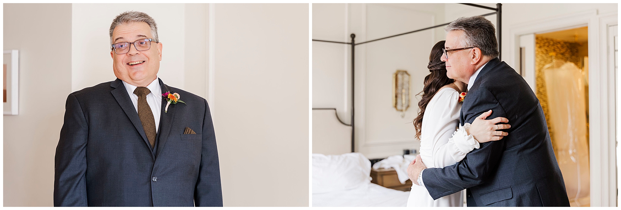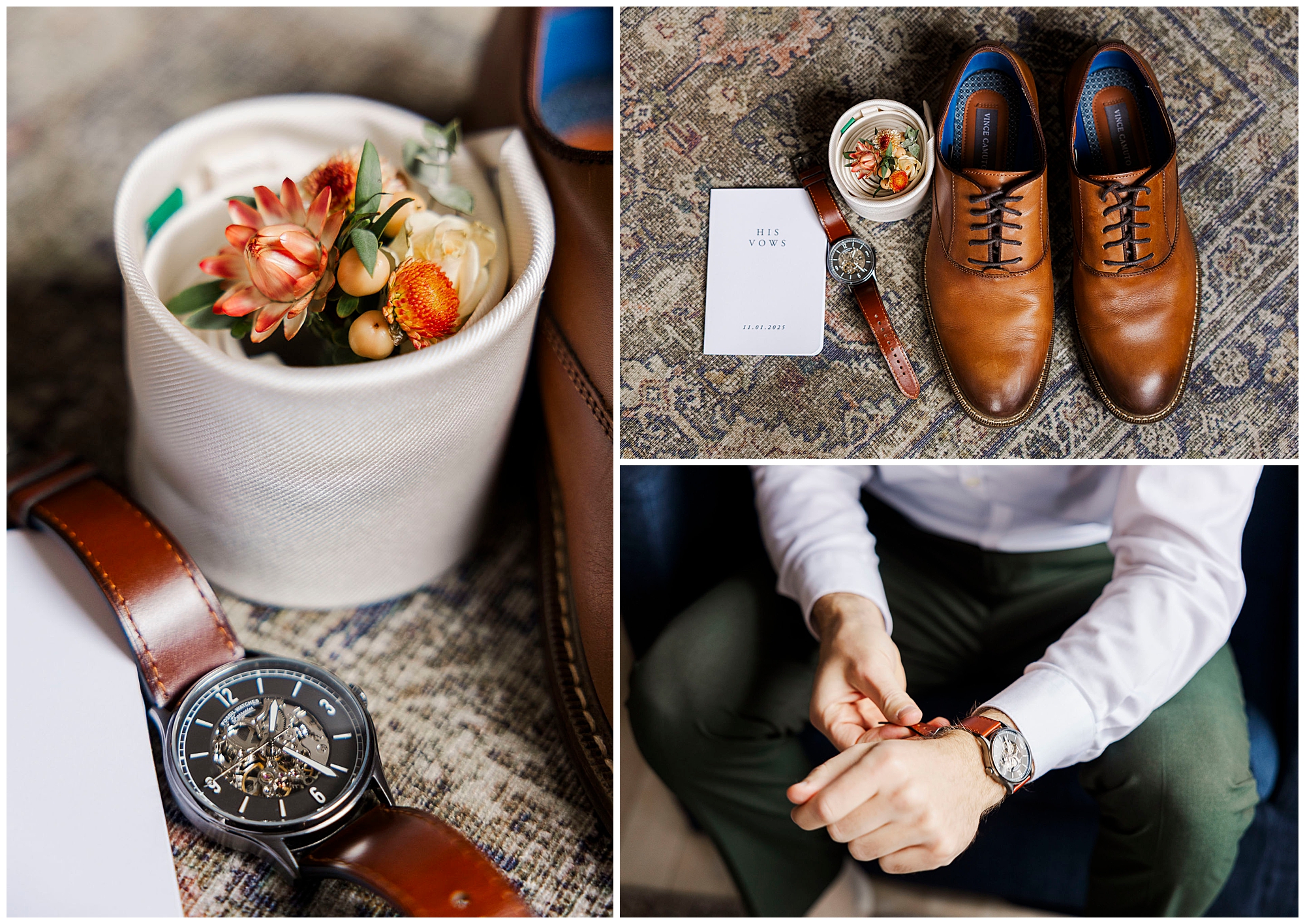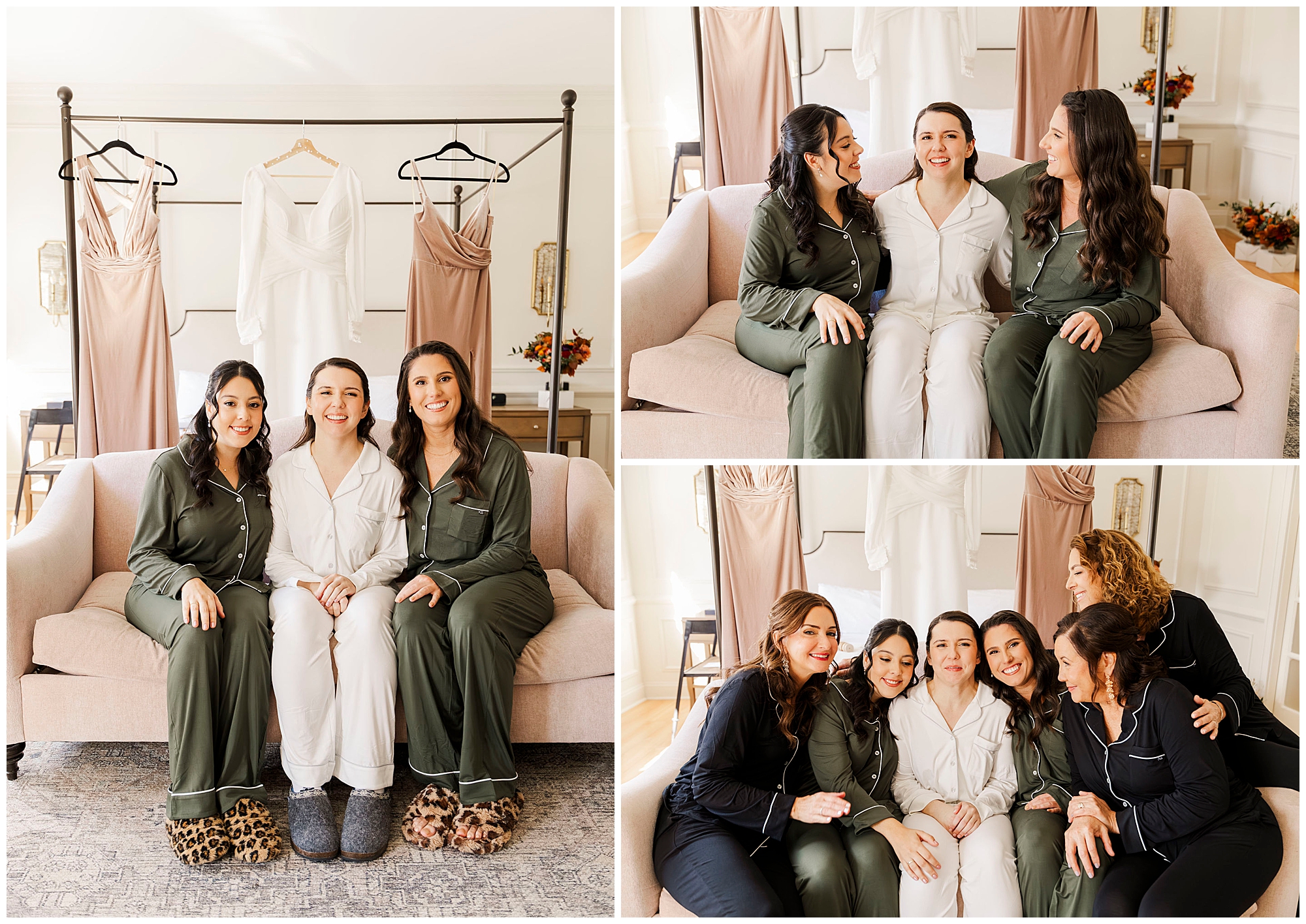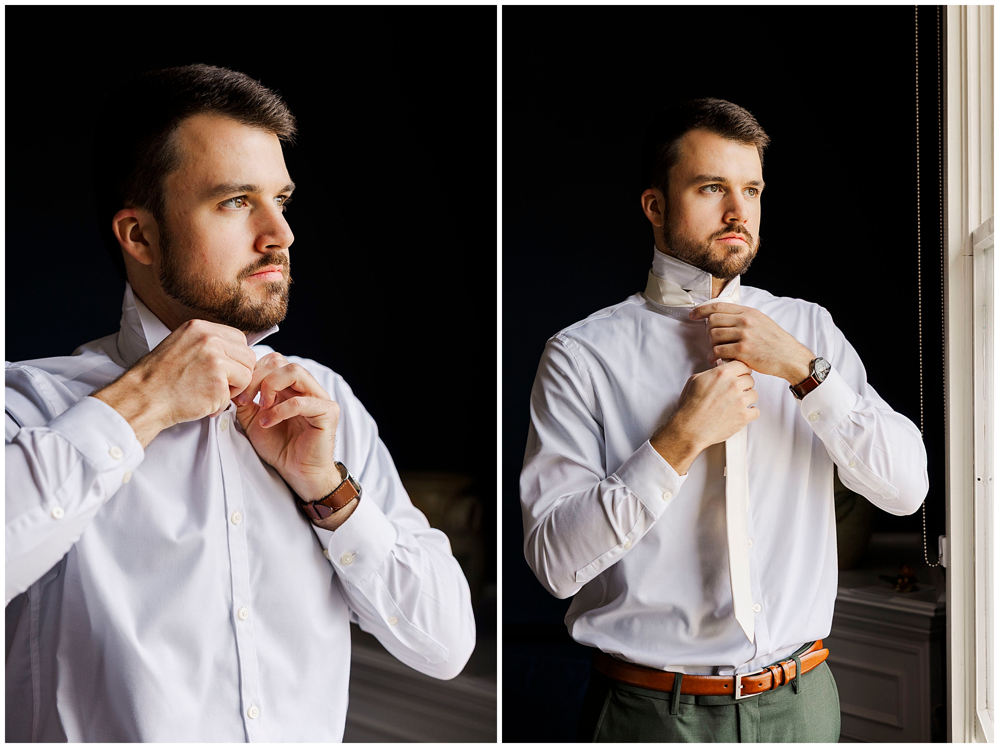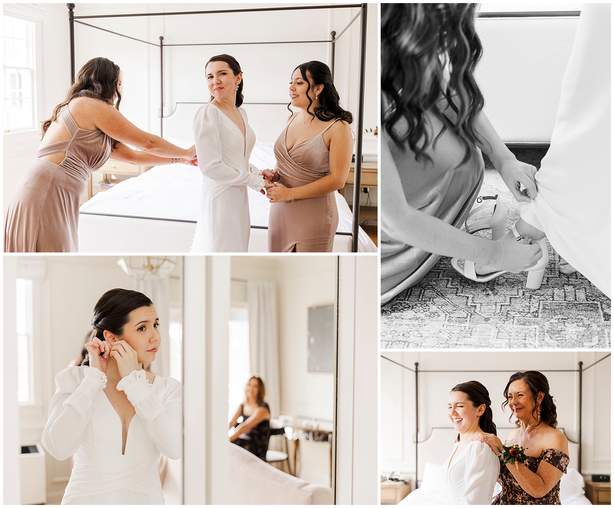 We start the morning in the bright suites at The Litchfield Inn. Jenna gets ready with her bridesmaids, her mom, and Jordan’s mom. The light in her room is soft and airy, perfect for capturing the little details of her gown and accessories. Meanwhile, Jordan gets ready with his groomsmen and dads, surrounded by laughter and quiet anticipation.