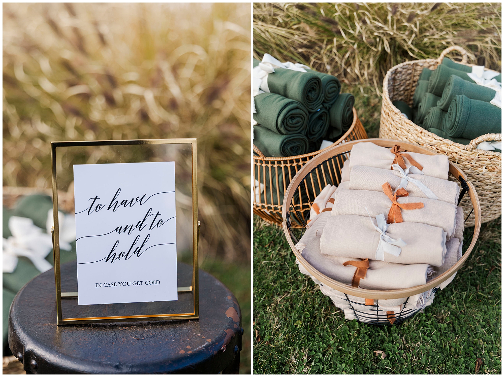 Guests arrive to cozy blankets draped over their chairs, a thoughtful touch for a chilly evening. The ceremony takes place outdoors, with the sun setting just behind the trees. It feels intimate and emotional, filled with tears and quiet joy. As Hudson Valley wedding photographers, we always love when couples embrace the season to make their ceremony feel personal and inviting.