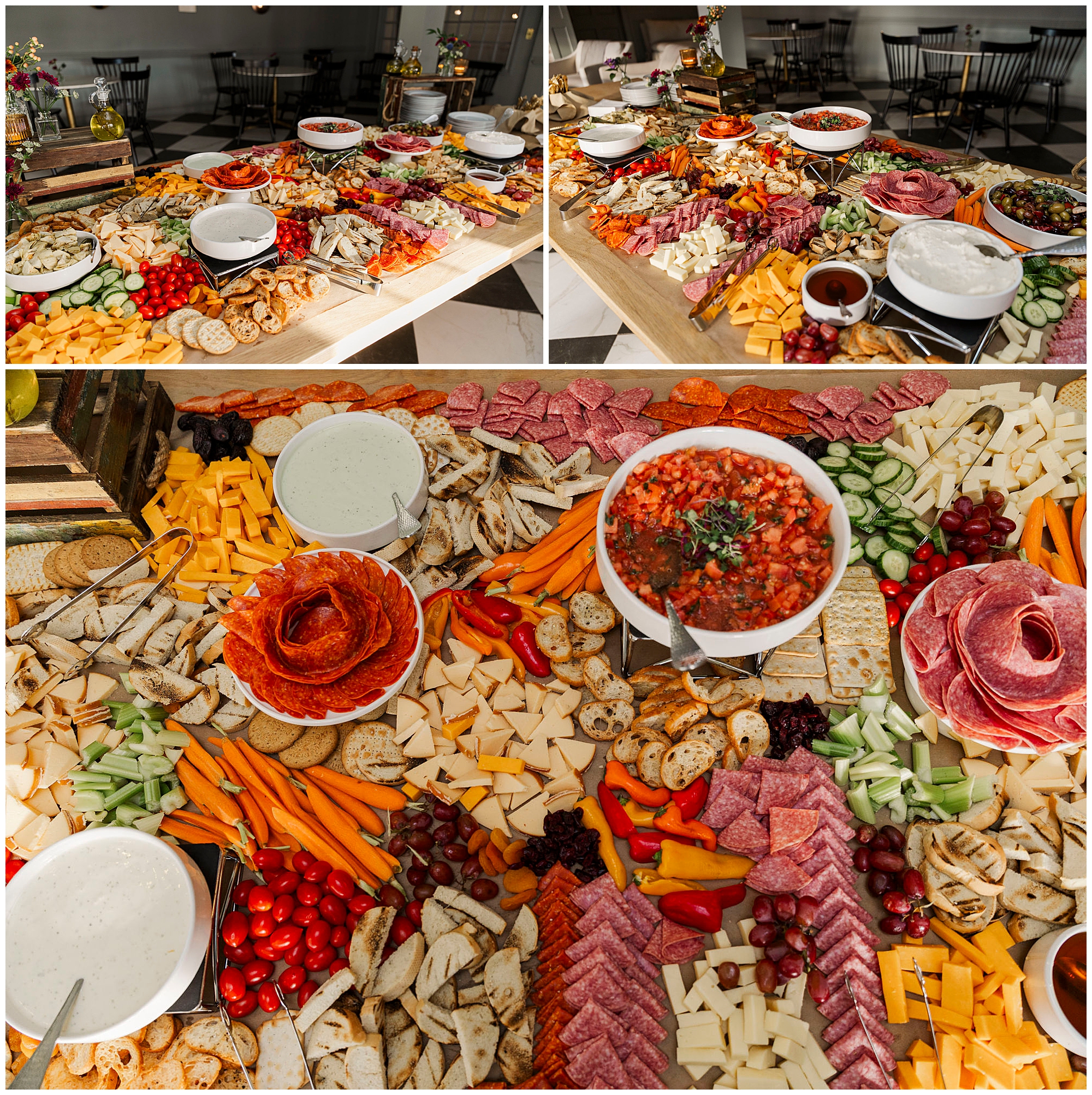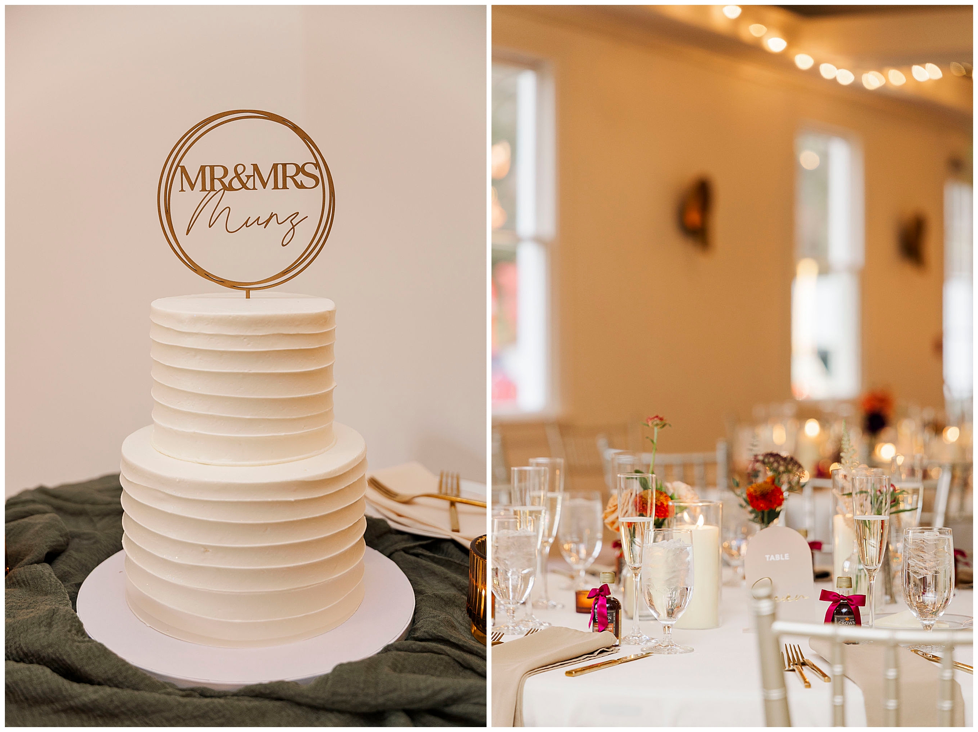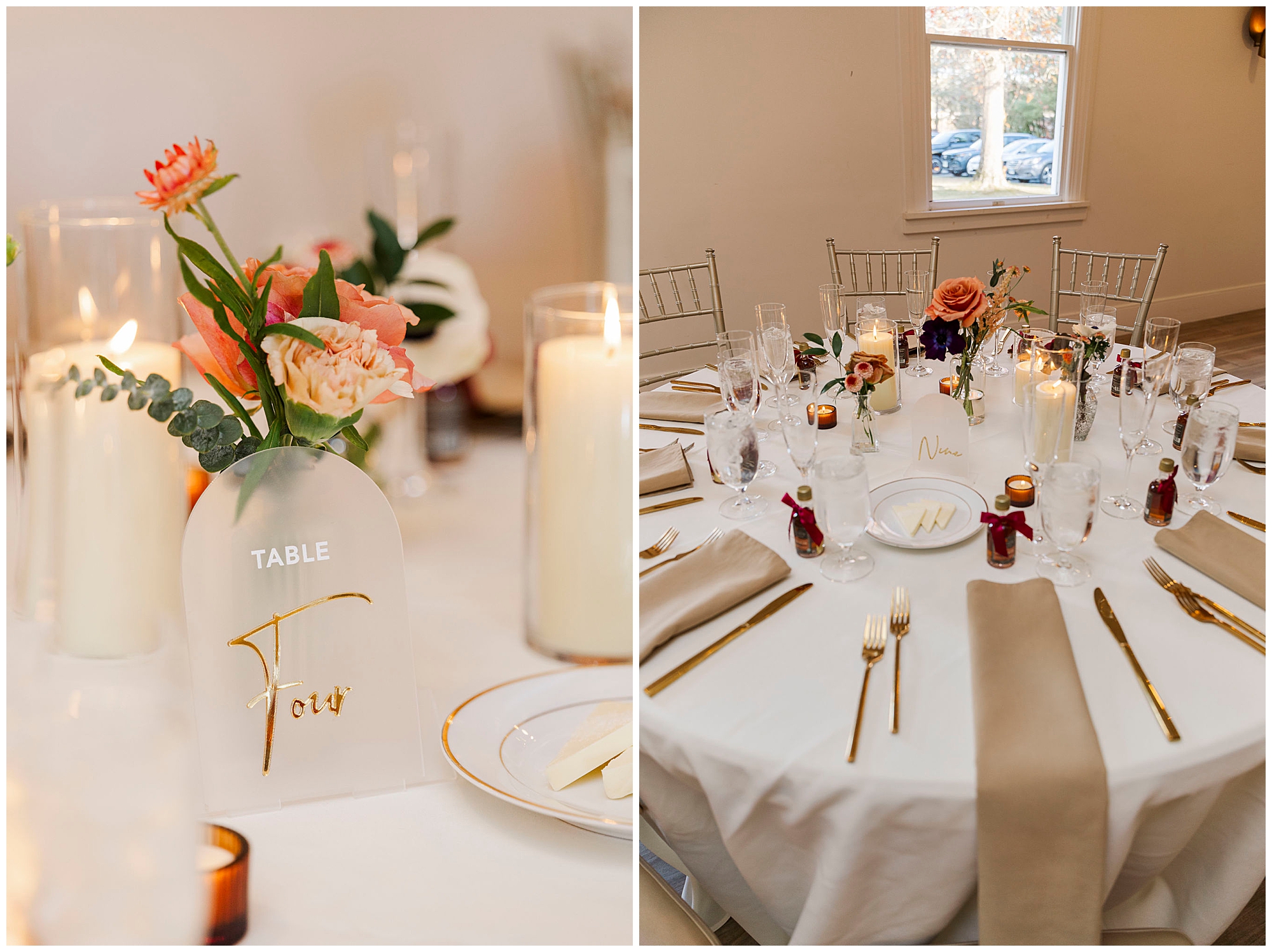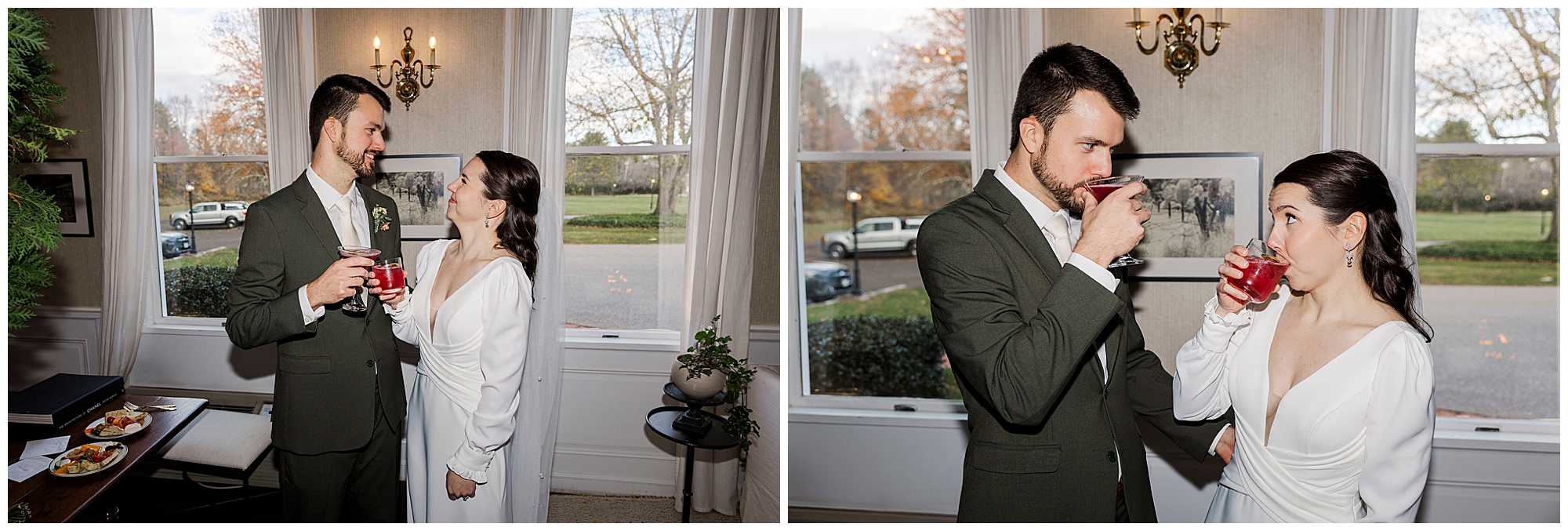 As the ceremony ends, guests enjoy cocktail hour both indoors and outdoors. Fire pits crackle on the patio while servers pass warm apple cider and seasonal cocktails. The grazing table is full of autumn-inspired treats, creating the perfect cozy atmosphere. It is the kind of setting that feels both luxurious and welcoming, just like the rest of this Litchfield wedding.