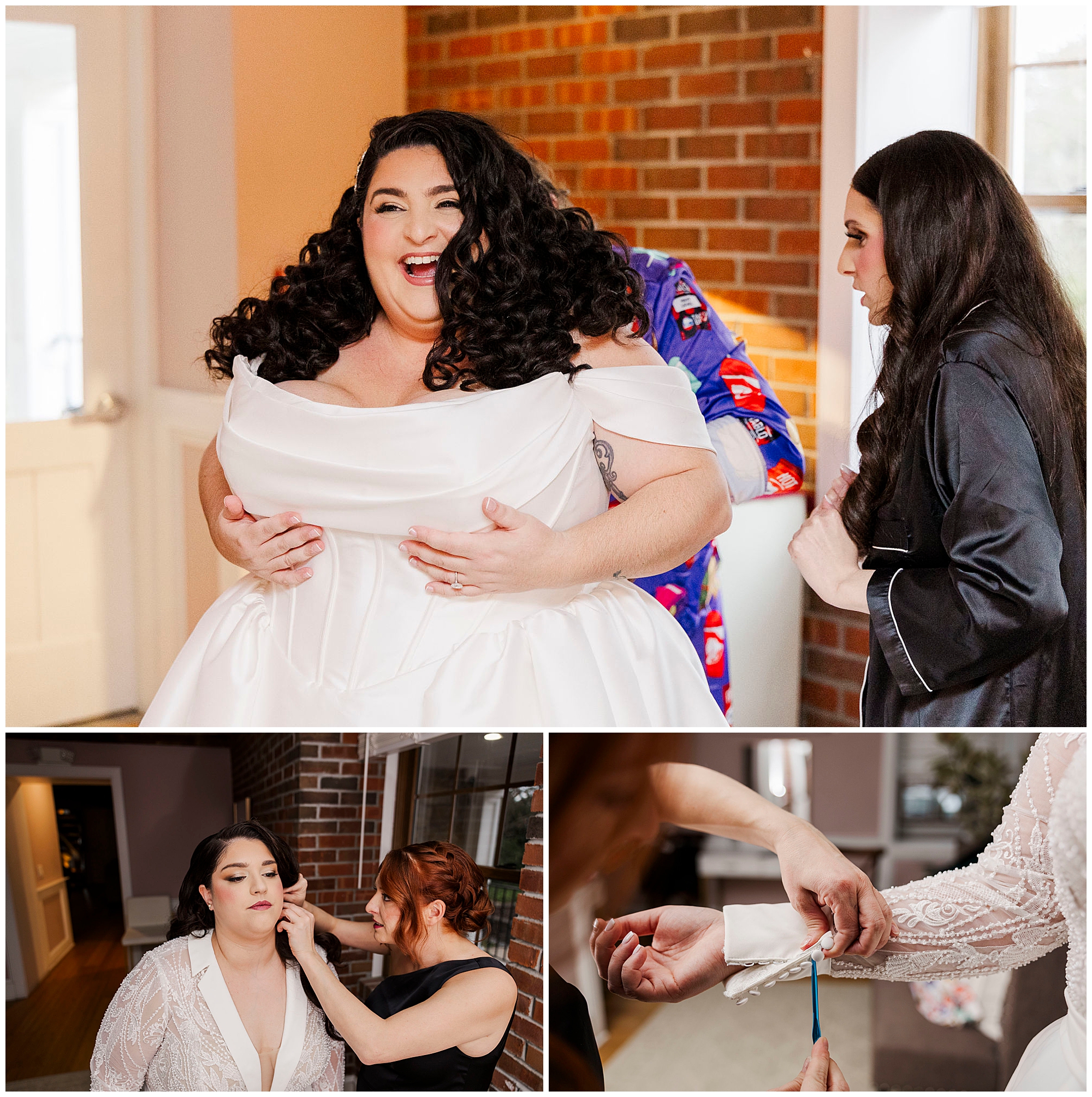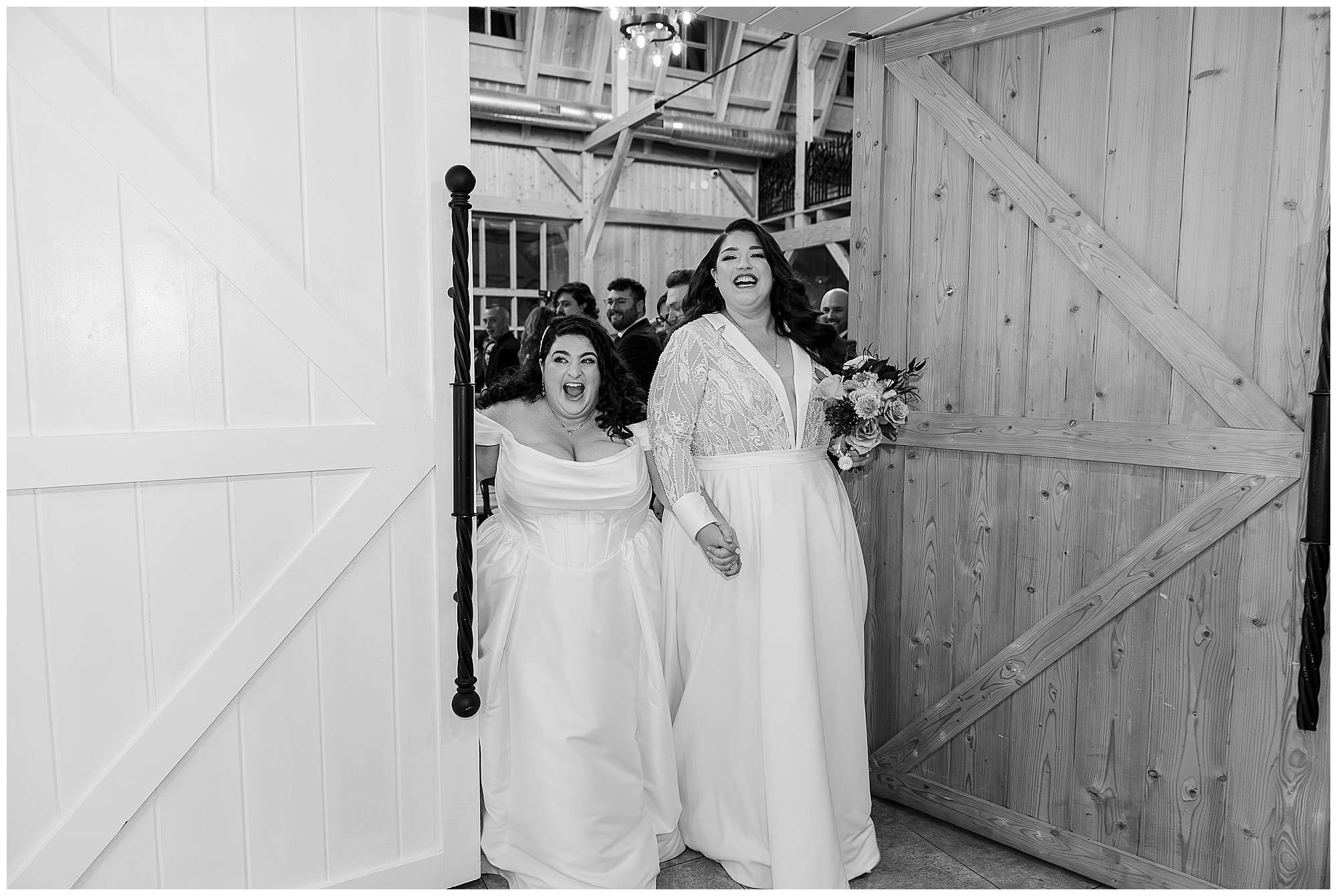 The day began upstairs in the bridal suite. This dedicated space offers natural light and rustic charm. Both brides prepared together in this intimate setting. The exposed beams created a warm atmosphere for photos.