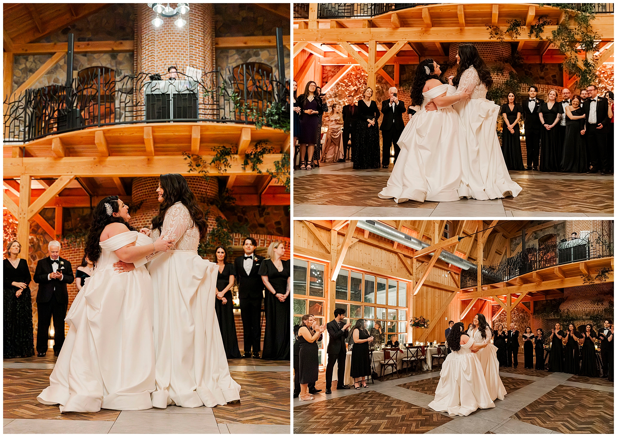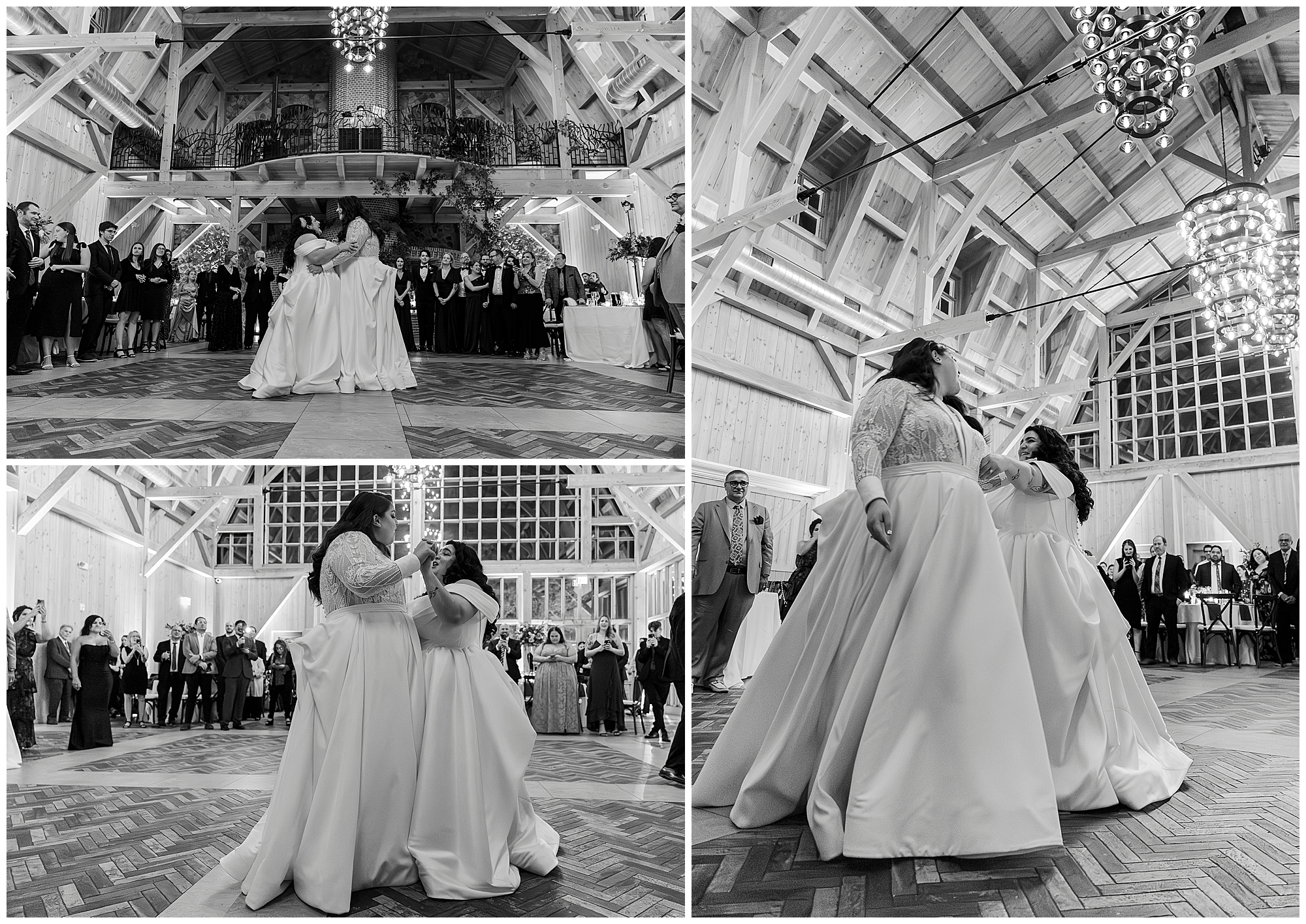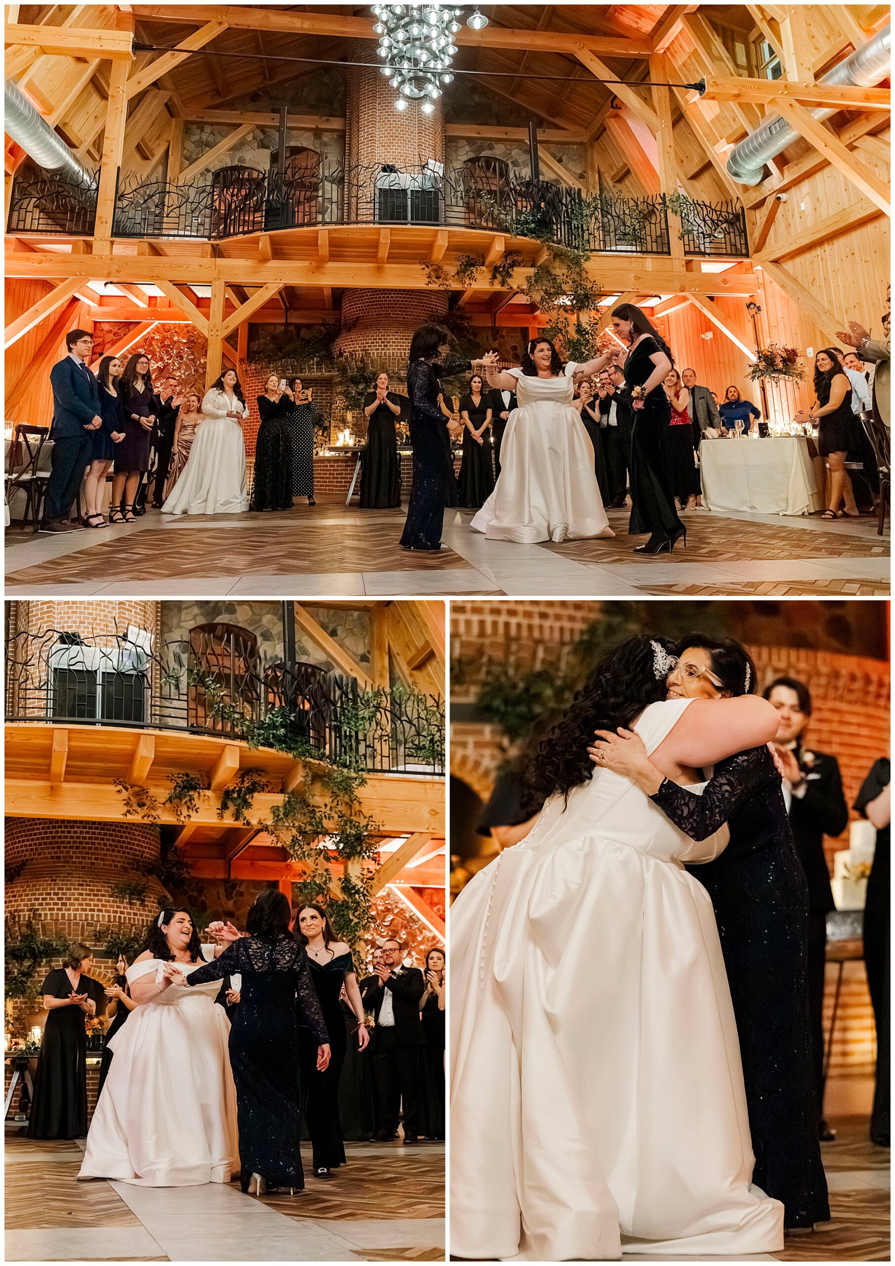 Their first dance was absolutely magical. The soaring wood beams created a cathedral-like atmosphere. Guests surrounded them on the dance floor. We captured every tender moment between them.