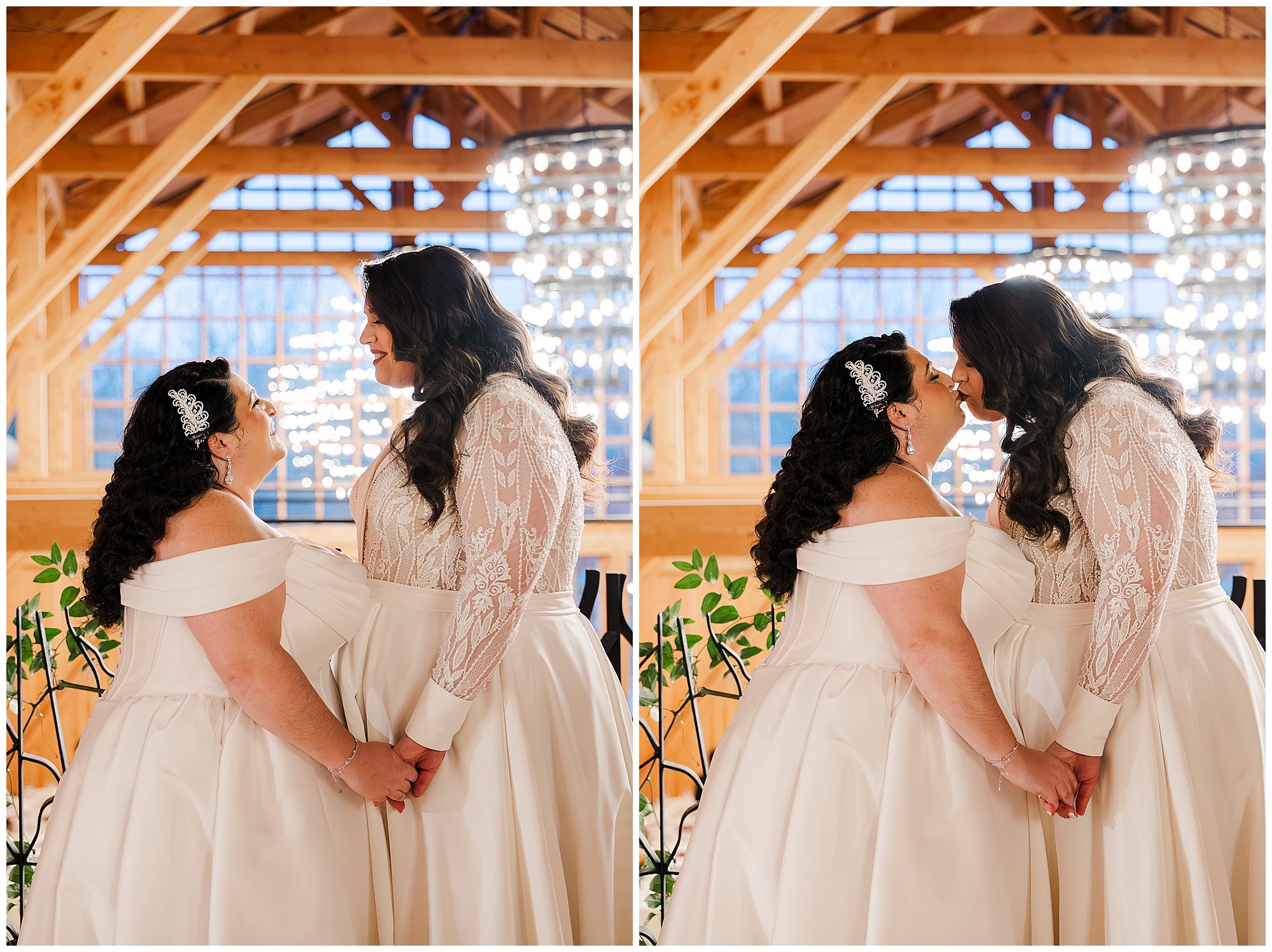 We returned inside for dramatic interior shots. The venue’s gorgeous chandeliers created stunning backdrops. Soaring exposed wood beams framed the couple perfectly. These architectural details make every image special.