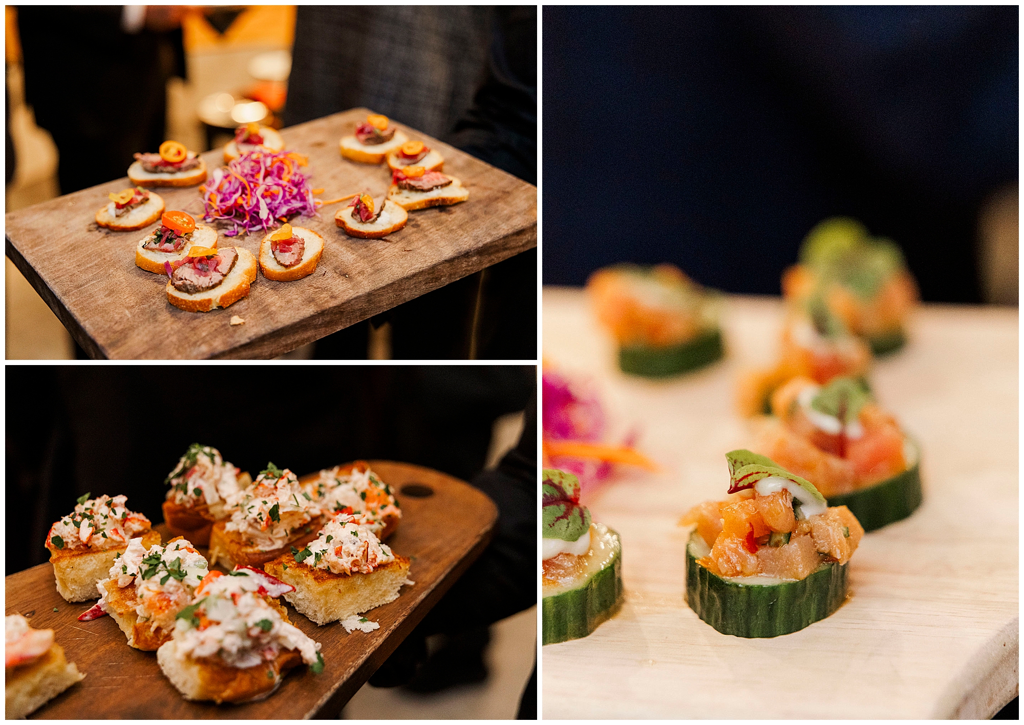 Cocktail hour featured impressive culinary displays. Landmark Hospitality created diverse food stations. Passed appetizers circulated throughout the space. Guests enjoyed exploring the 10-acre estate grounds.