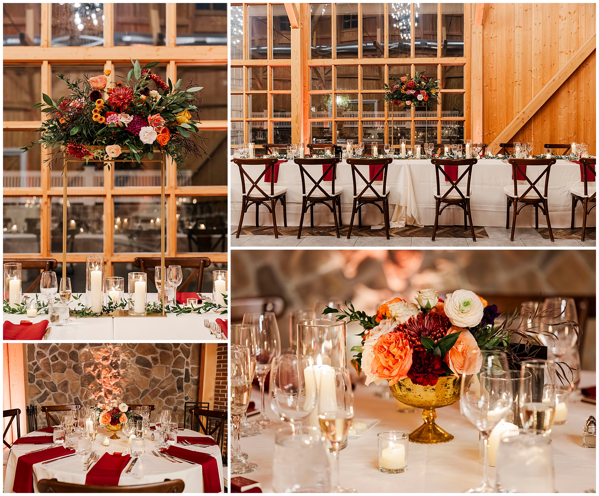 The reception tables looked absolutely stunning. Deep red napkins contrasted with crisp white linens. Tall floral centerpieces added vertical interest and drama. The herringbone floor pattern added visual texture below.