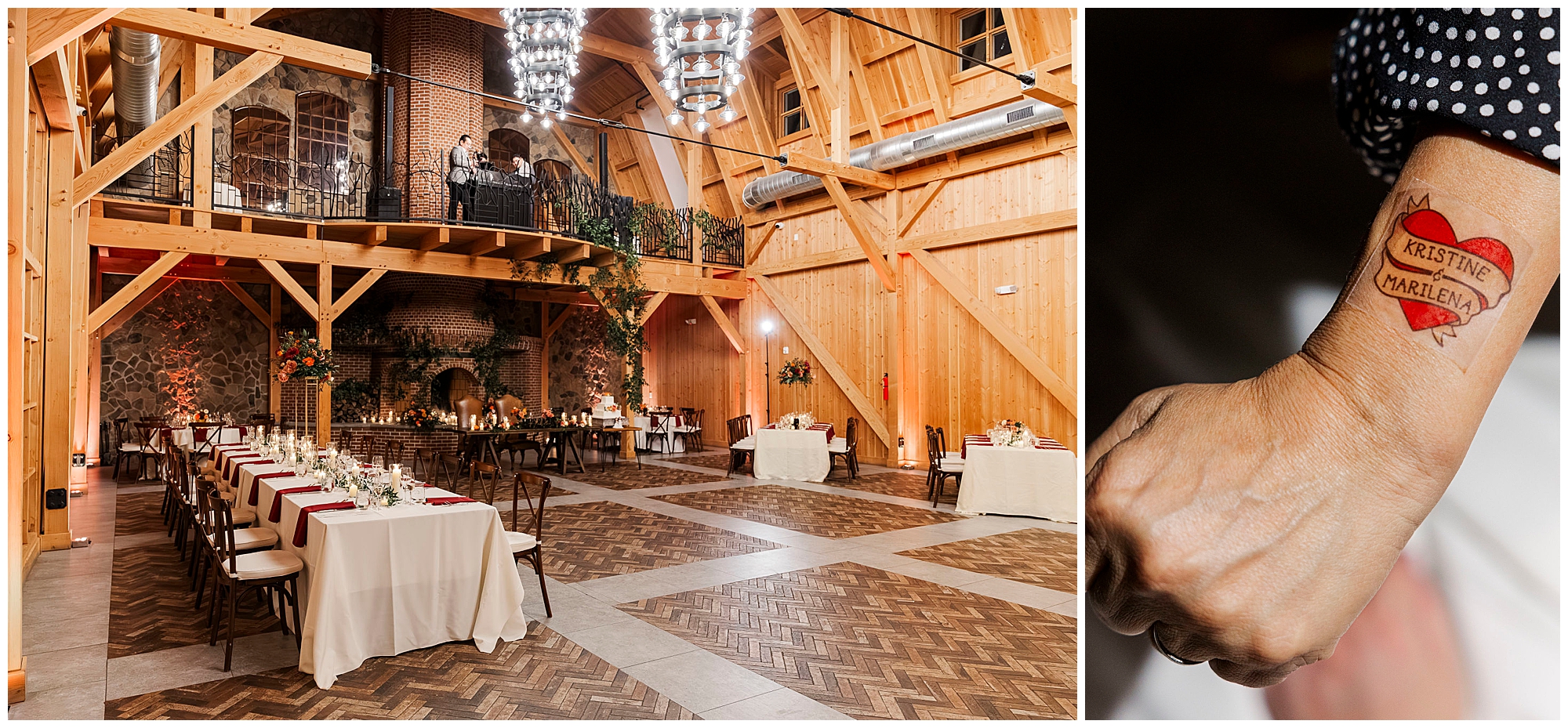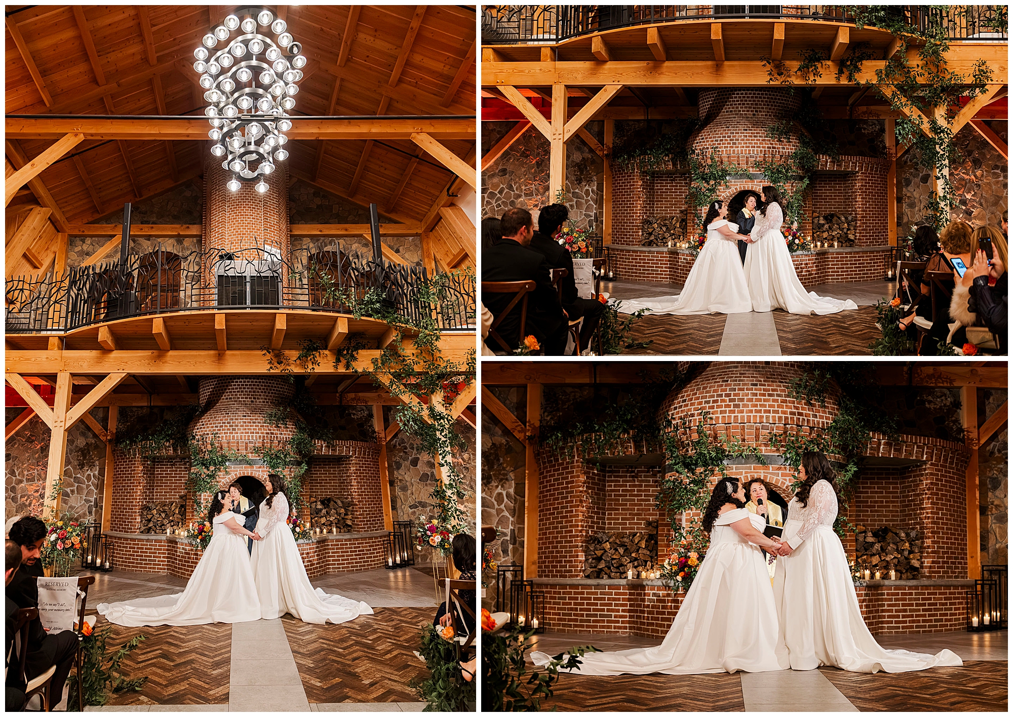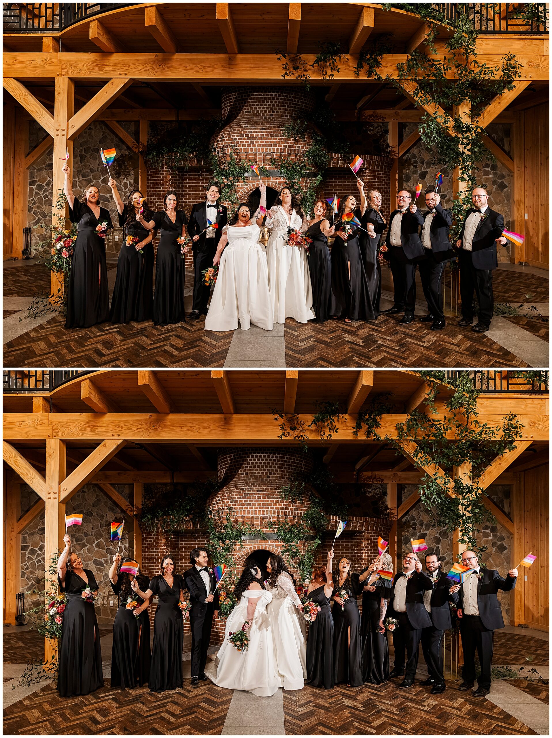 As queer wedding photography specialists, we appreciate great venues. The modern Craftsman barn aesthetic photographs beautifully. High ceilings and lighter wood tones prevent darkness. Intricate stonework adds texture and visual interest throughout.