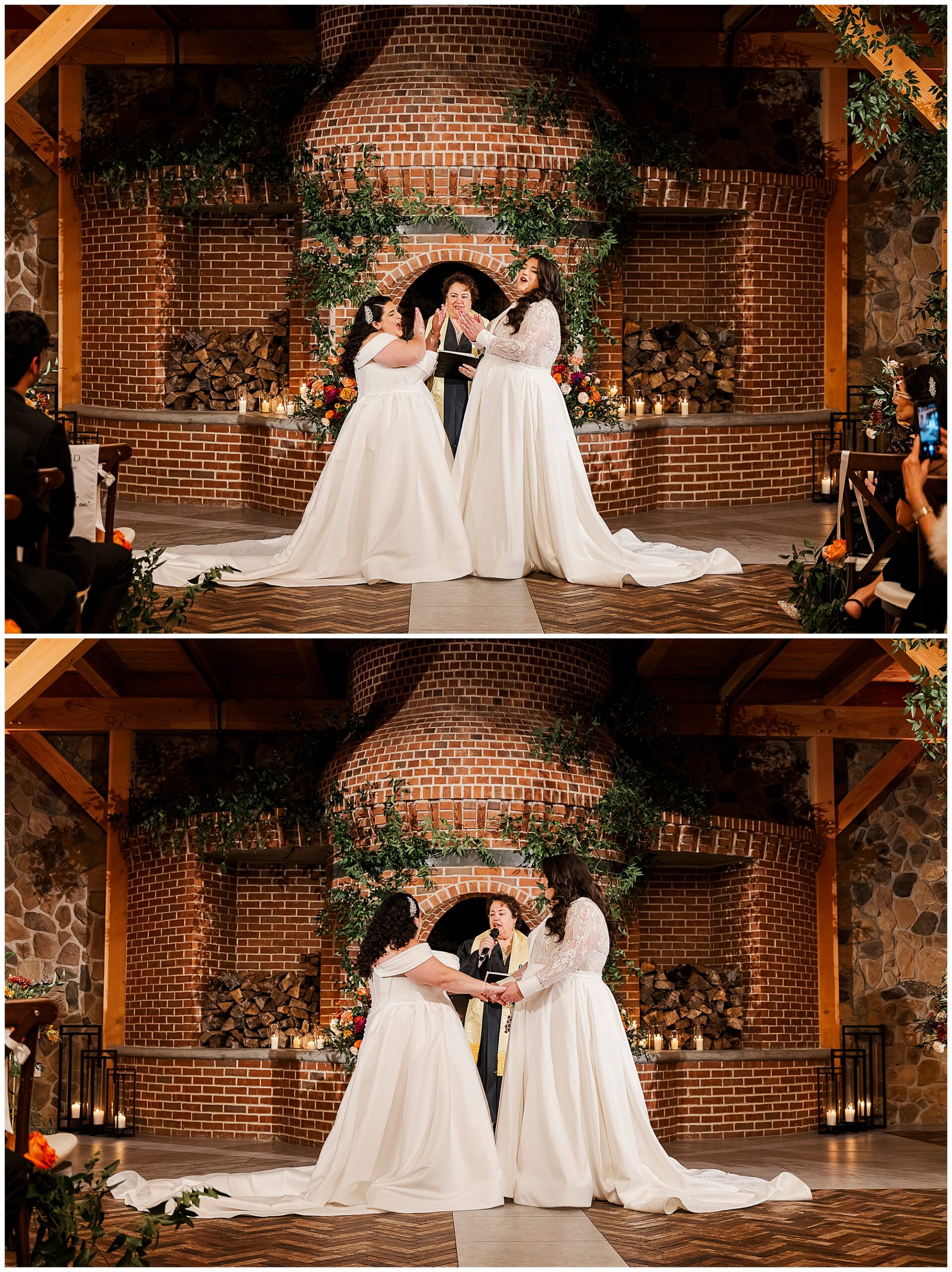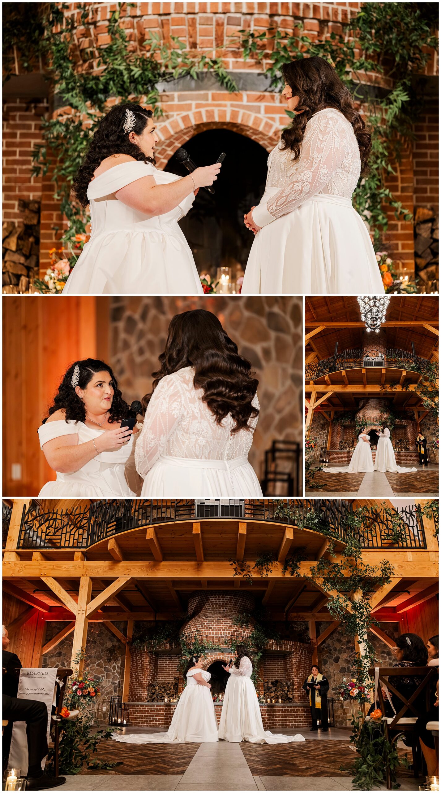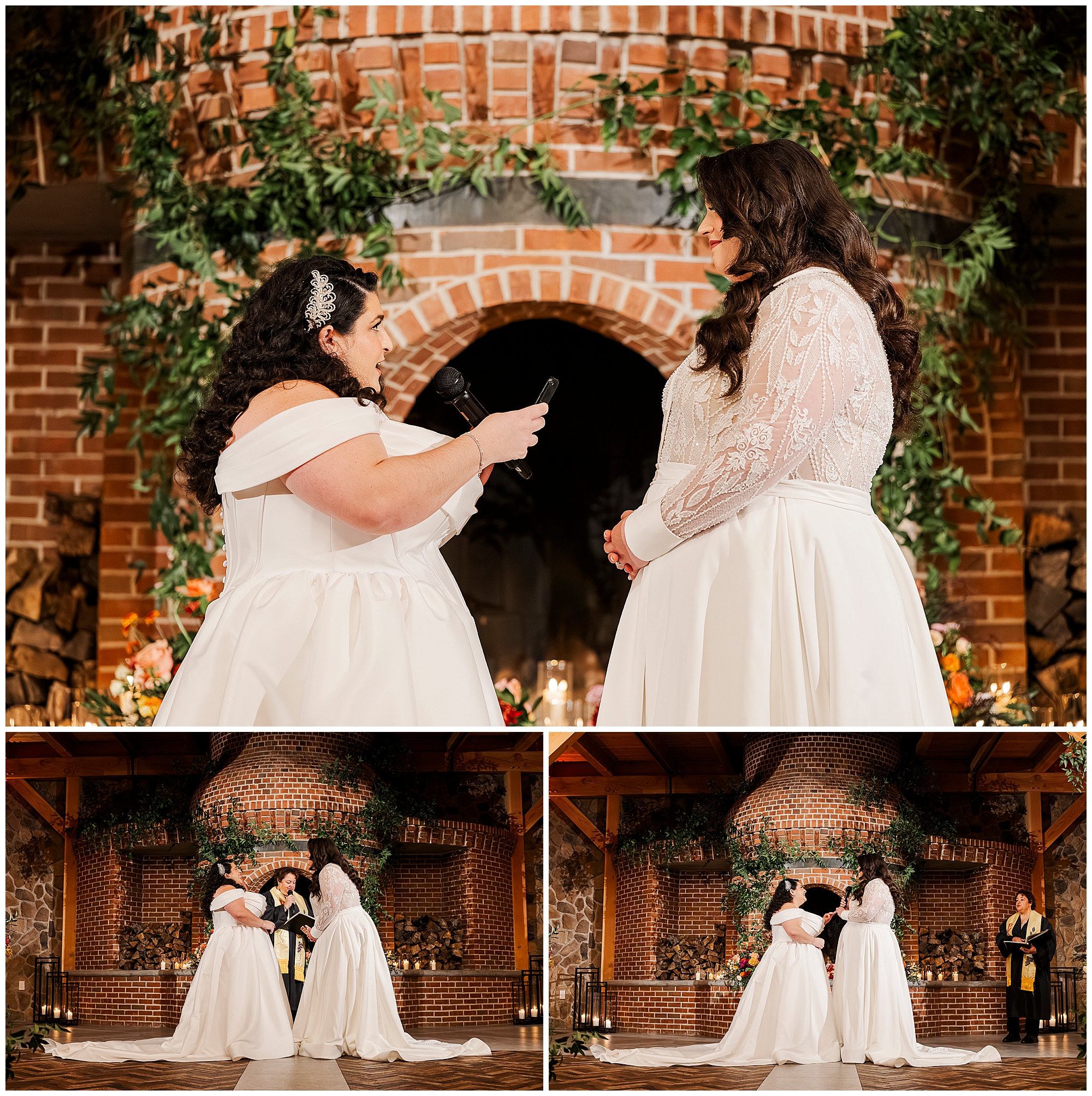 The ceremony took place in front of the fireplace. Lamar Wedding Center officiated their heartfelt vows. The dramatic brick oven served as a stunning focal point. Consequently, the intimate atmosphere felt warm and welcoming.