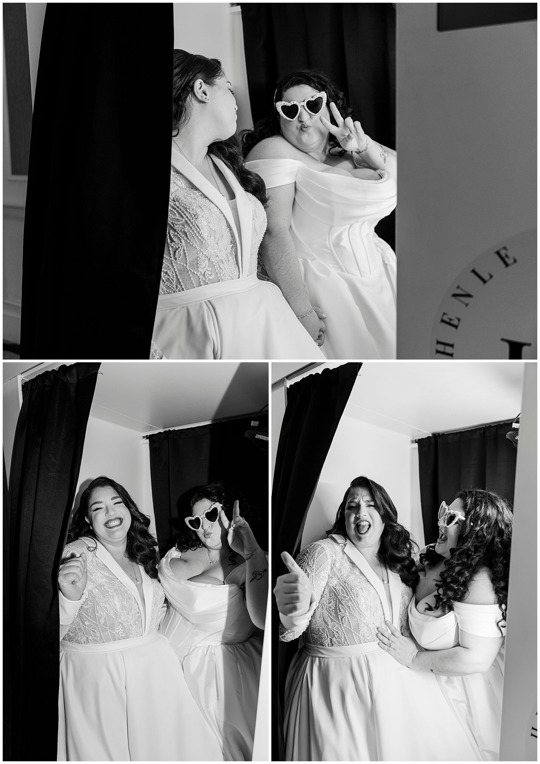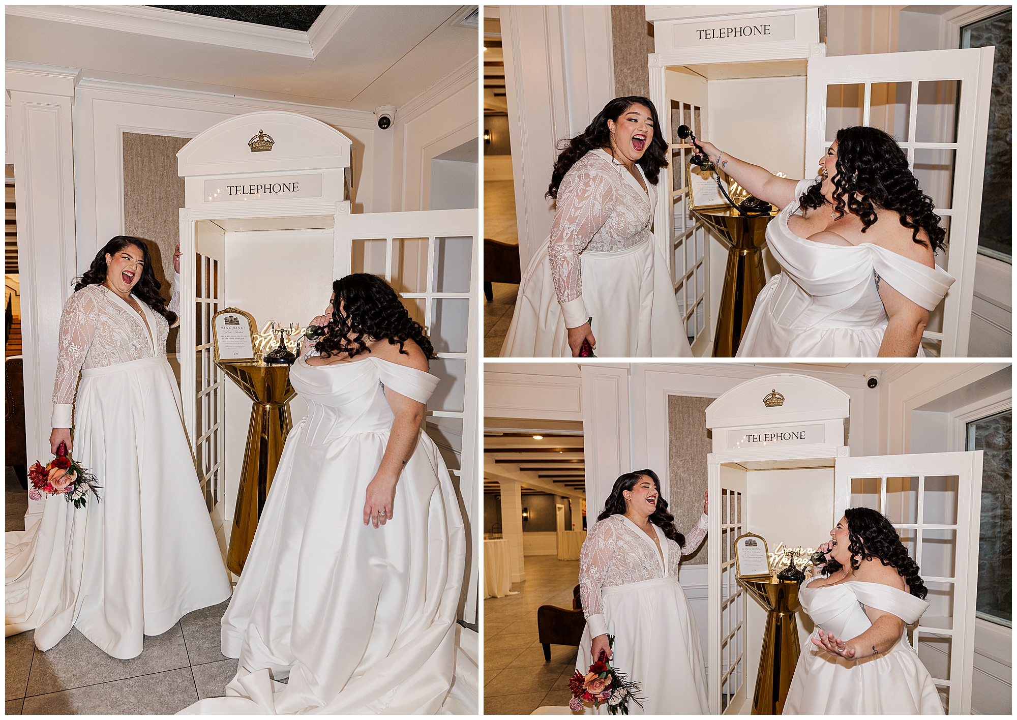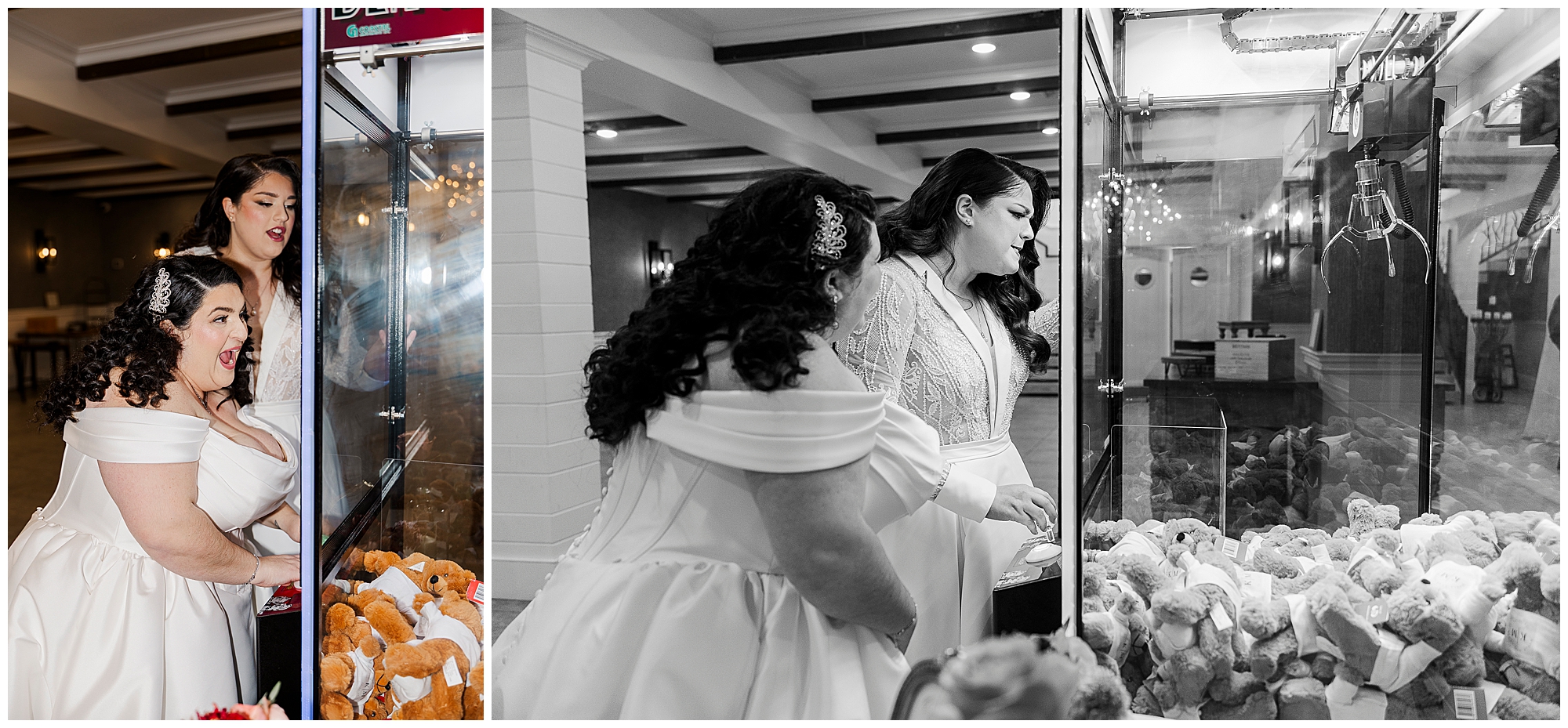 This Silo at The Farmhouse wedding featured playful elements. Kristine and Marilena used the vintage phone booth. They also posed with the arcade-style claw machine. These interactive elements added personality to their portraits.