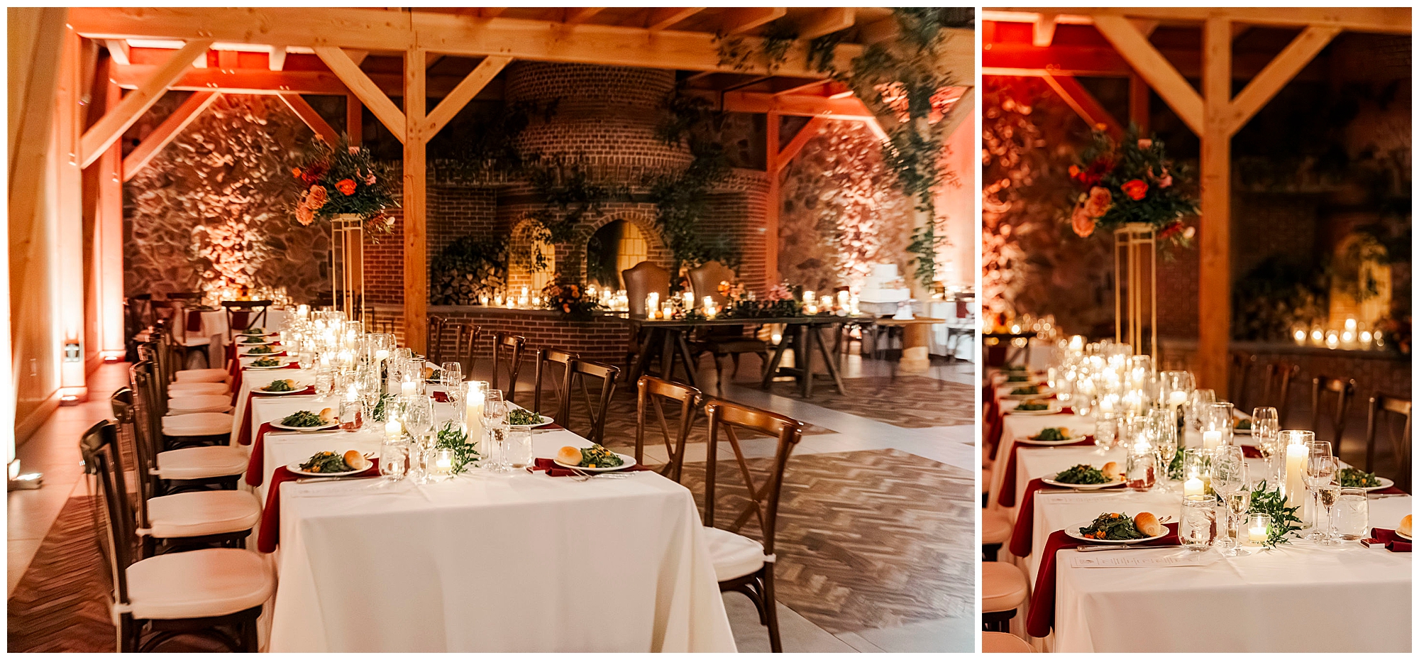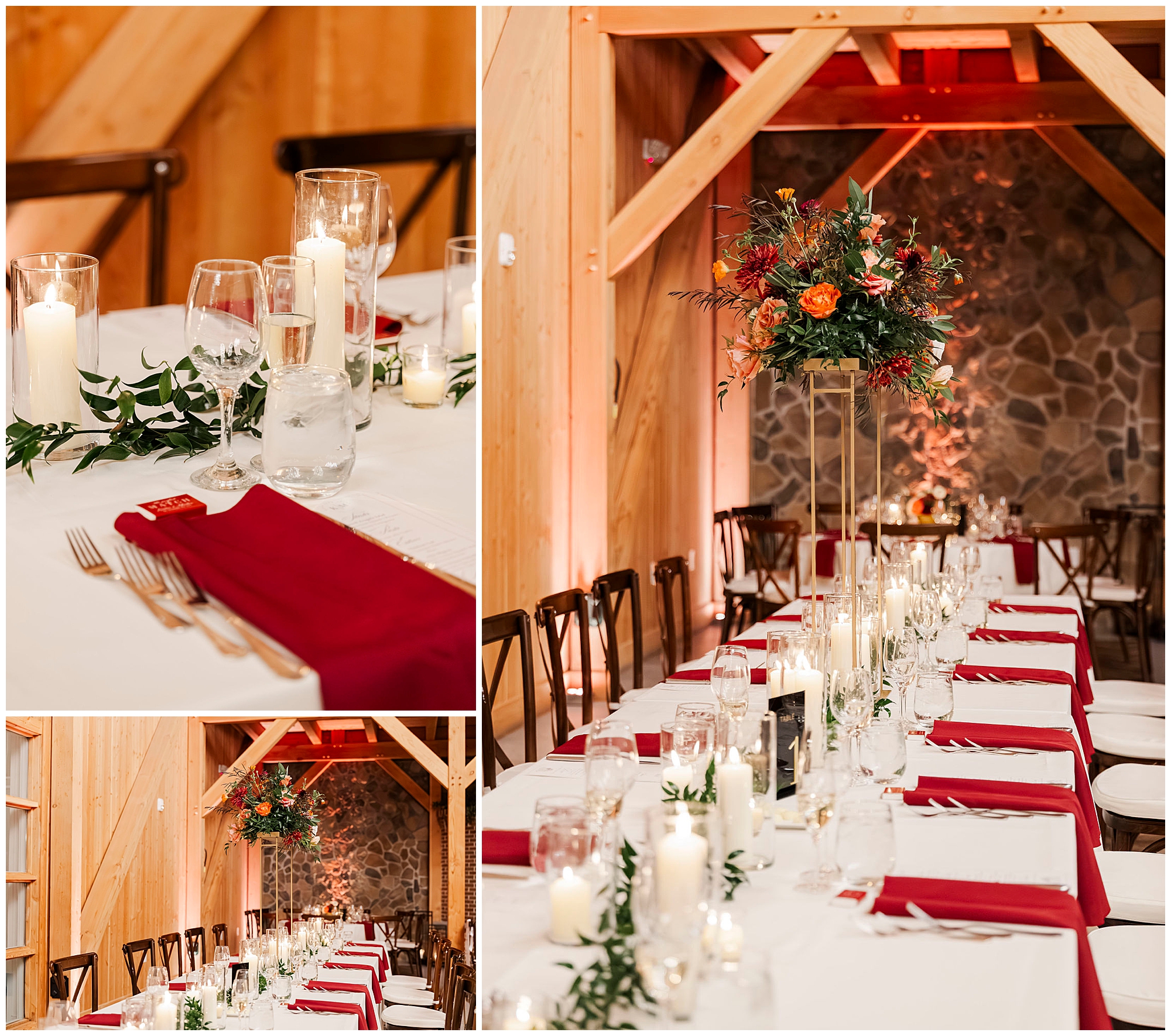 The reception tables looked absolutely stunning. Deep red napkins contrasted with crisp white linens. Tall floral centerpieces added vertical interest and drama. The herringbone floor pattern added visual texture below.