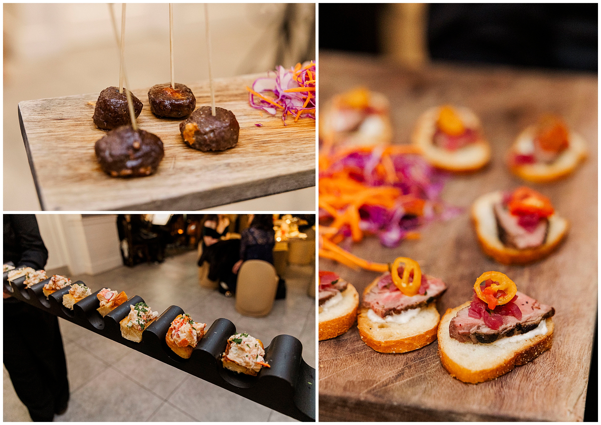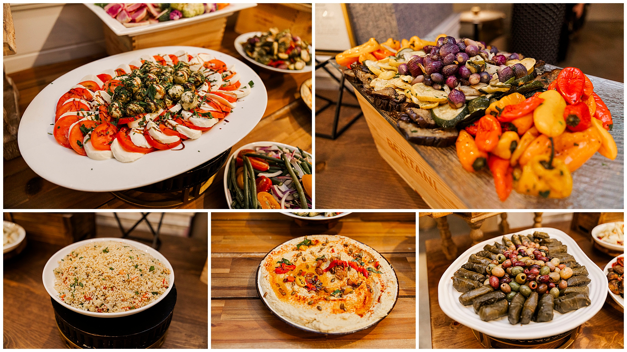 Cocktail hour featured impressive culinary displays. Landmark Hospitality created diverse food stations. Passed appetizers circulated throughout the space. Guests enjoyed exploring the 10-acre estate grounds.