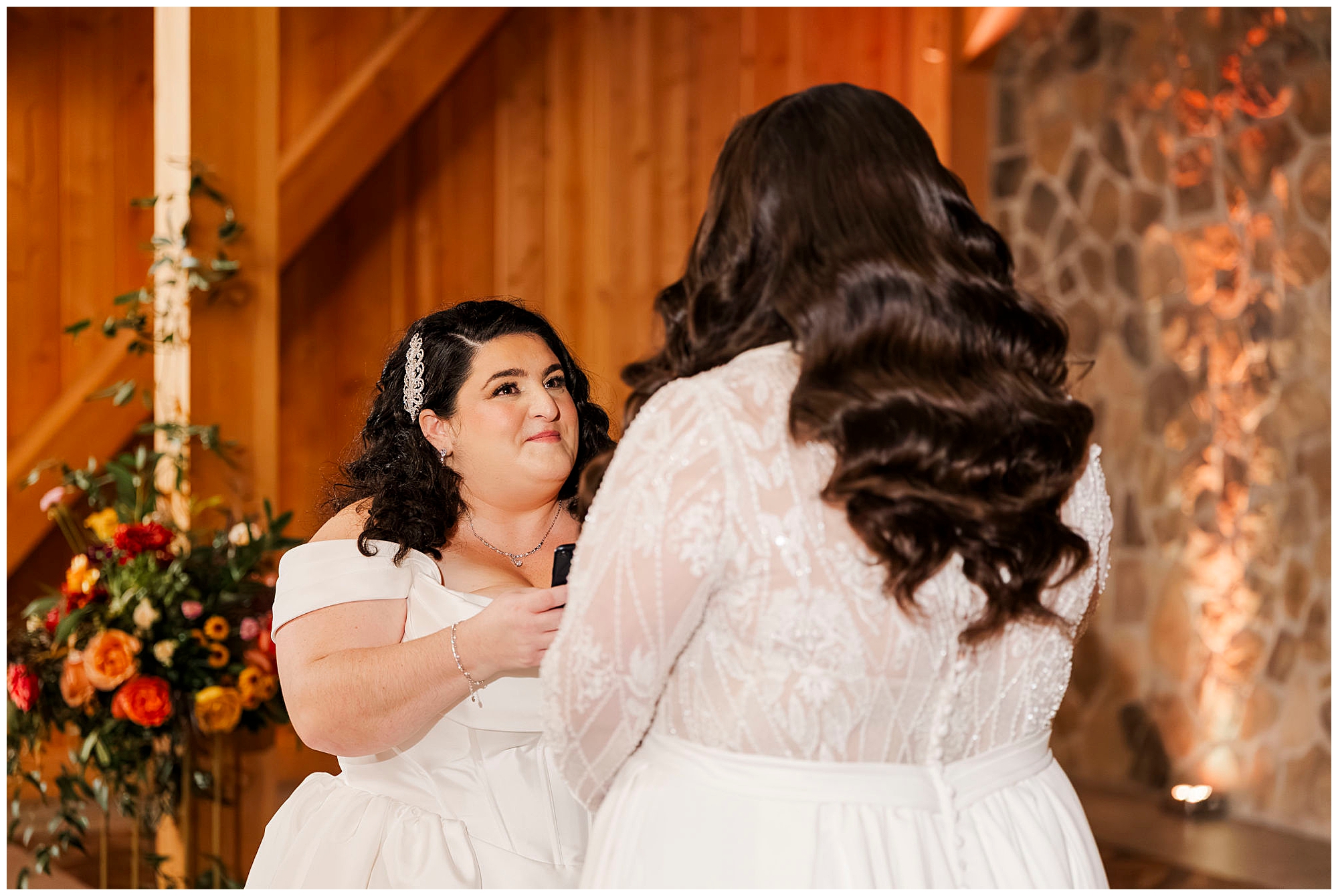 The day began upstairs in the bridal suite. This dedicated space offers natural light and rustic charm. Both brides prepared together in this intimate setting. The exposed beams created a warm atmosphere for photos.