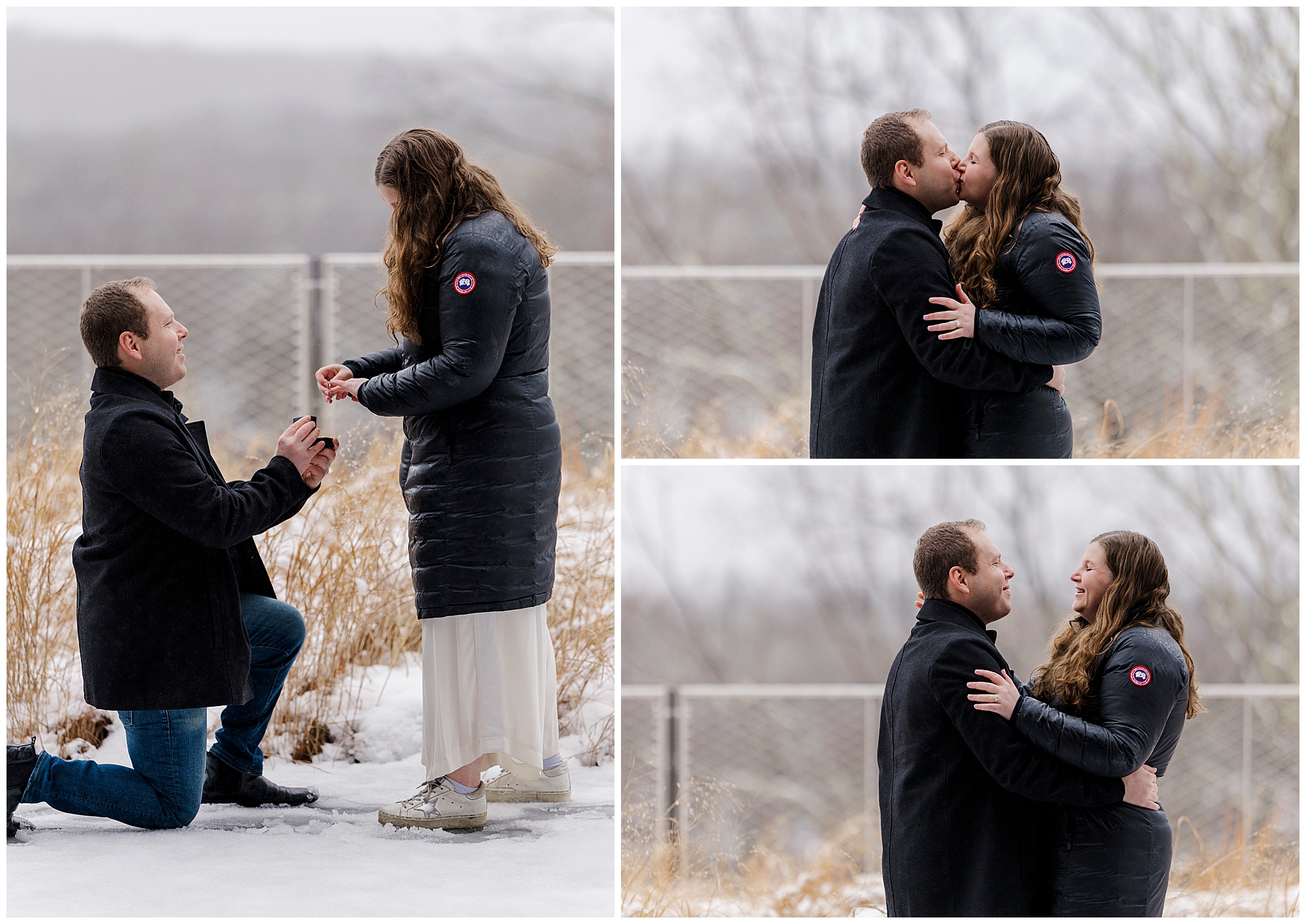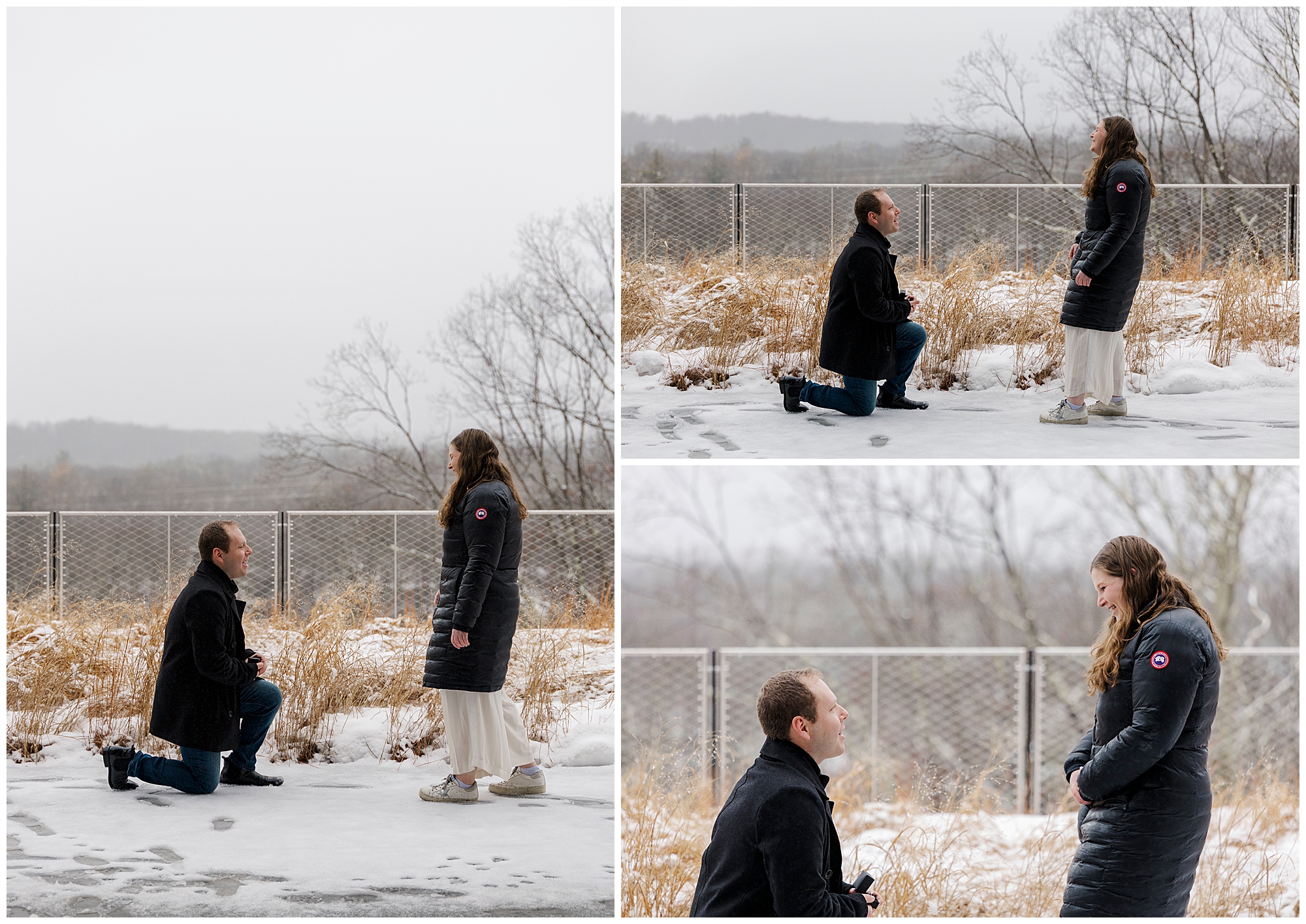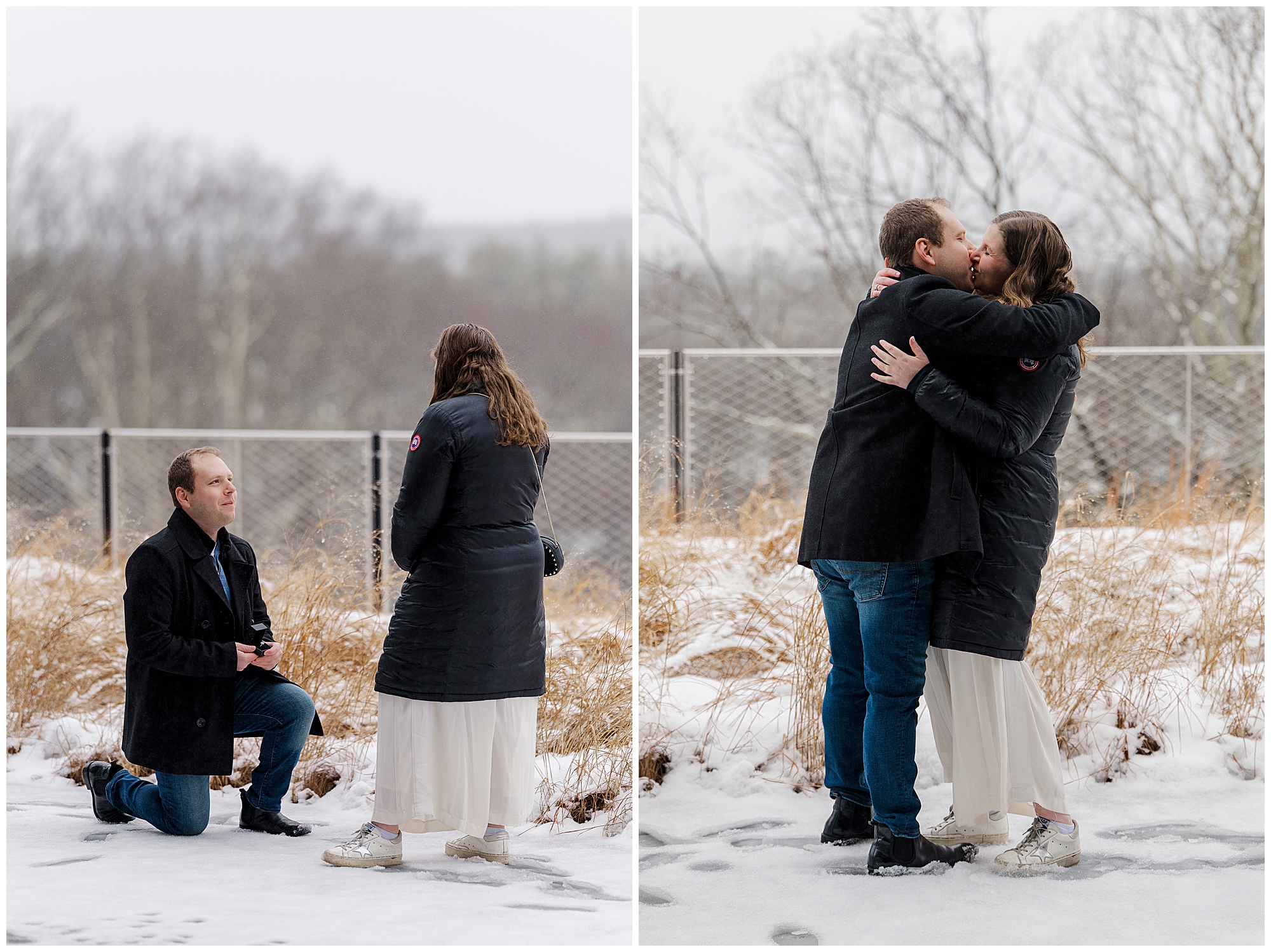 Once they had a chance to catch their breath, we headed back outside for portraits. The snow was still falling steadily, creating the dreamiest winter wonderland around them. As Beacon proposal photographers, we find that snowstorms elevate a winter Piaule proposal to another level. Consequently, every photo from this portion of the session feels like it belongs in a magazine.