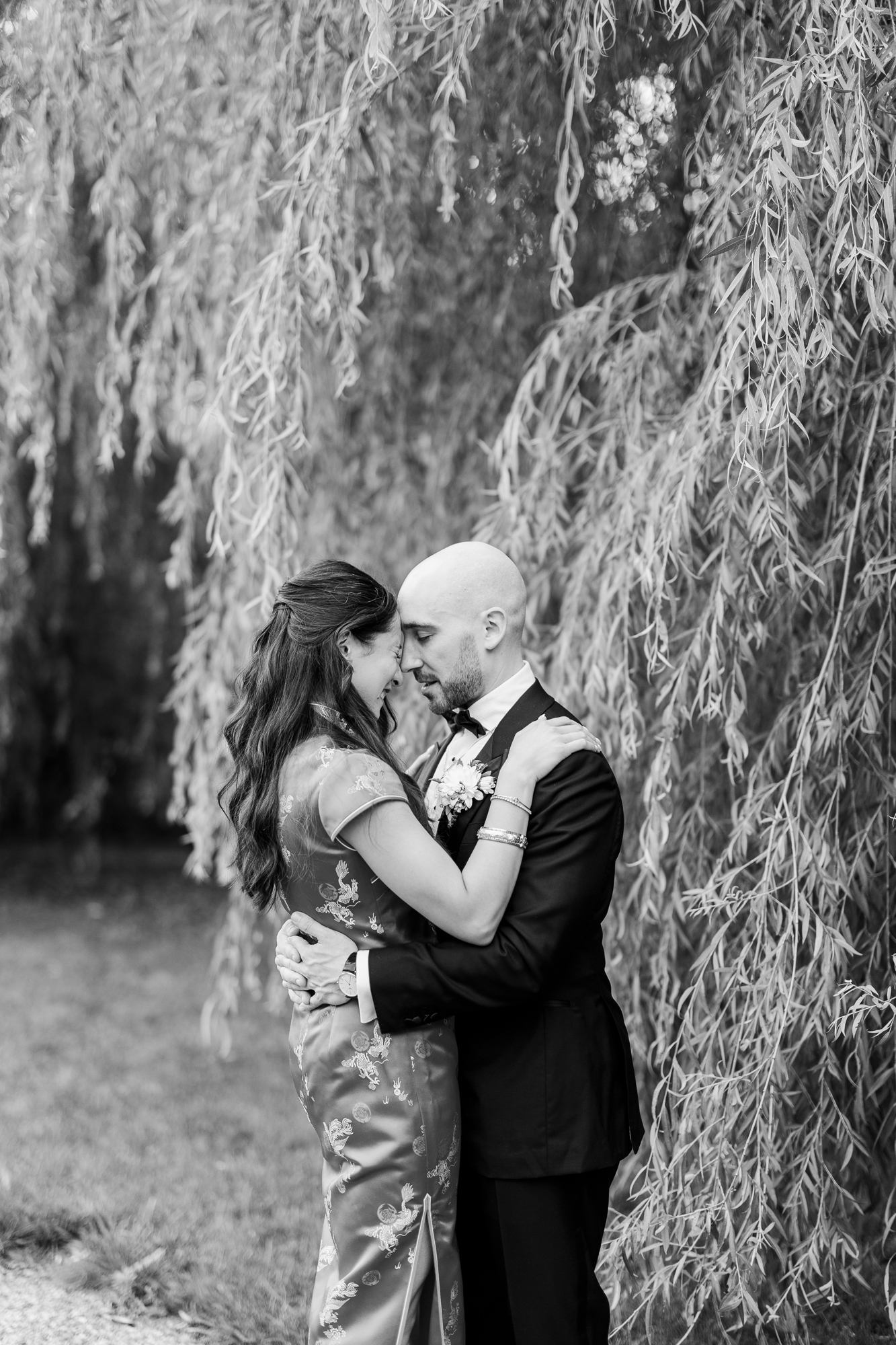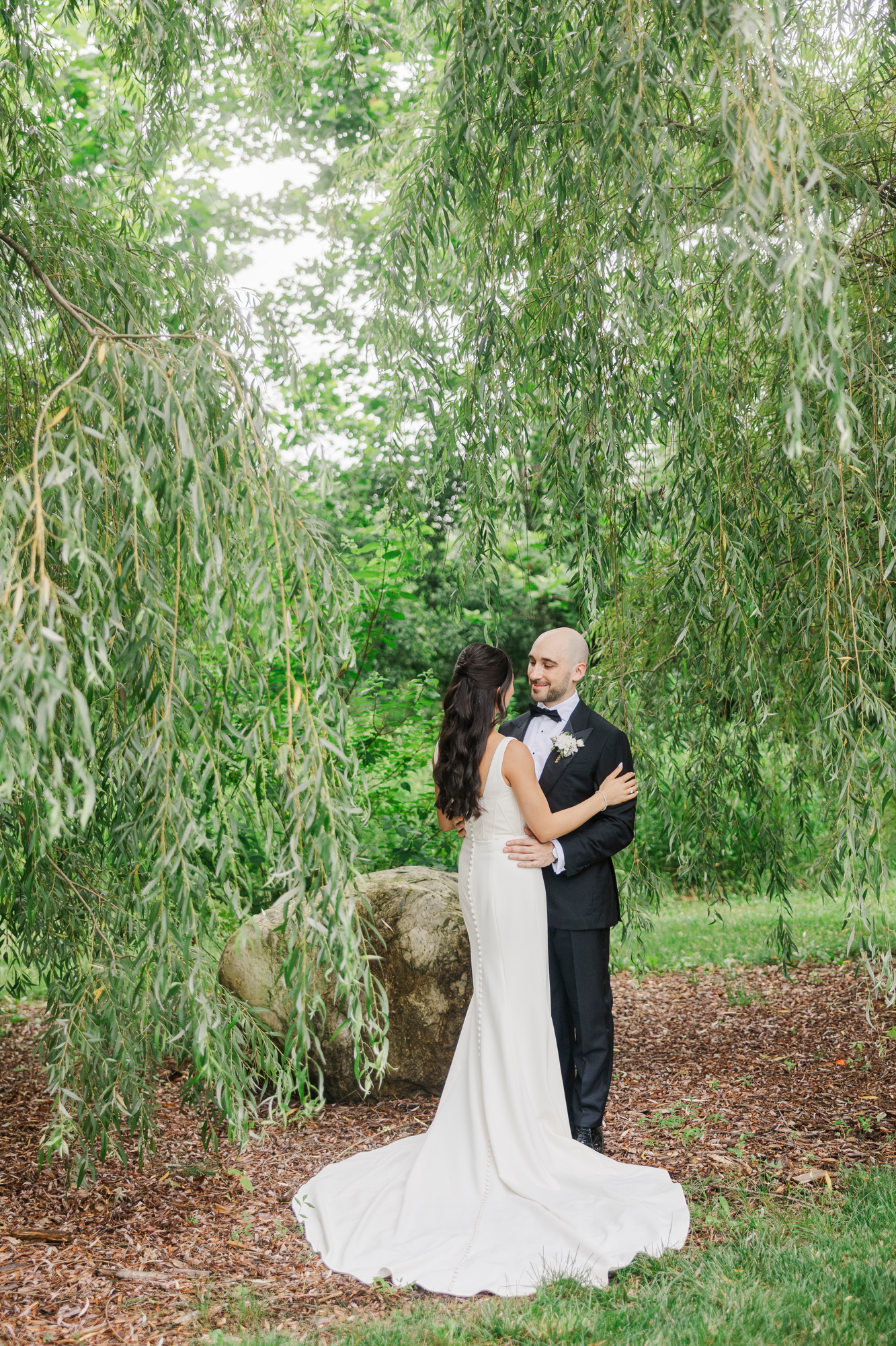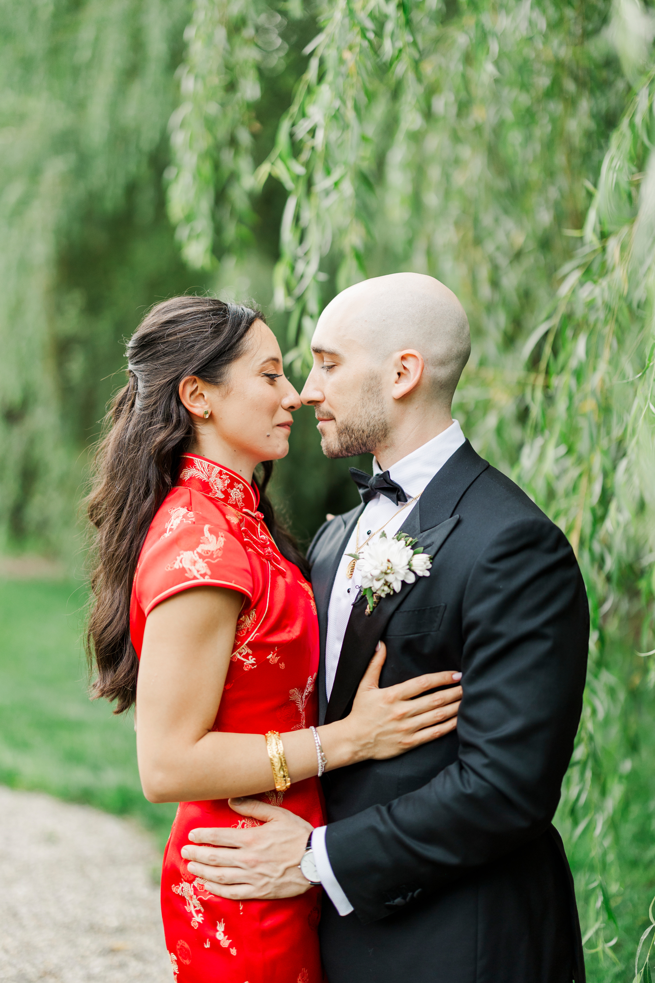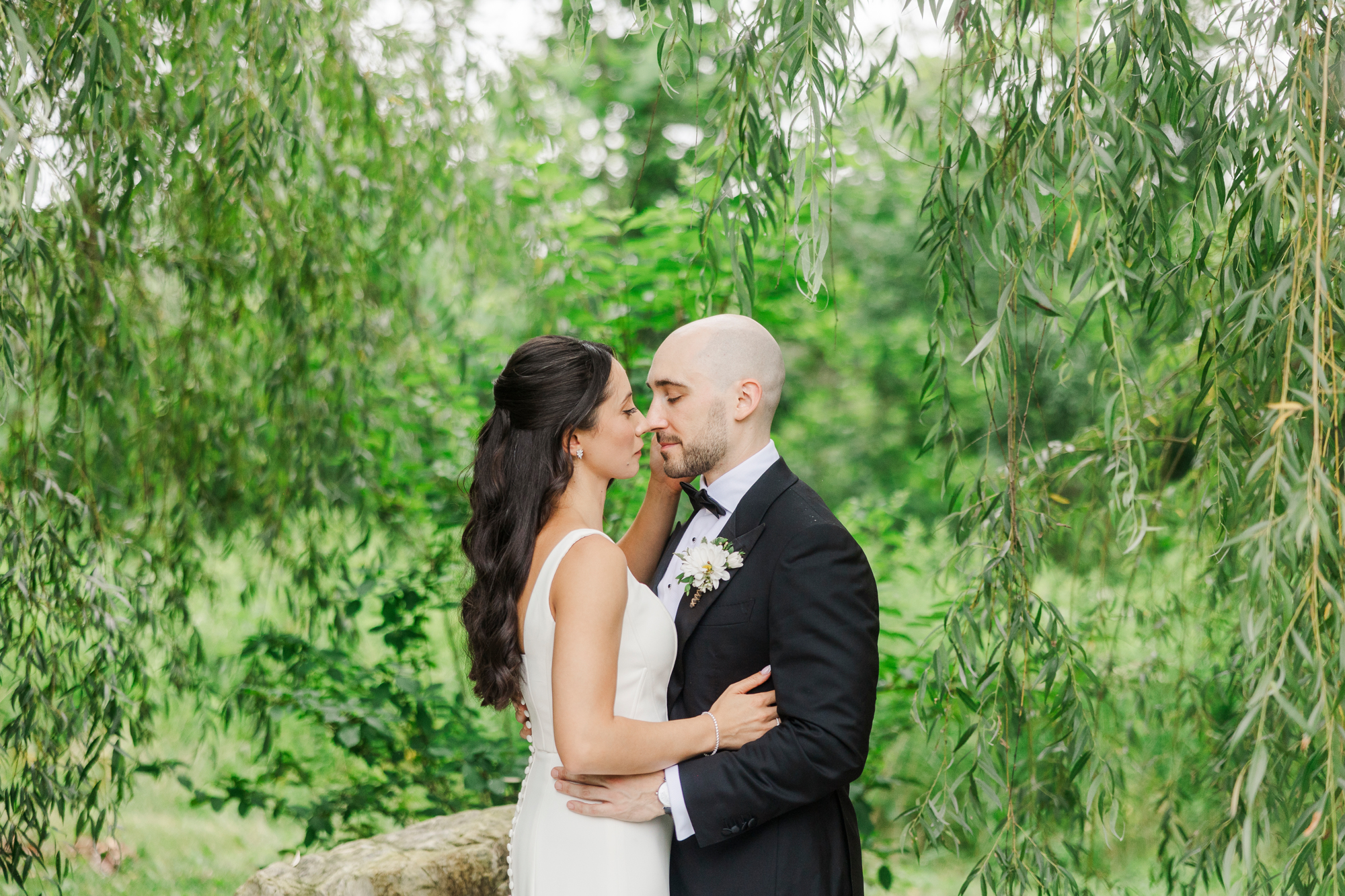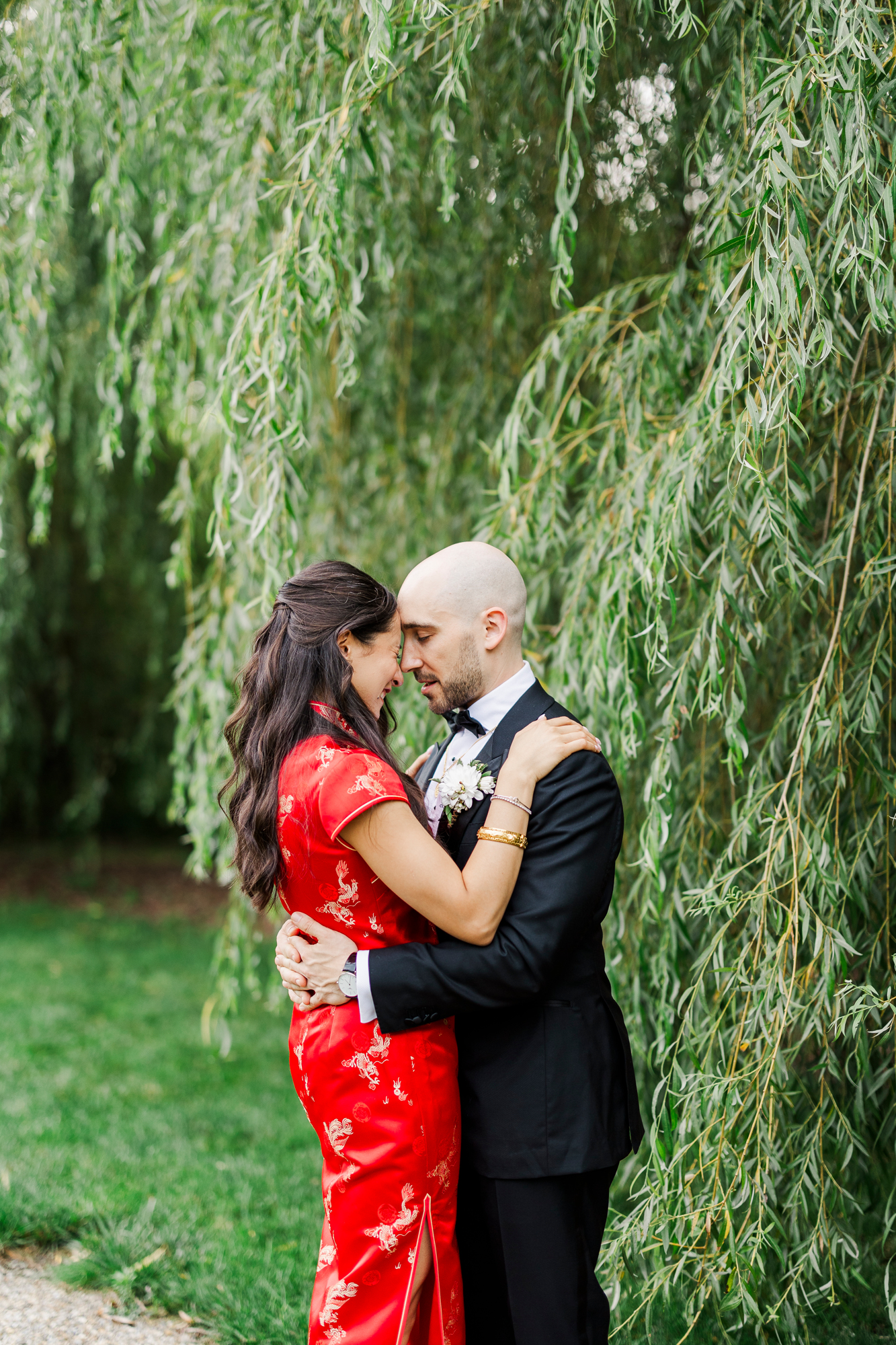 The first look took place in the rain, just outside of the playhouse. We then took the couple outside of the farmhouse for portraits with their umbrella. The rain started to clear up just in time for couples photos within the weeping willow trees. These two then changed for their tea ceremony in the Conservatory.