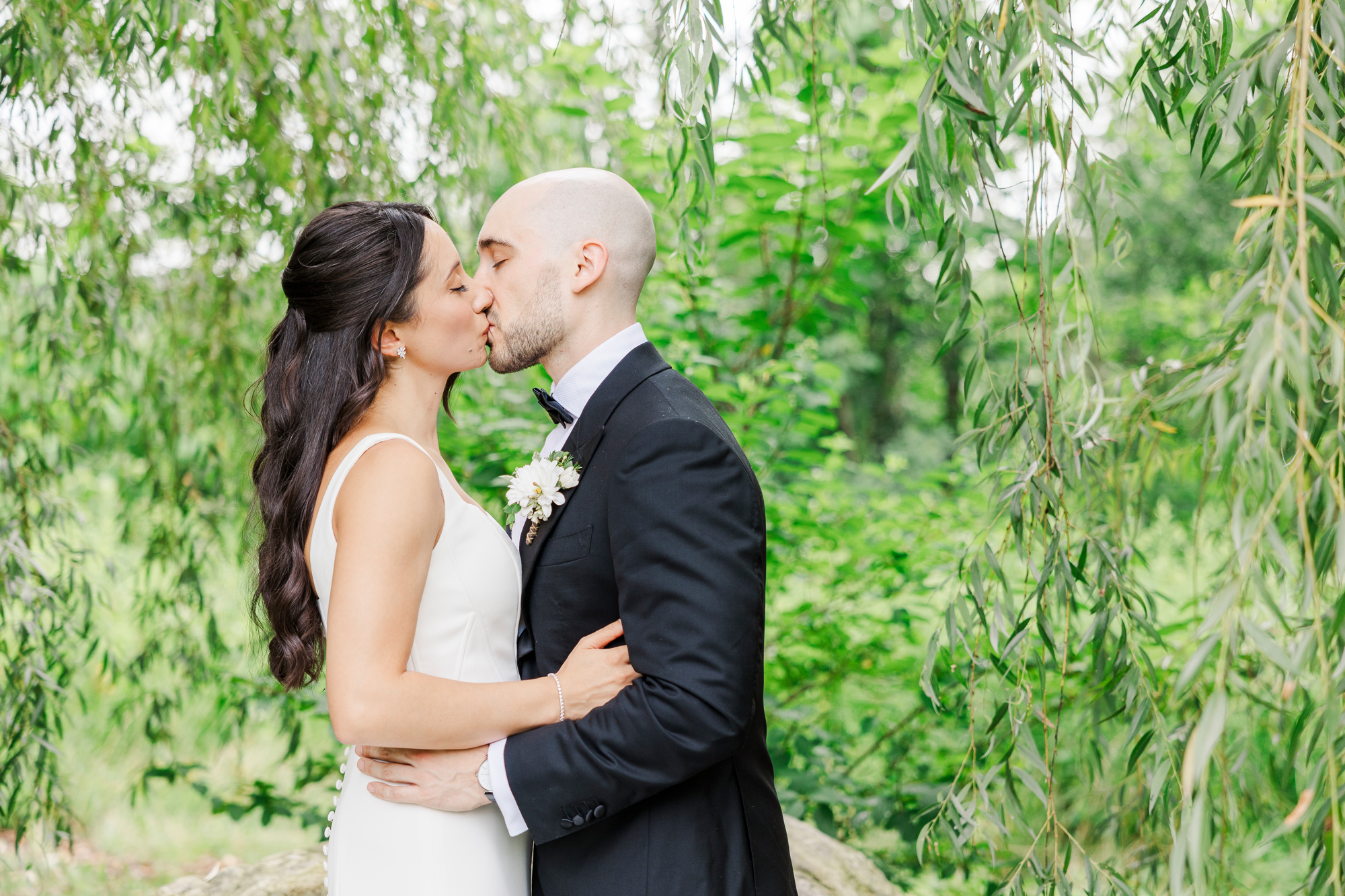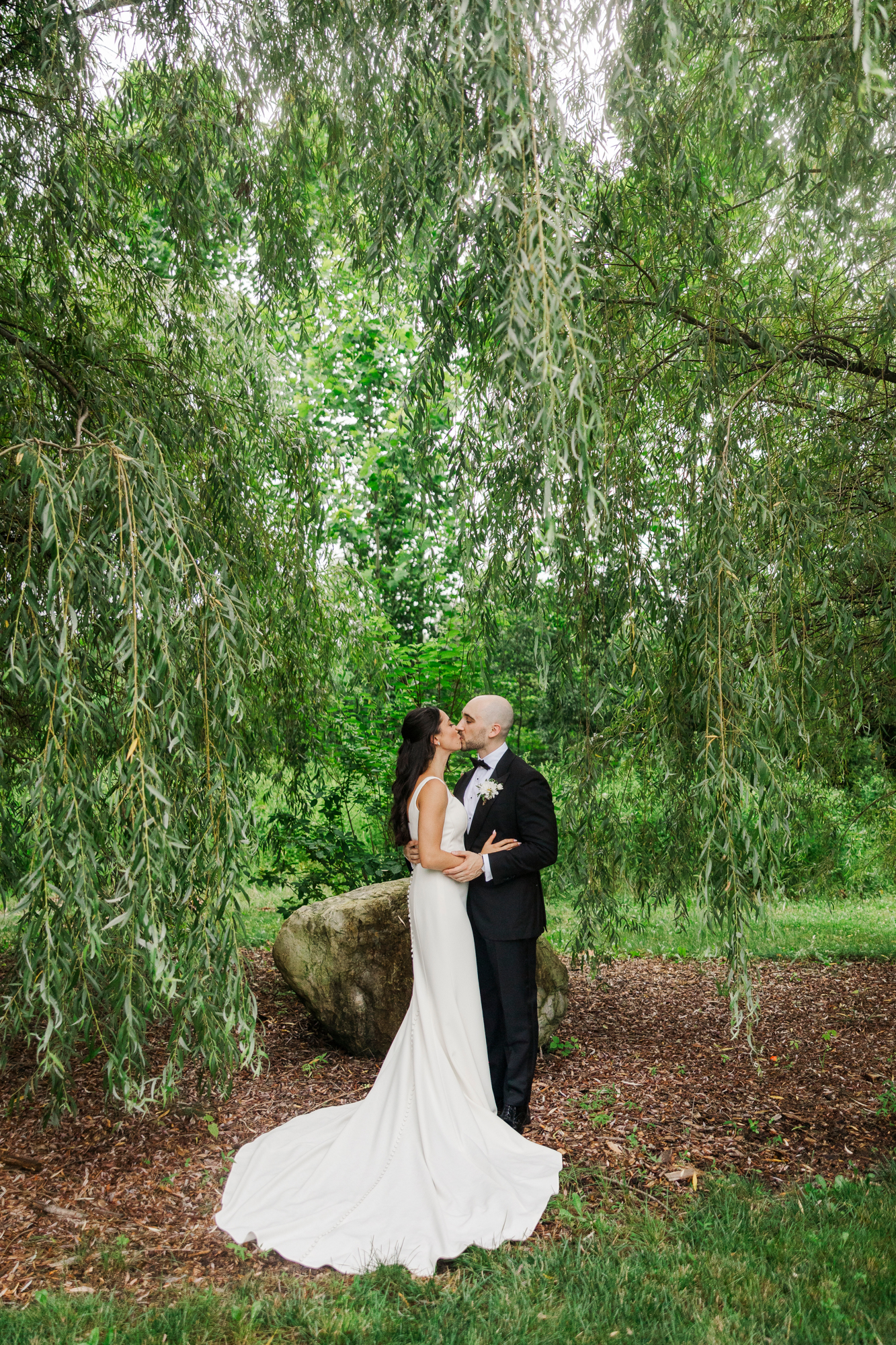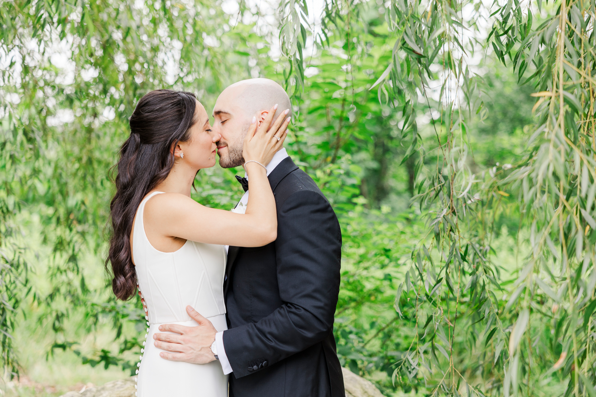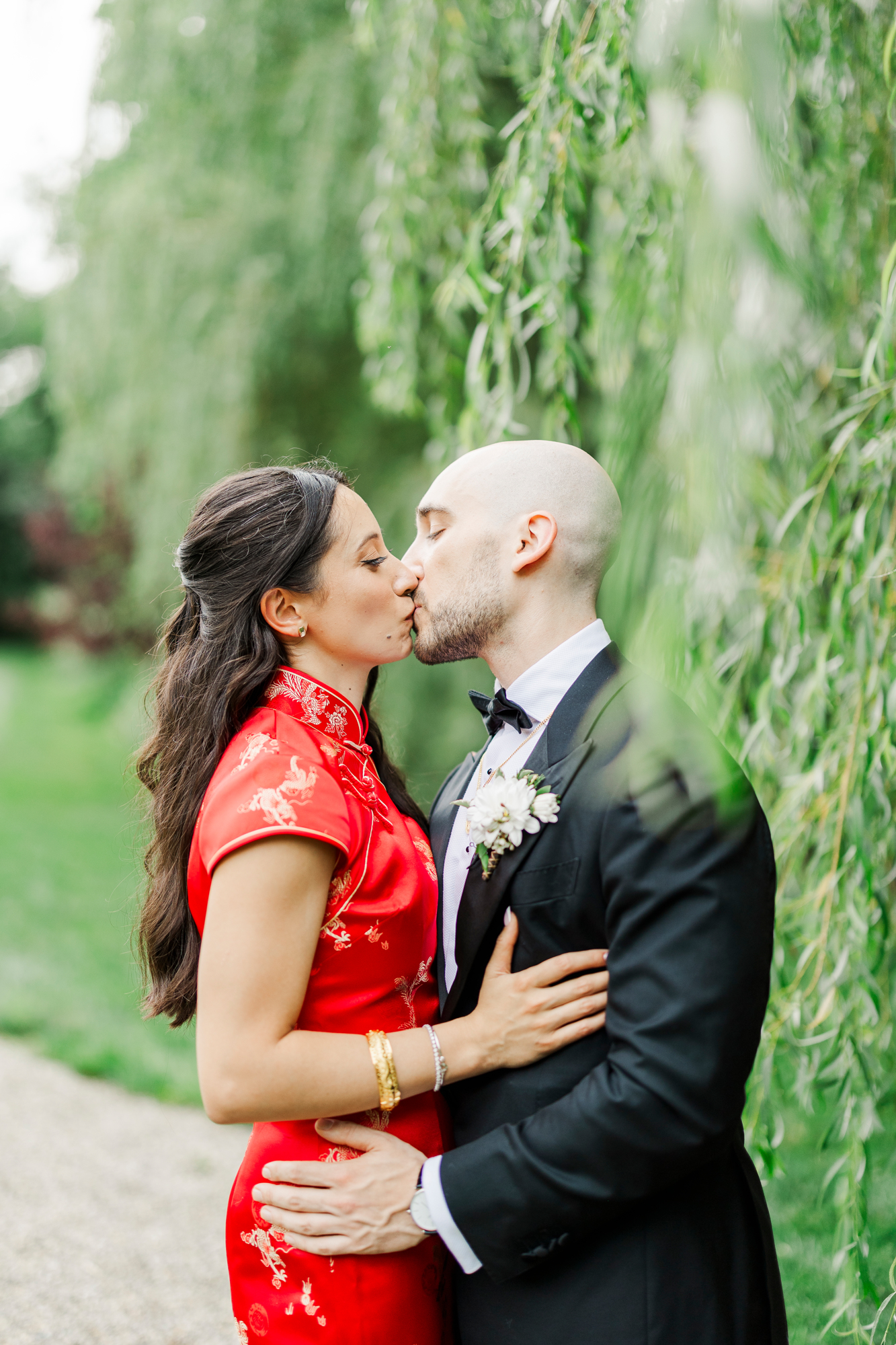 The first look took place in the rain, just outside of the playhouse. We then took the couple outside of the farmhouse for portraits with their umbrella. The rain started to clear up just in time for couples photos within the weeping willow trees. These two then changed for their tea ceremony in the Conservatory.