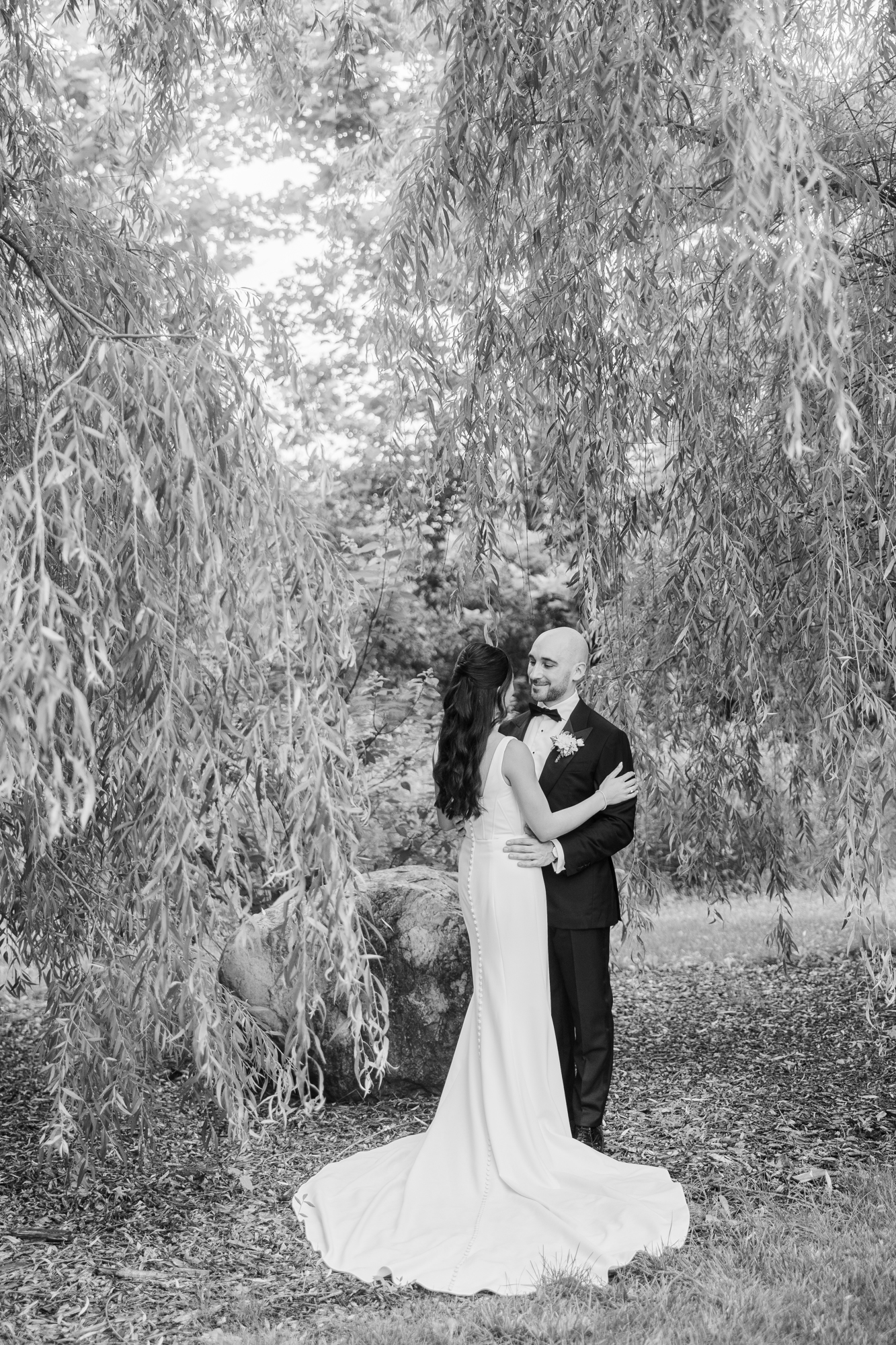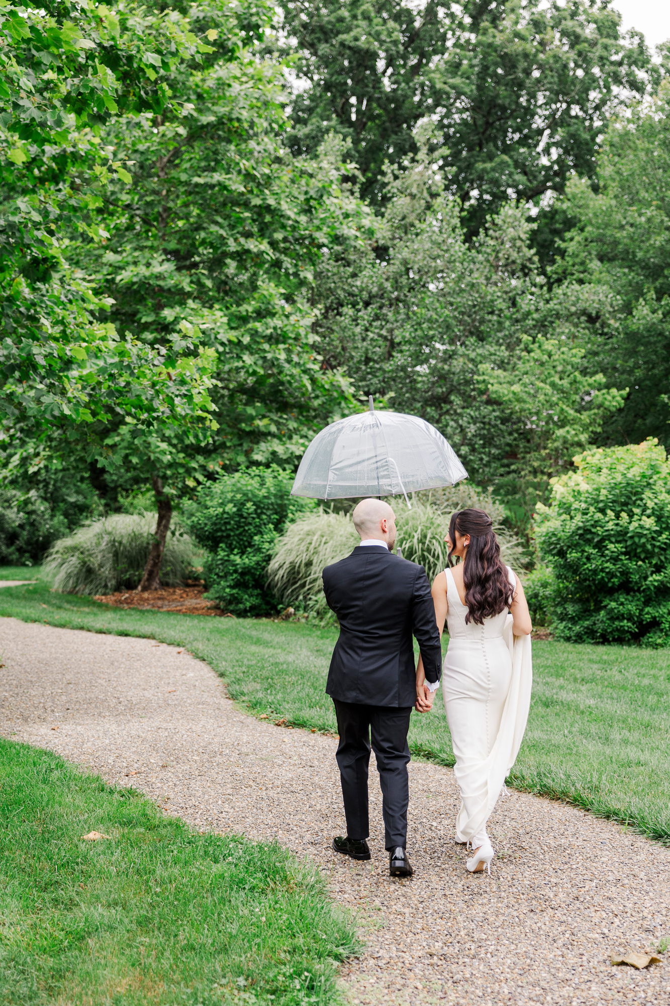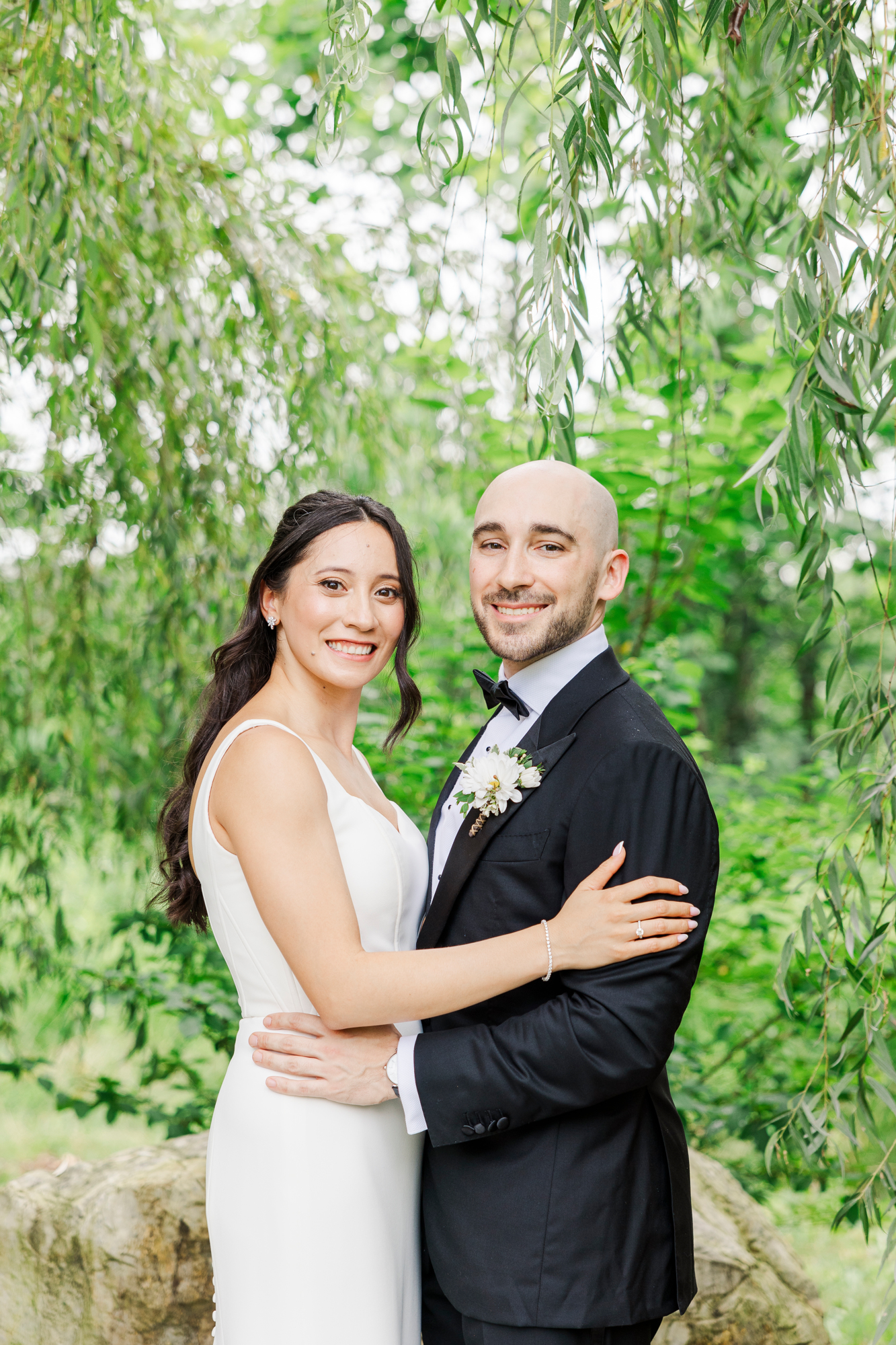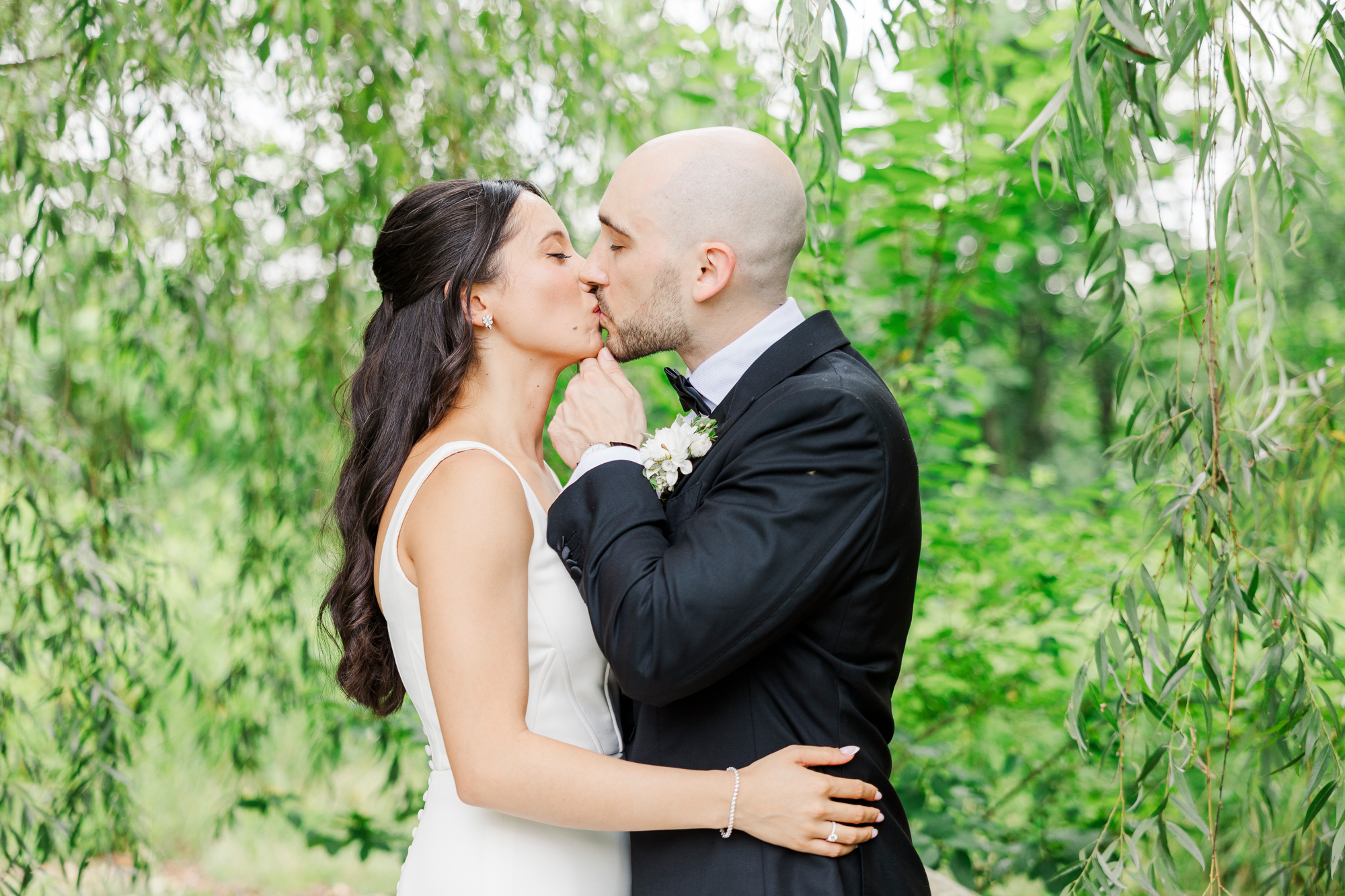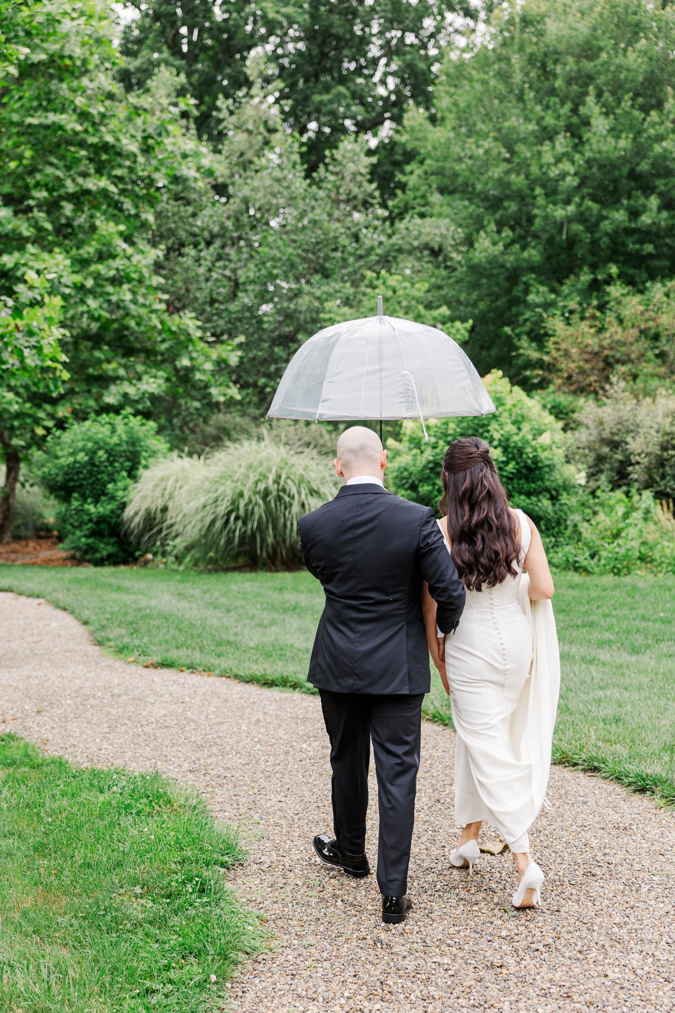 The first look took place in the rain, just outside of the playhouse. We then took the couple outside of the farmhouse for portraits with their umbrella. The rain started to clear up just in time for couples photos within the weeping willow trees. These two then changed for their tea ceremony in the Conservatory.