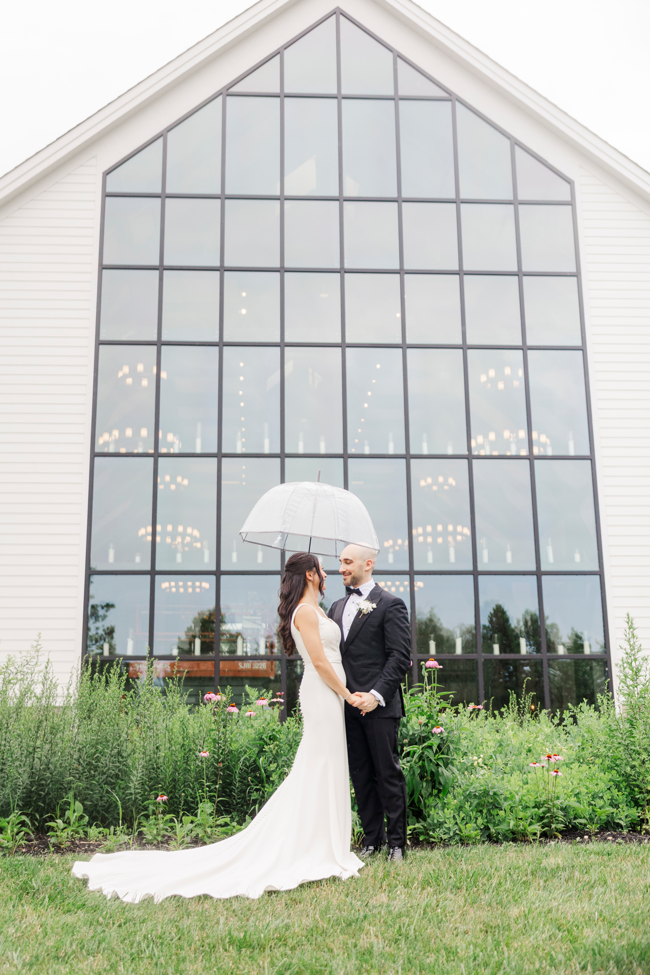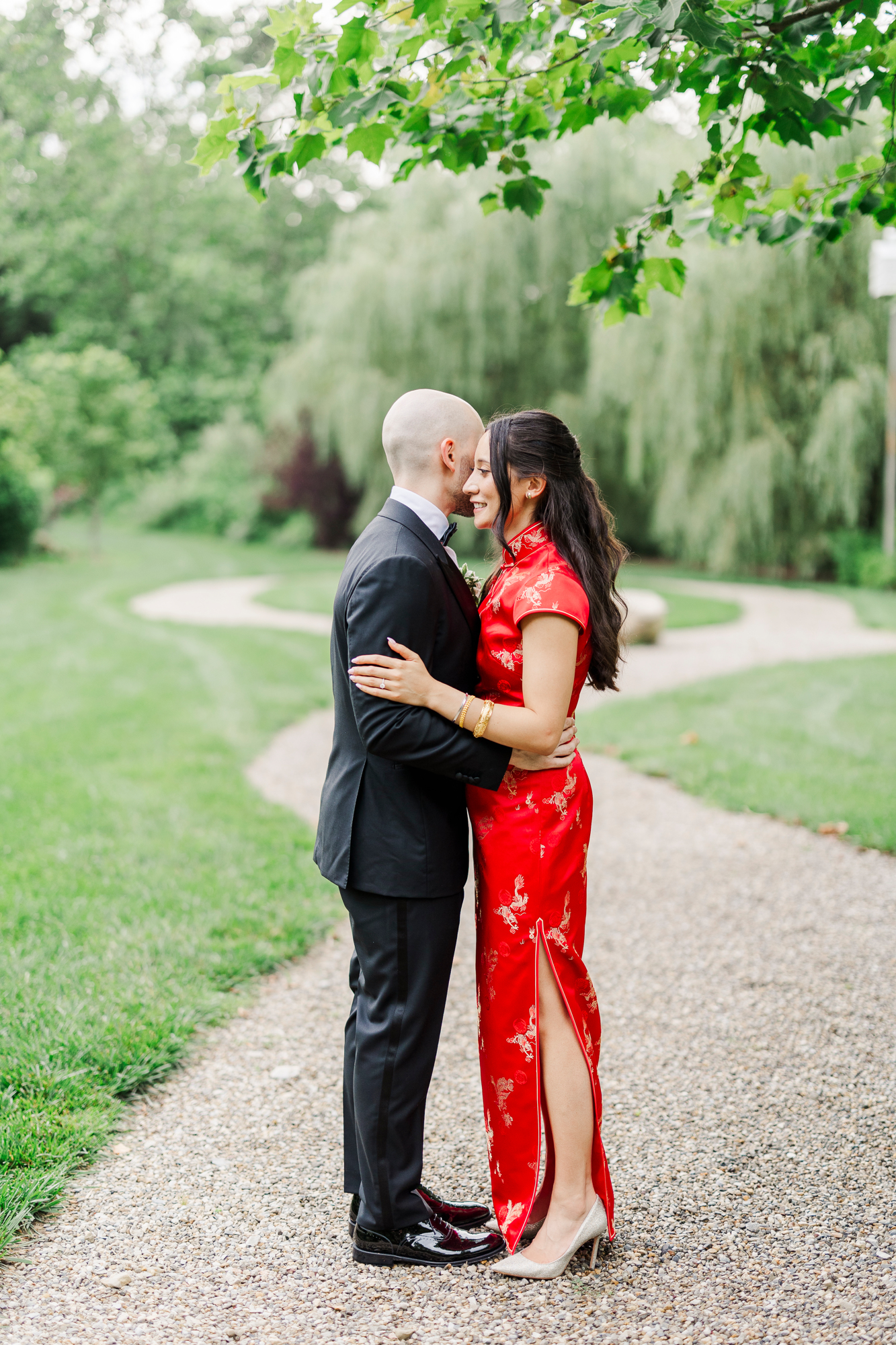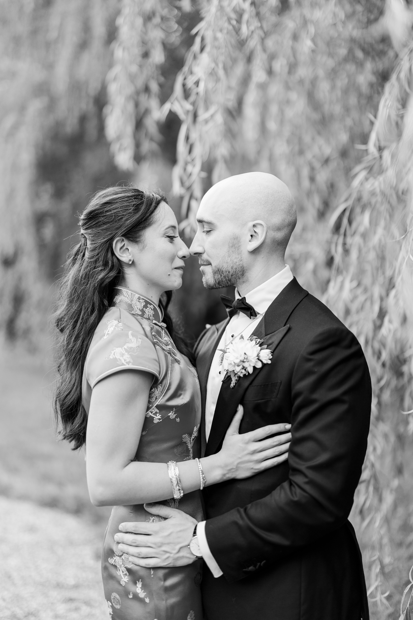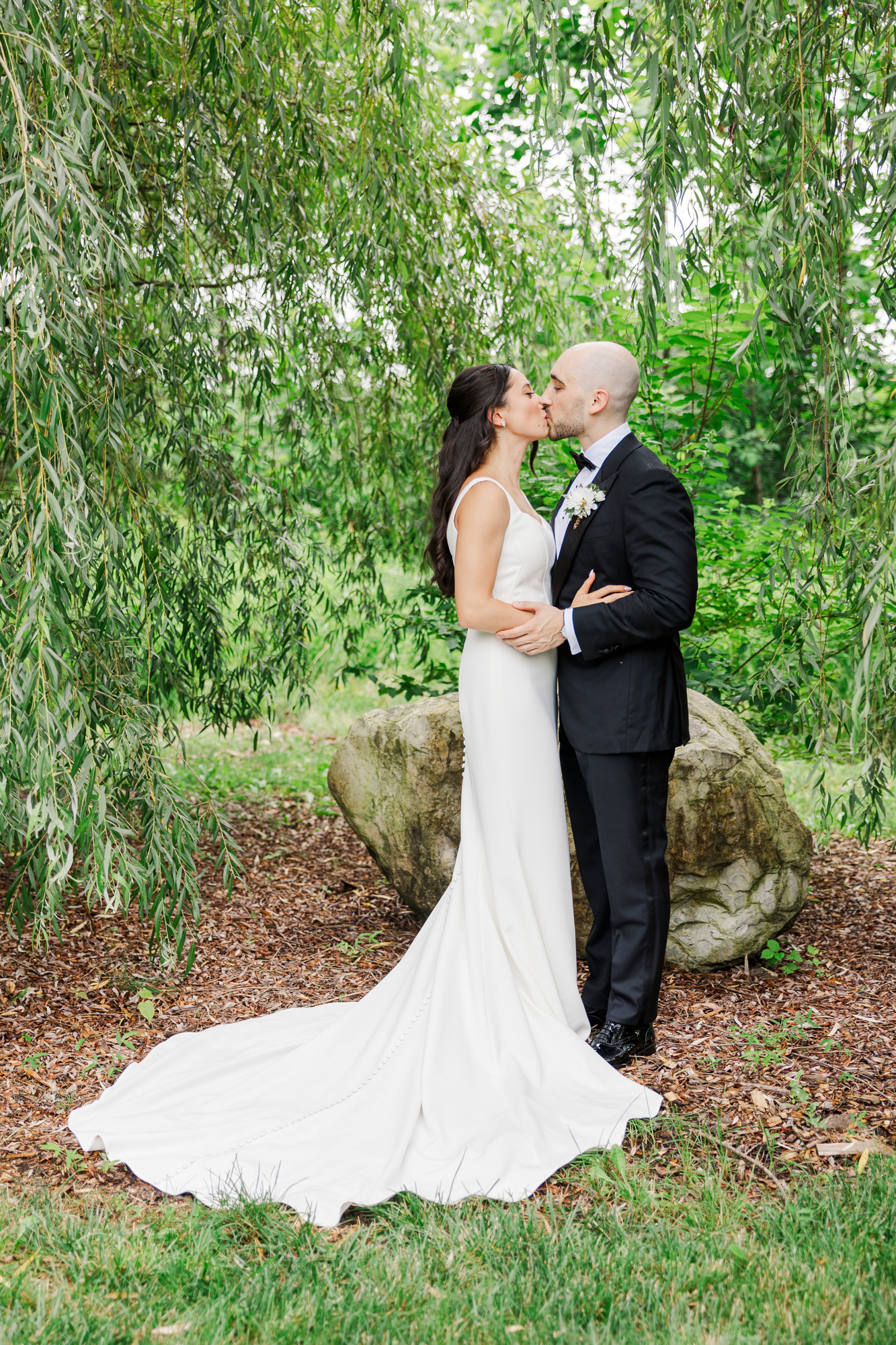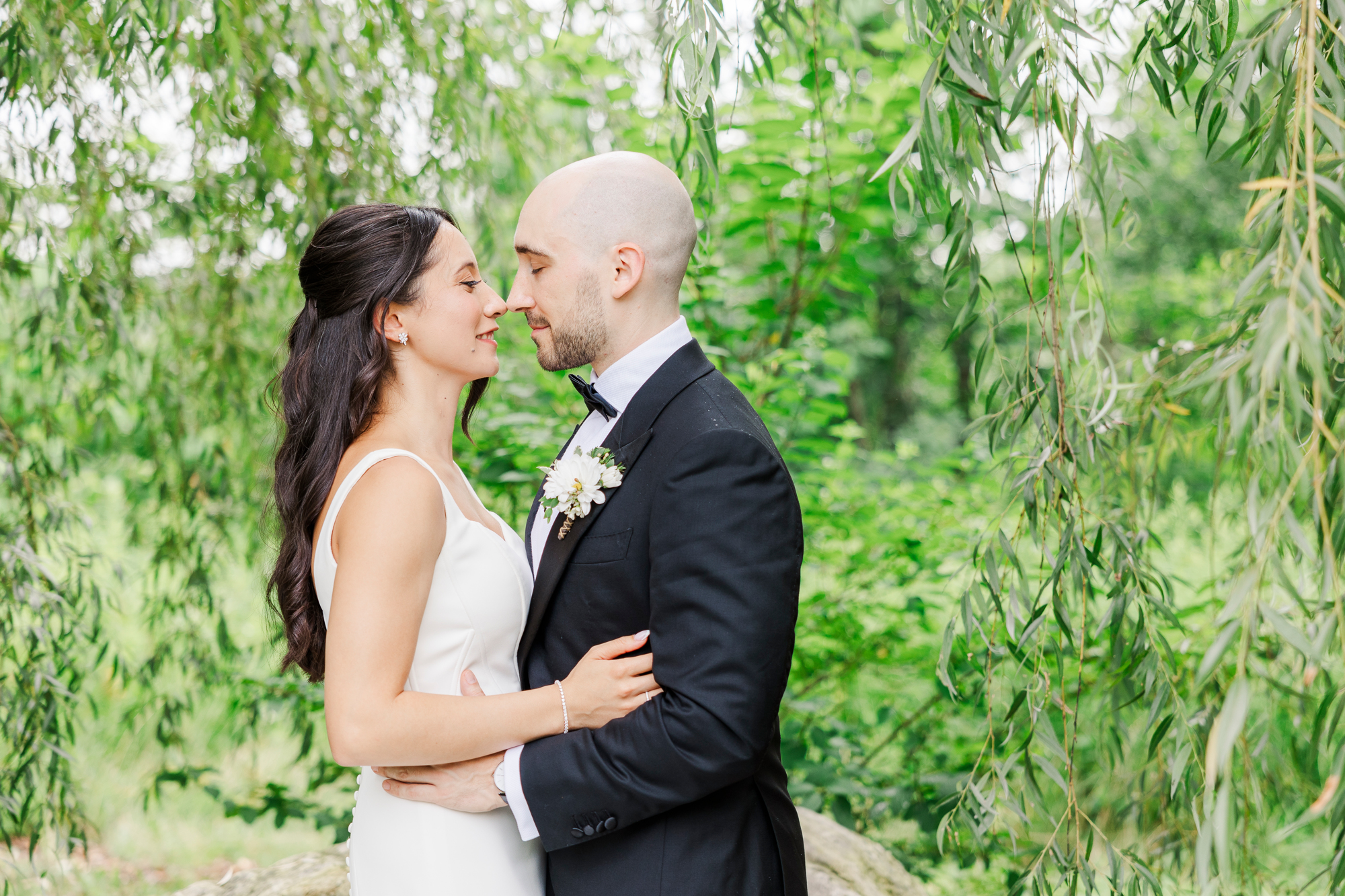 The first look took place in the rain, just outside of the playhouse. We then took the couple outside of the farmhouse for portraits with their umbrella. The rain started to clear up just in time for couples photos within the weeping willow trees. These two then changed for their tea ceremony in the Conservatory.