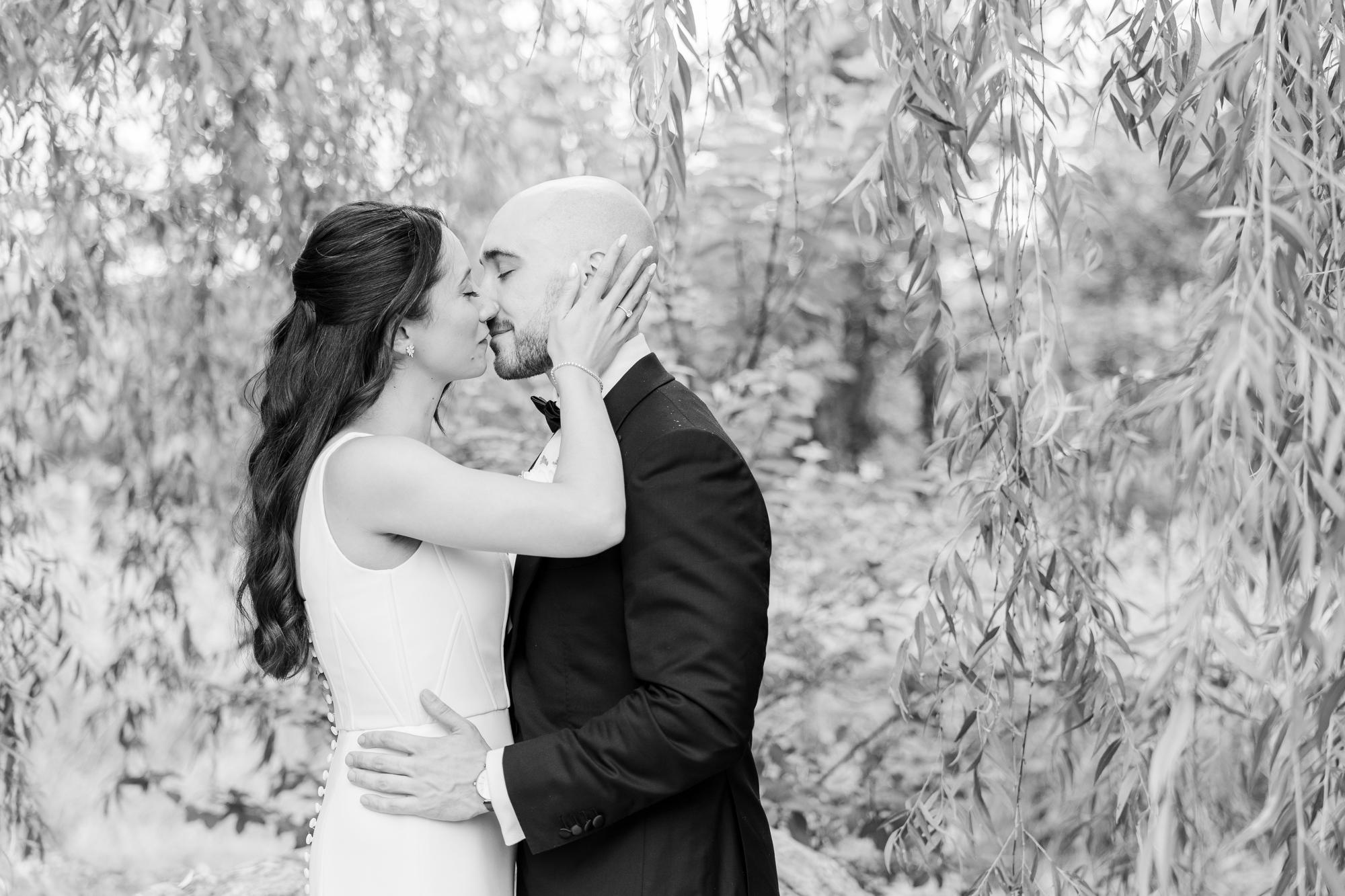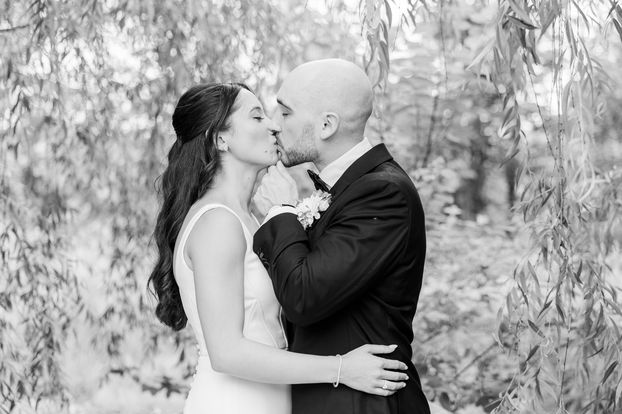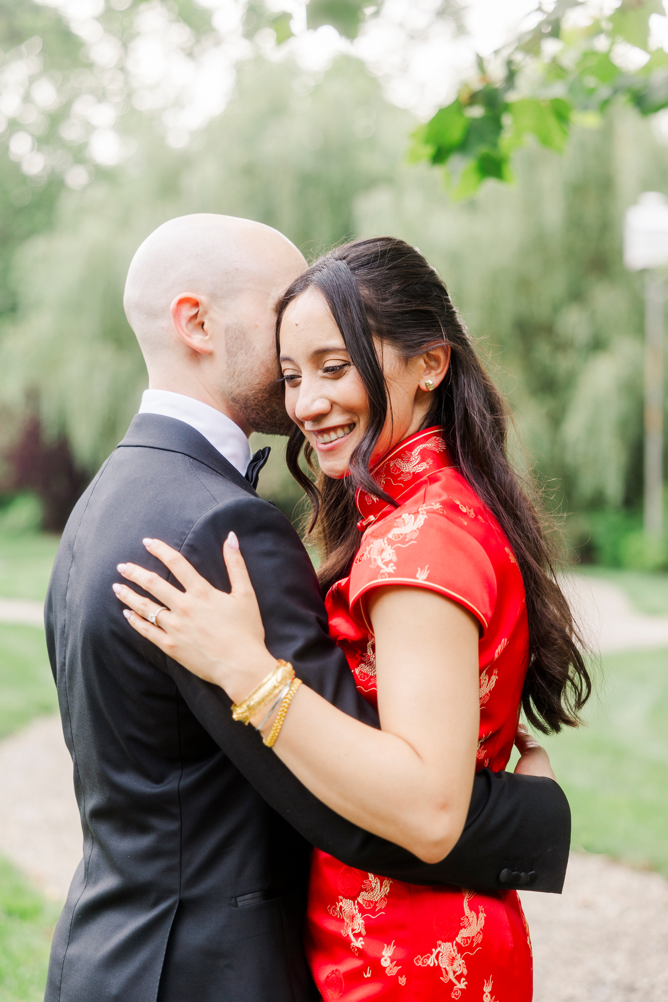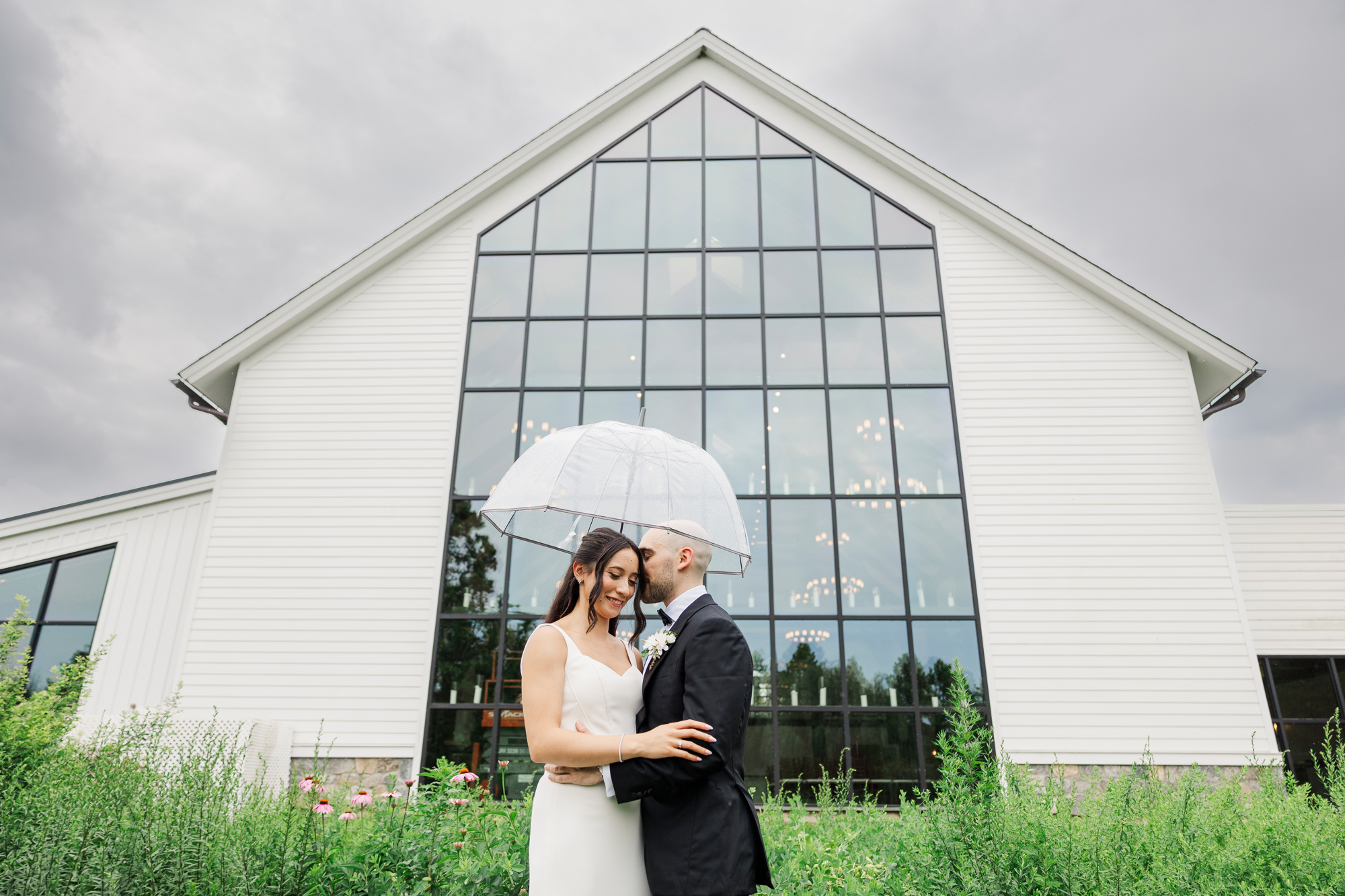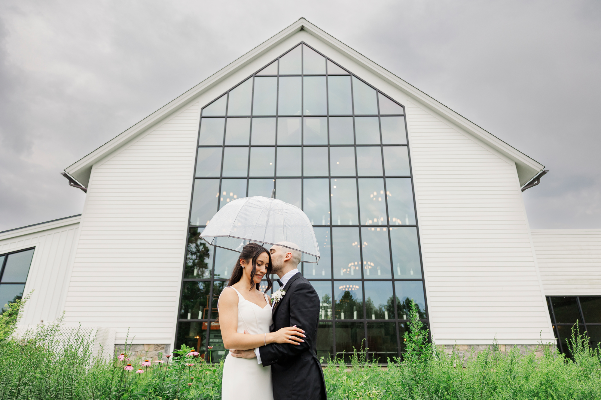 The first look took place in the rain, just outside of the playhouse. We then took the couple outside of the farmhouse for portraits with their umbrella. The rain started to clear up just in time for couples photos within the weeping willow trees. These two then changed for their tea ceremony in the Conservatory.