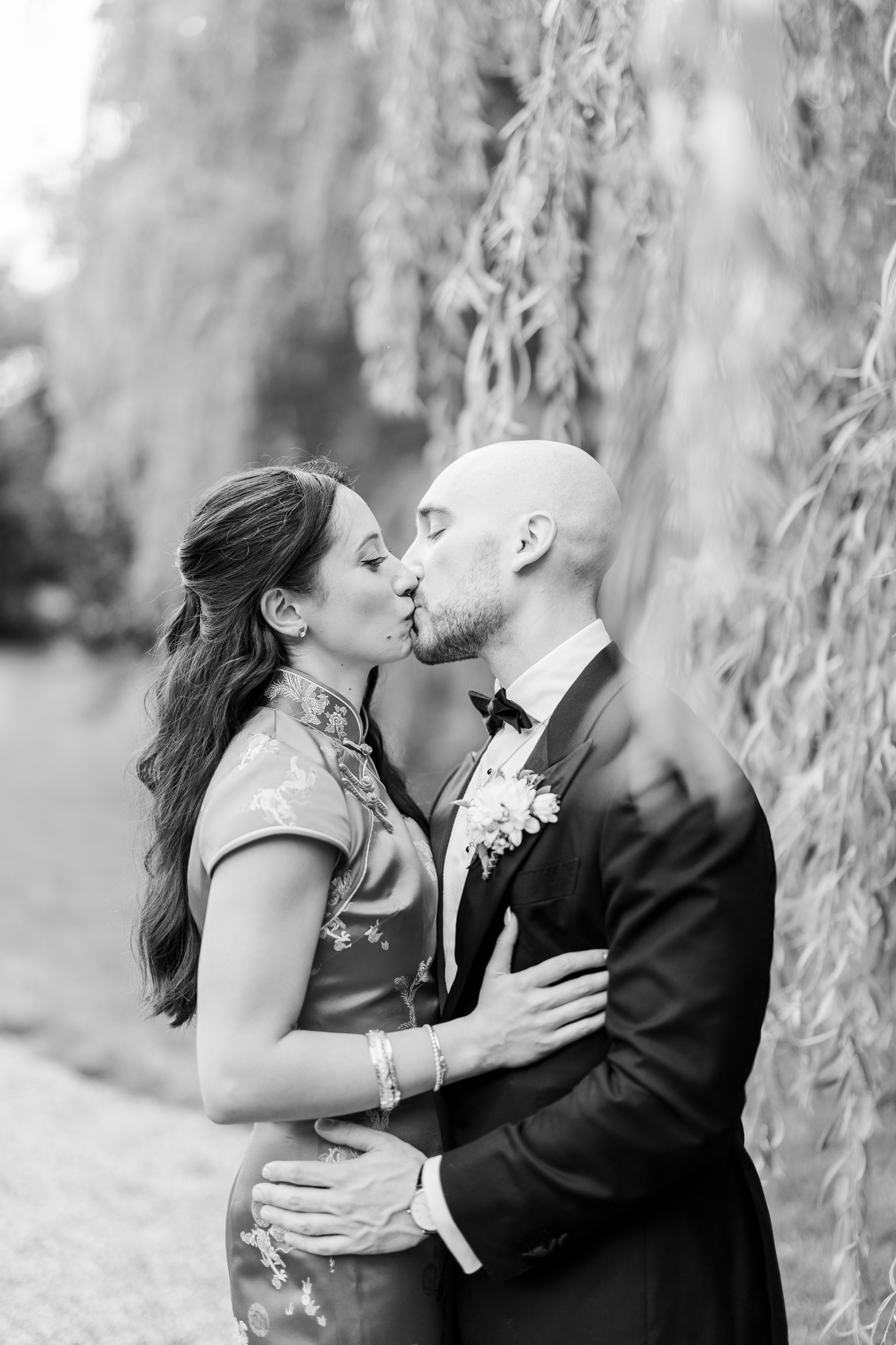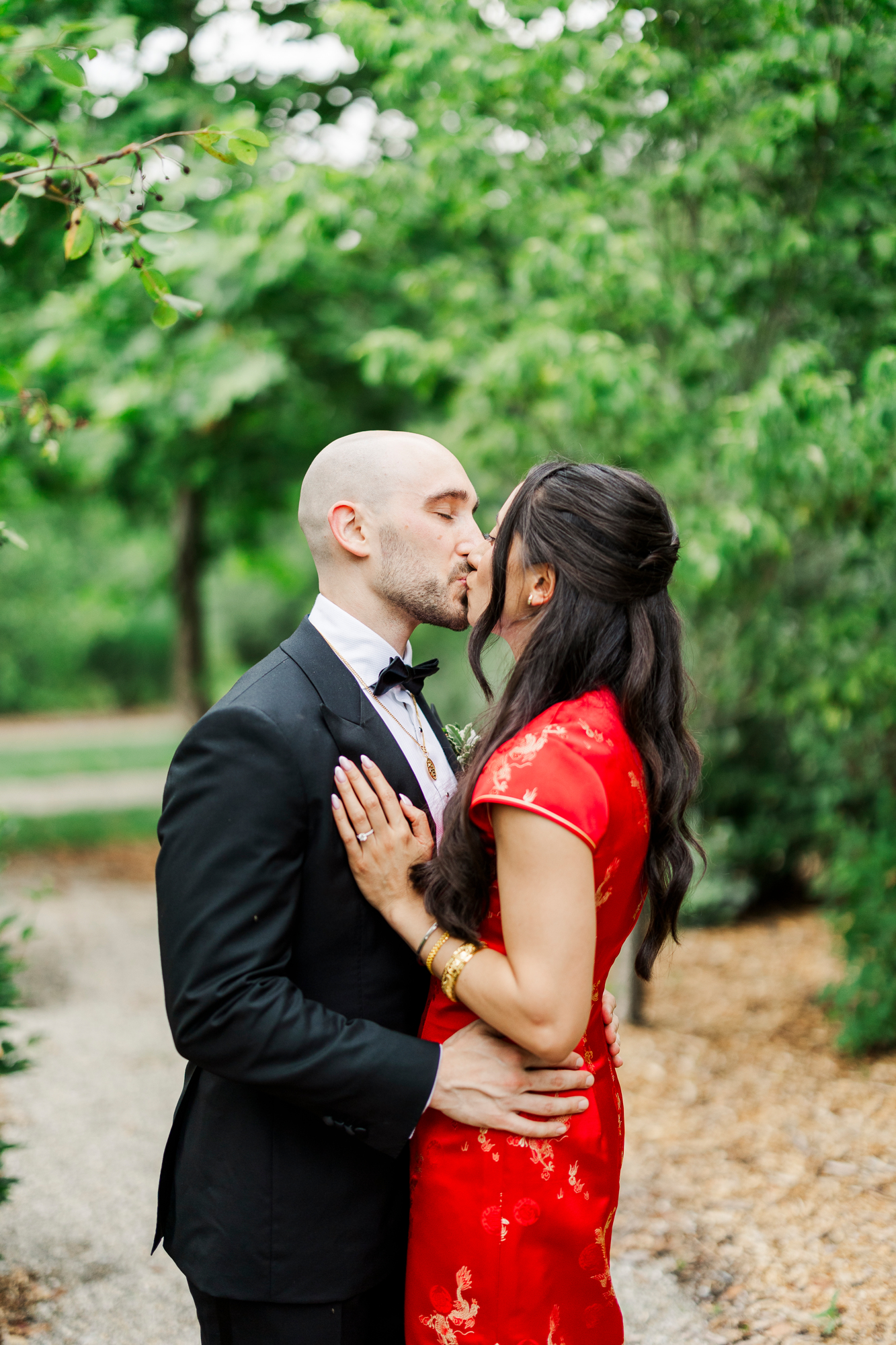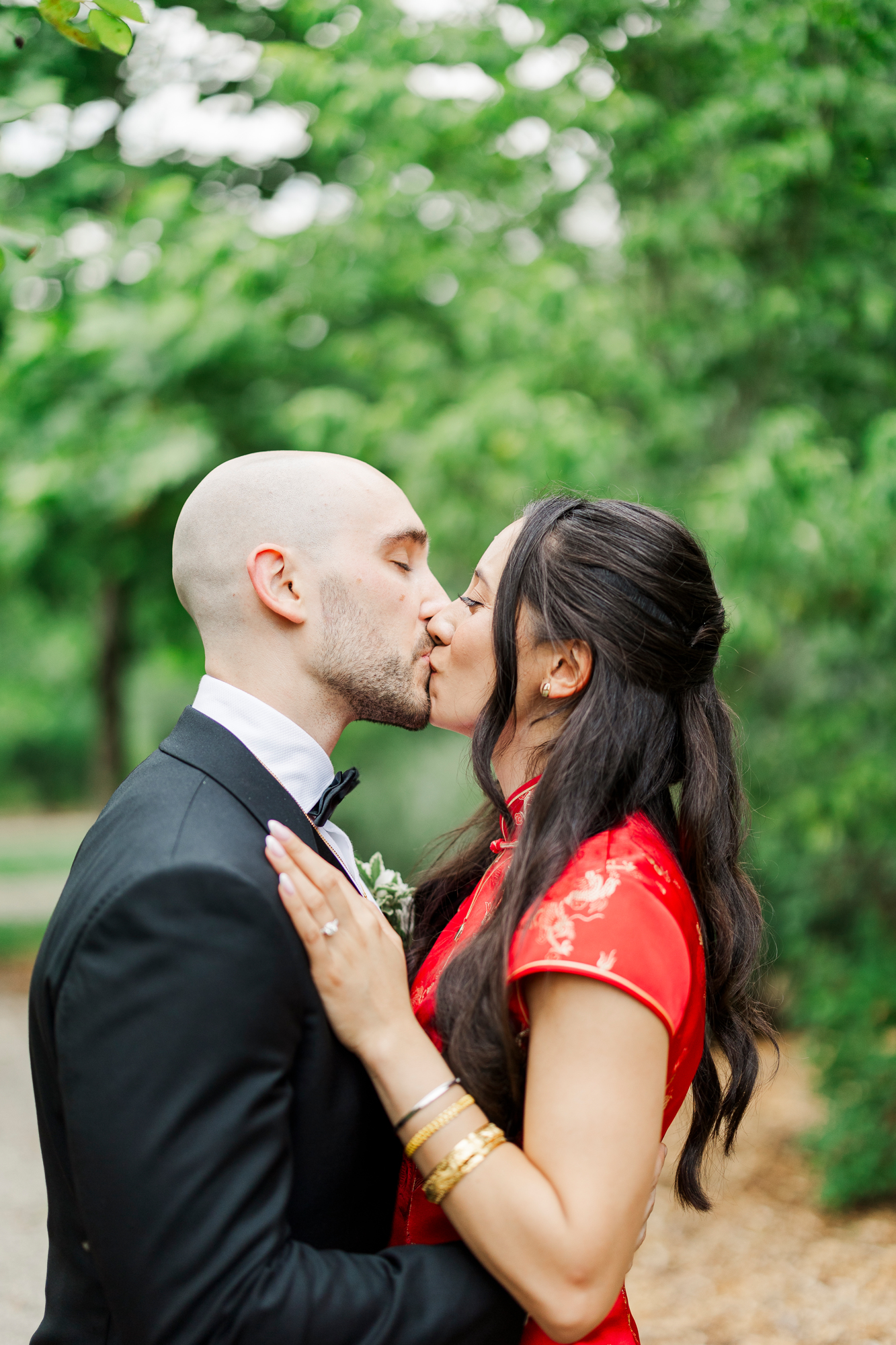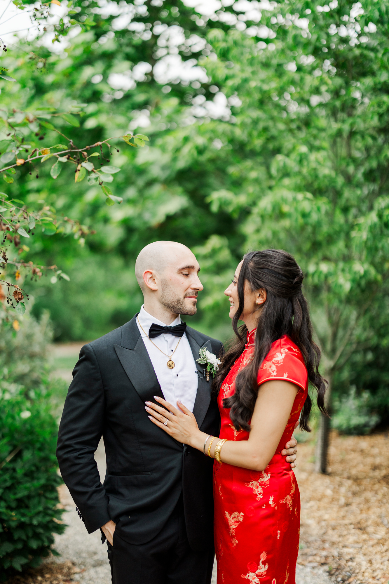 The first look took place in the rain, just outside of the playhouse. We then took the couple outside of the farmhouse for portraits with their umbrella. The rain started to clear up just in time for couples photos within the weeping willow trees. These two then changed for their tea ceremony in the Conservatory.