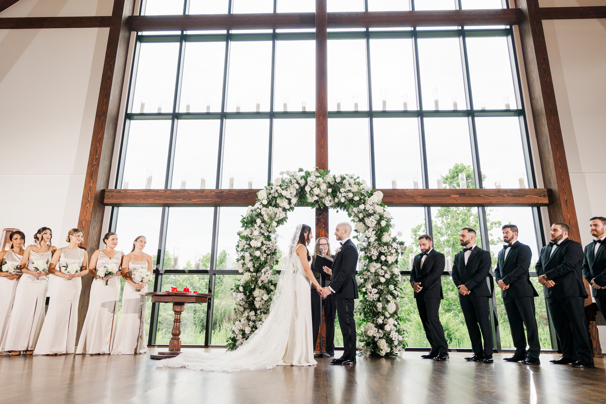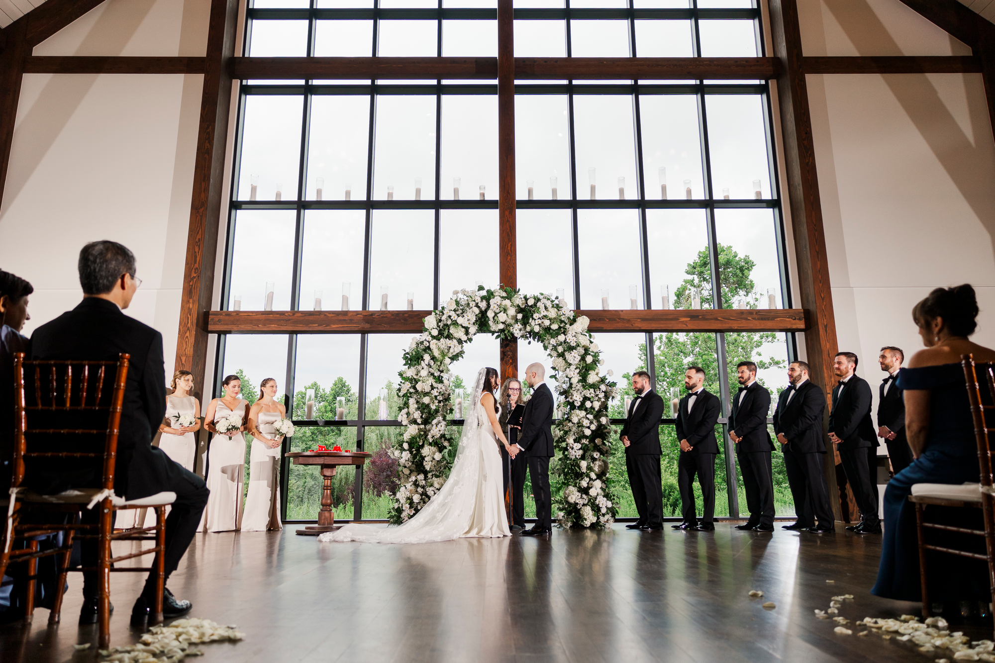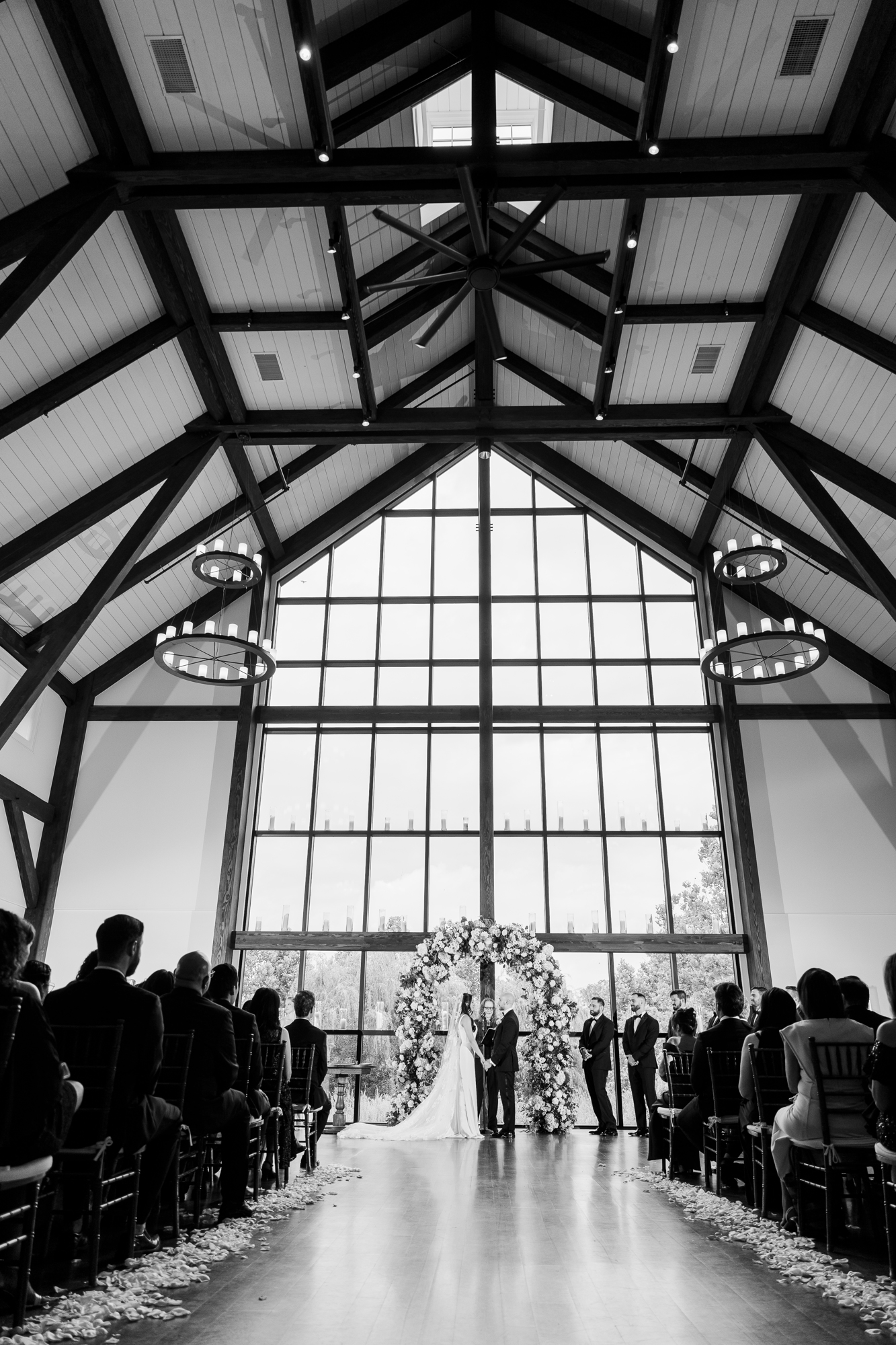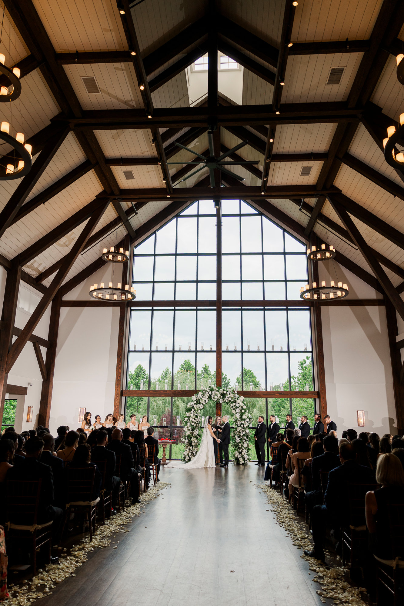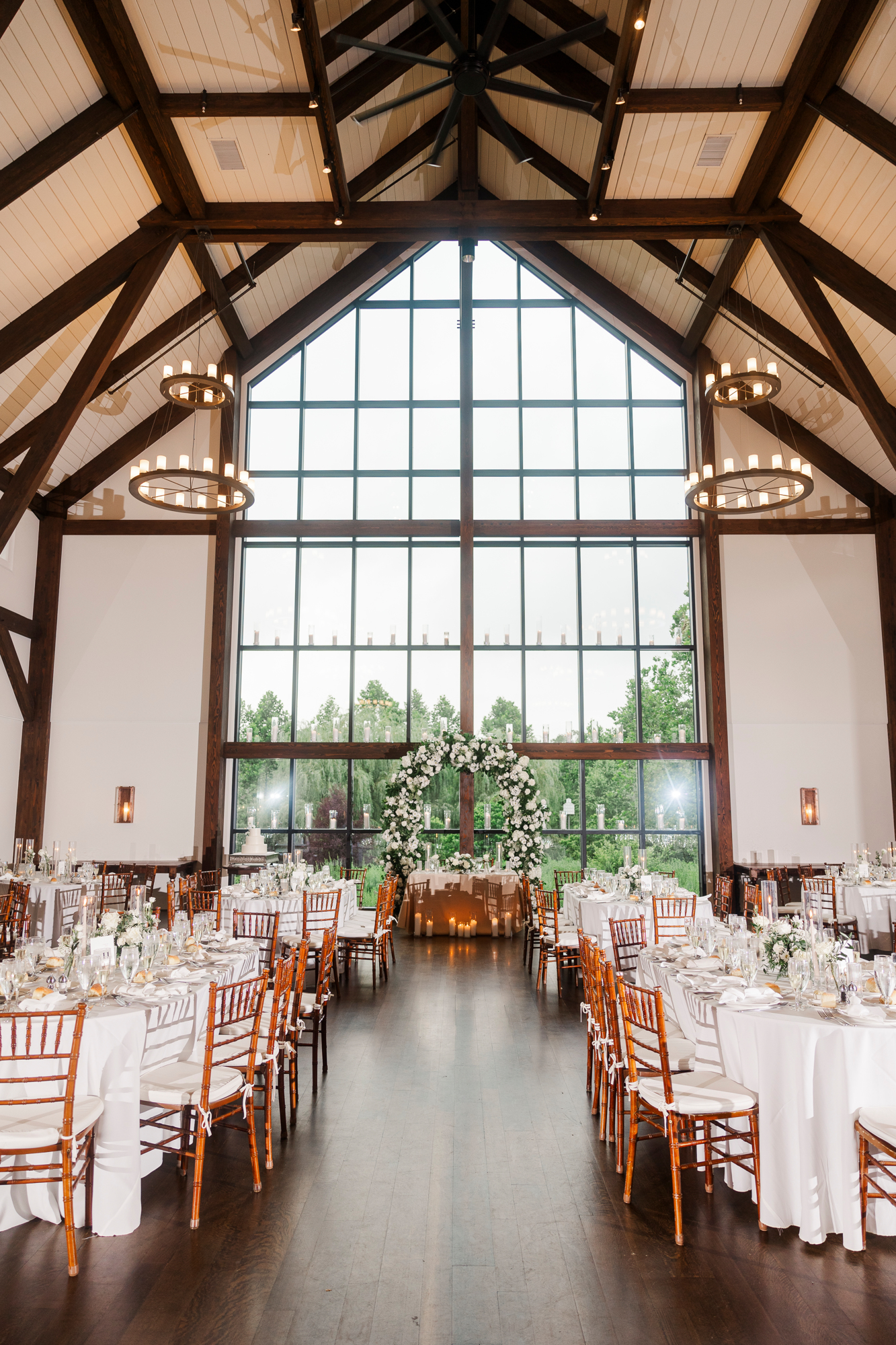 The farmhouse reception space features floor to ceiling glass walls that bring in natural light as the sun sets. Once the sun goes down, you can tell it’s time to party. From weddings for 100 guests to almost 300, this venue is 30 acres of beauty. It’s the perfect place to have a blast with your friends, family, and wedding party.