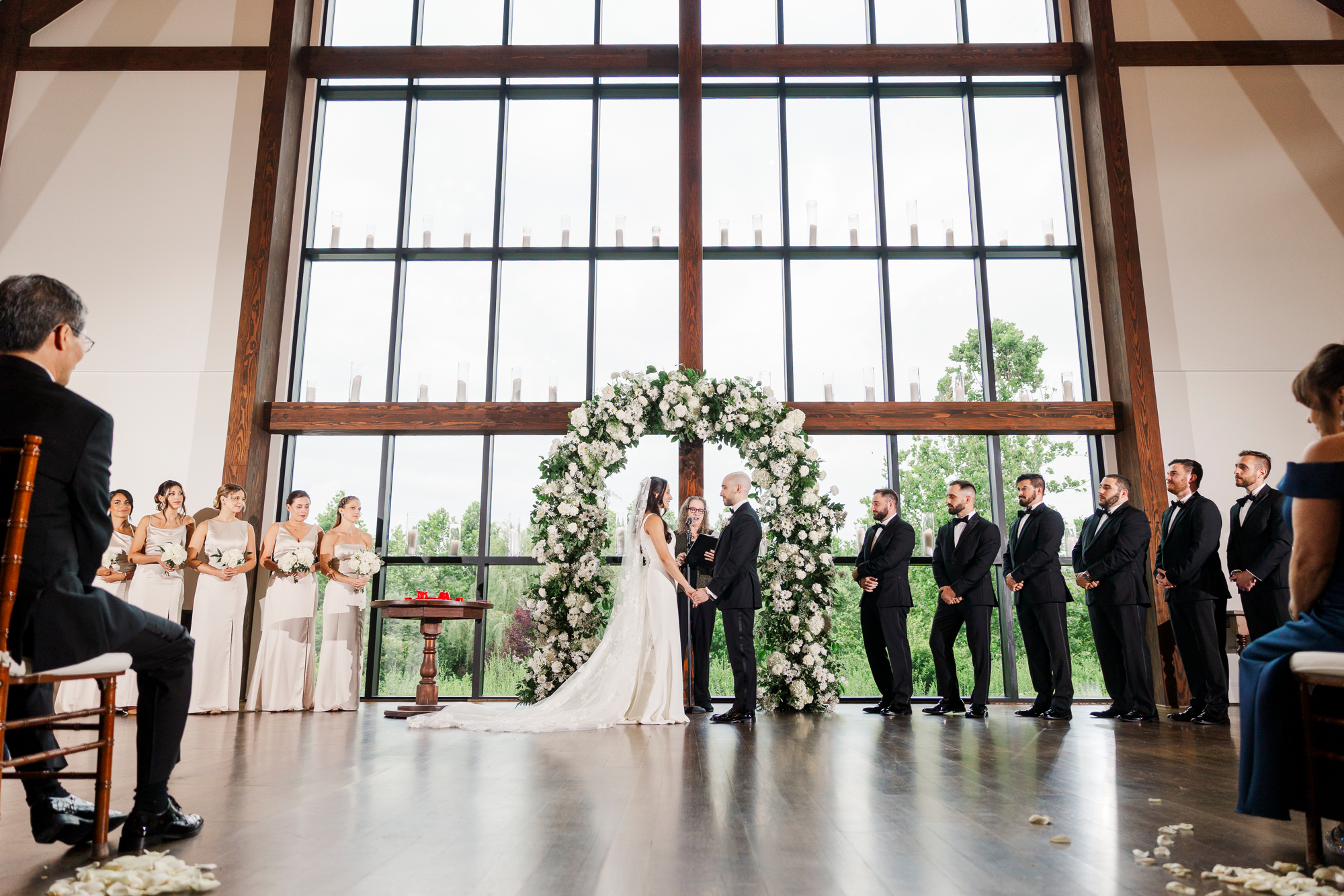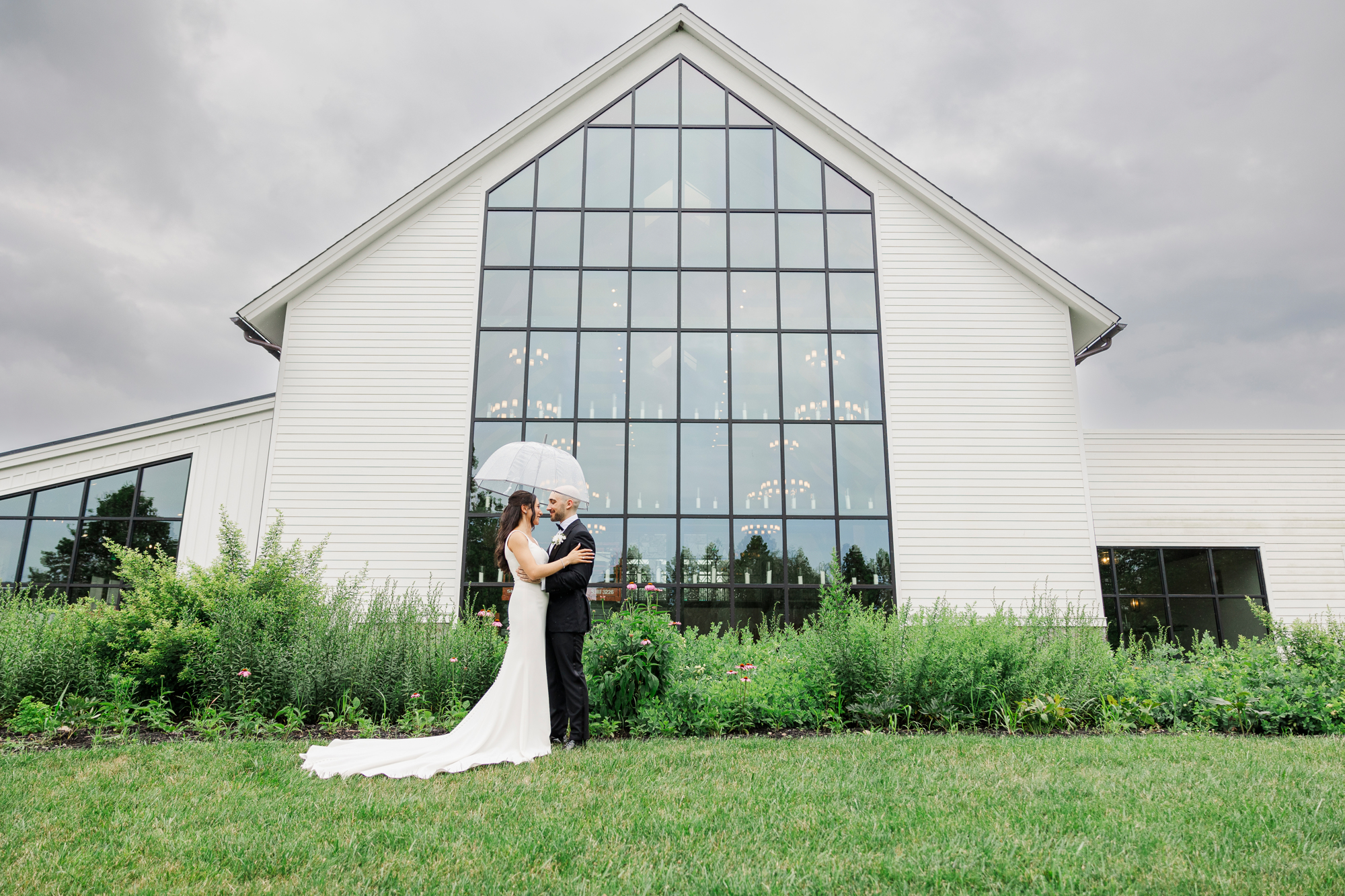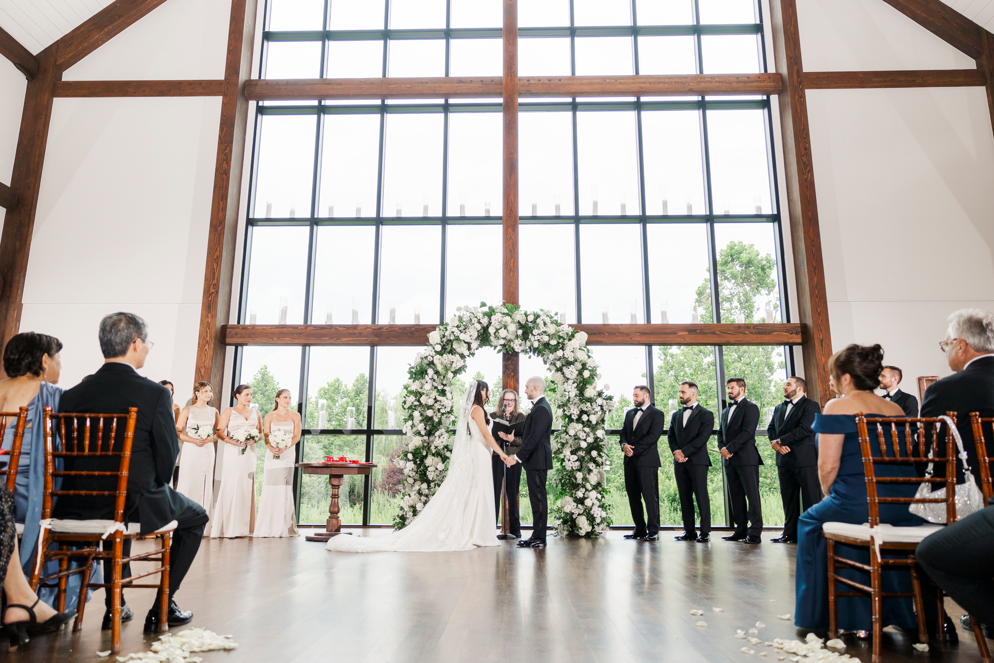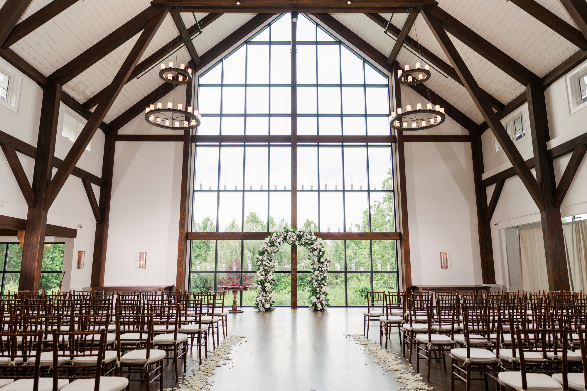 The farmhouse reception space features floor to ceiling glass walls that bring in natural light as the sun sets. Once the sun goes down, you can tell it’s time to party. From weddings for 100 guests to almost 300, this venue is 30 acres of beauty. It’s the perfect place to have a blast with your friends, family, and wedding party.