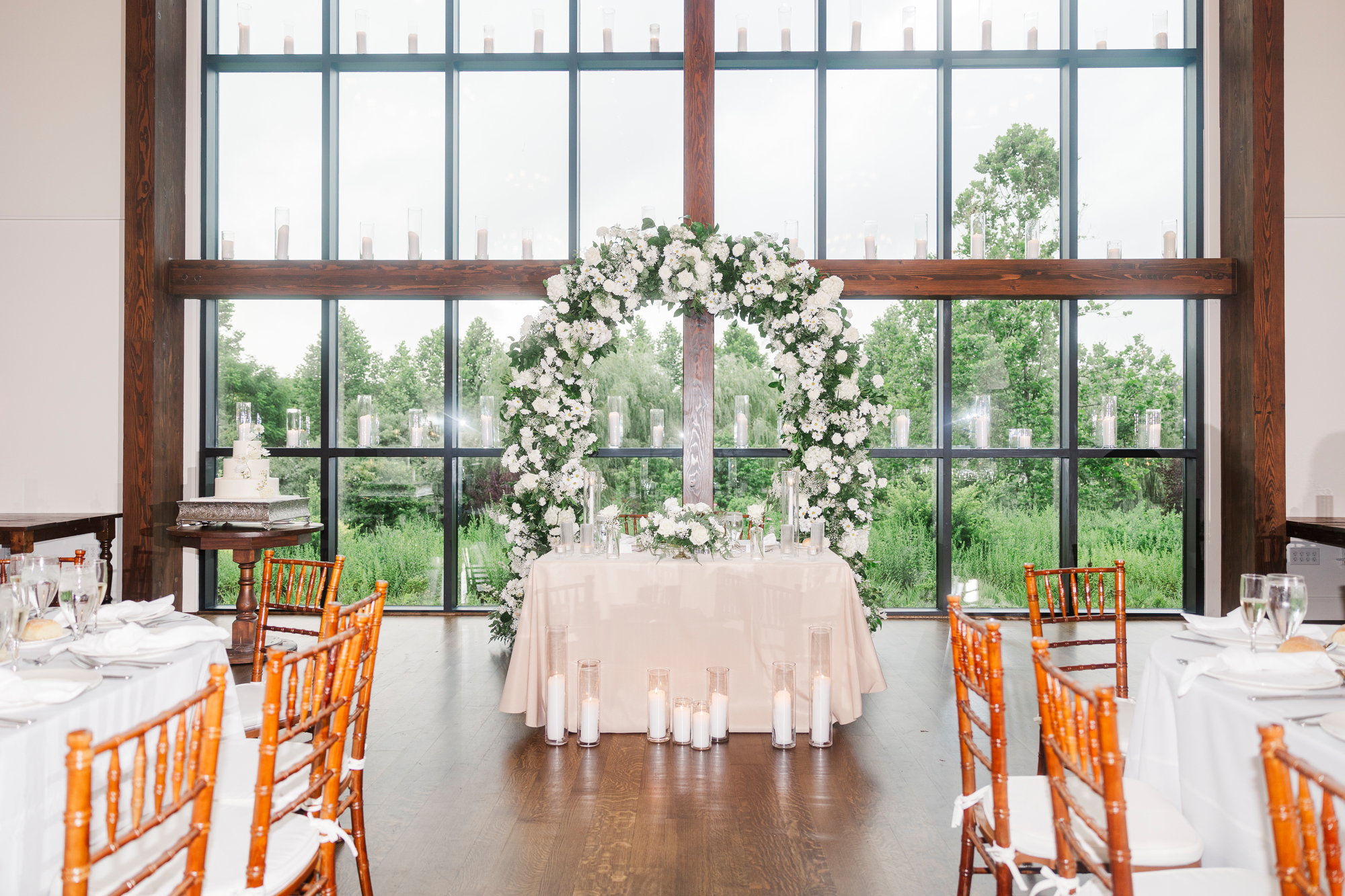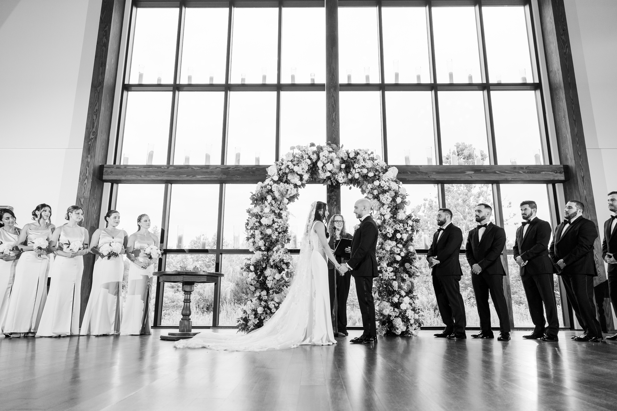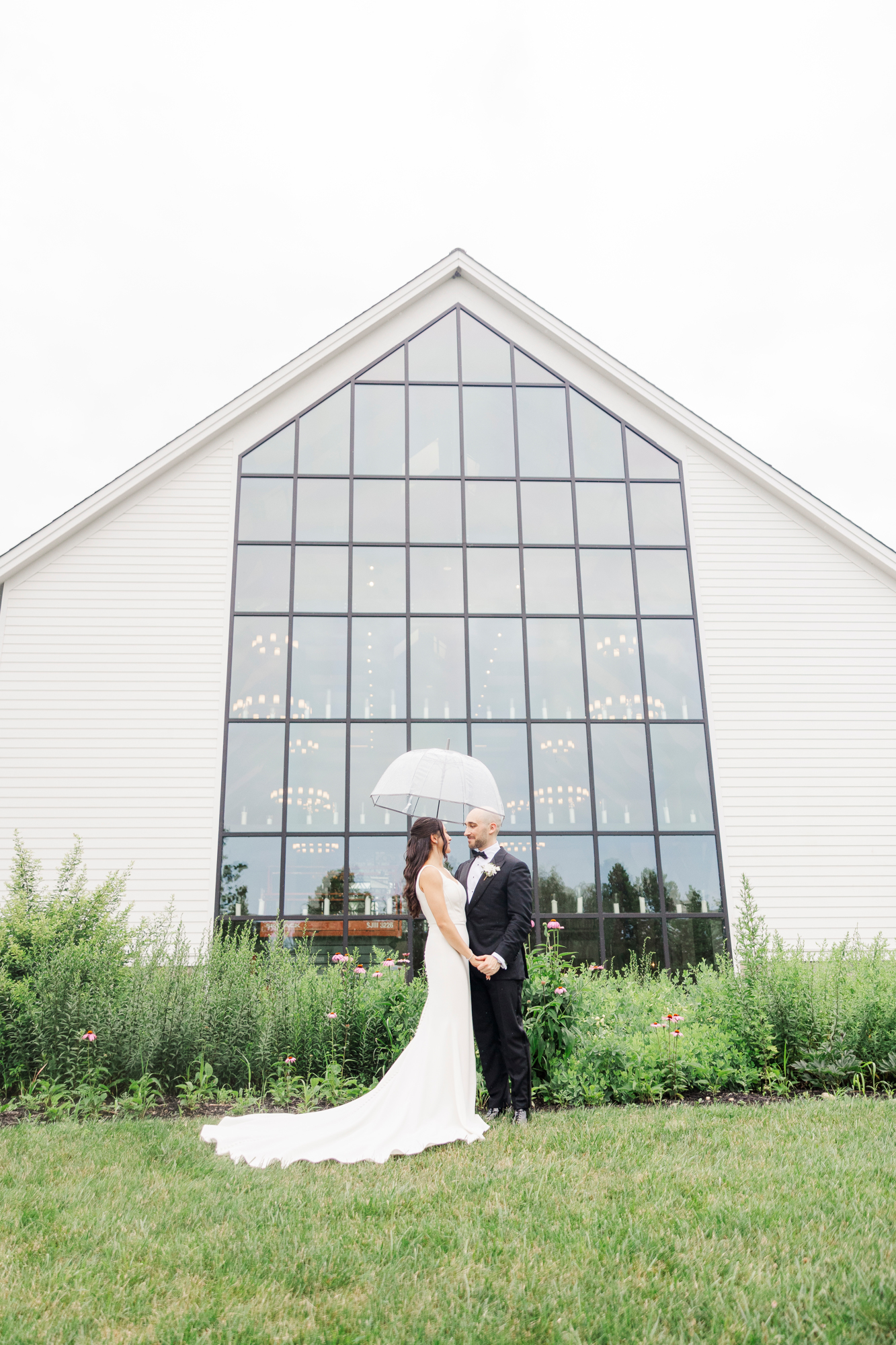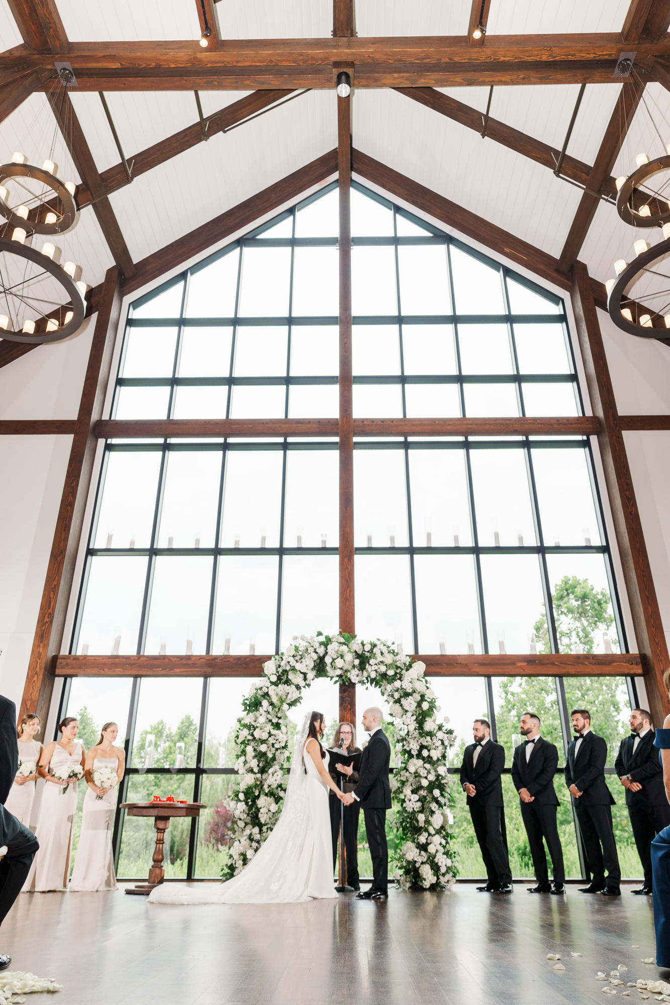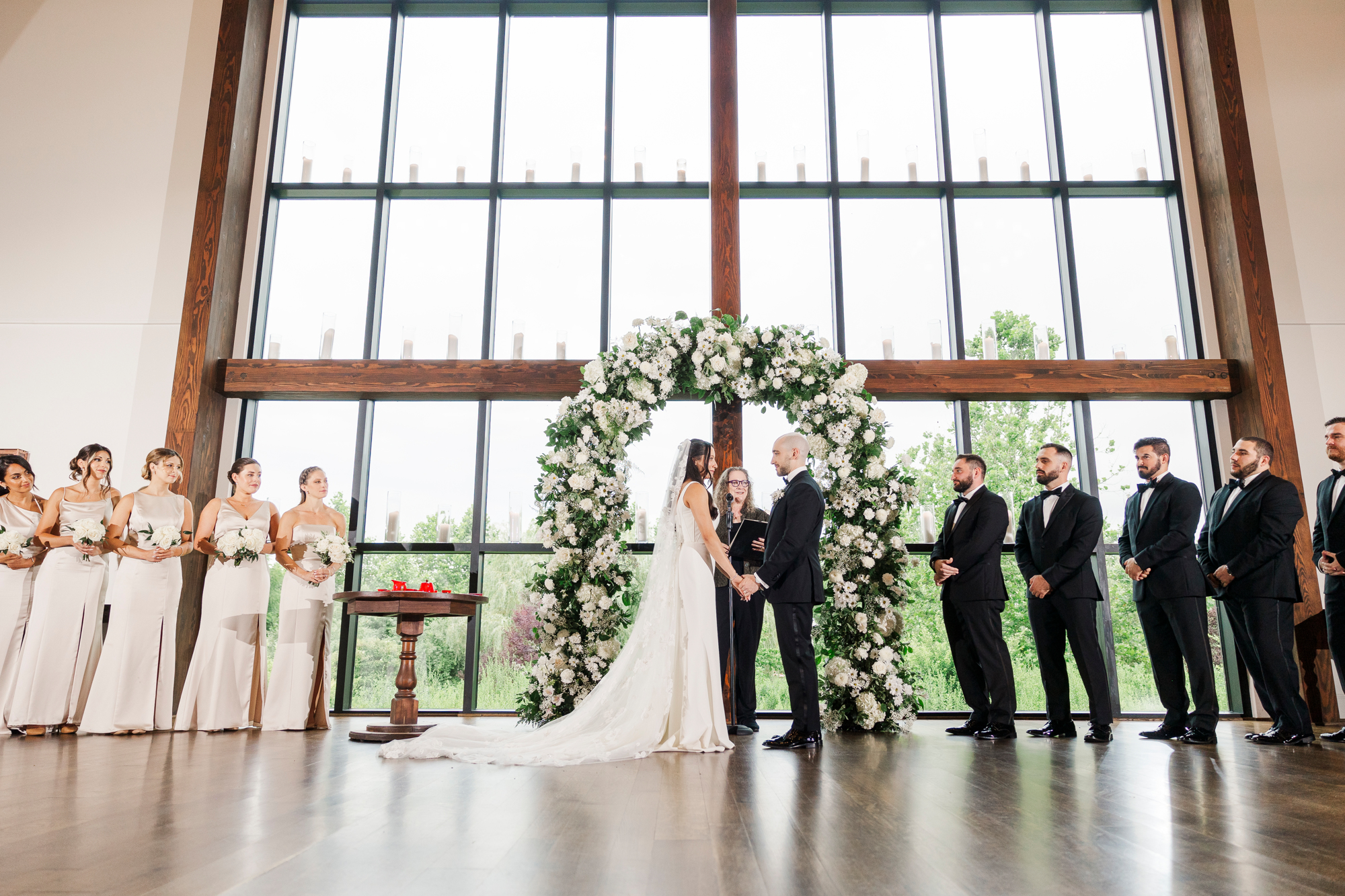 The farmhouse reception space features floor to ceiling glass walls that bring in natural light as the sun sets. Once the sun goes down, you can tell it’s time to party. From weddings for 100 guests to almost 300, this venue is 30 acres of beauty. It’s the perfect place to have a blast with your friends, family, and wedding party.