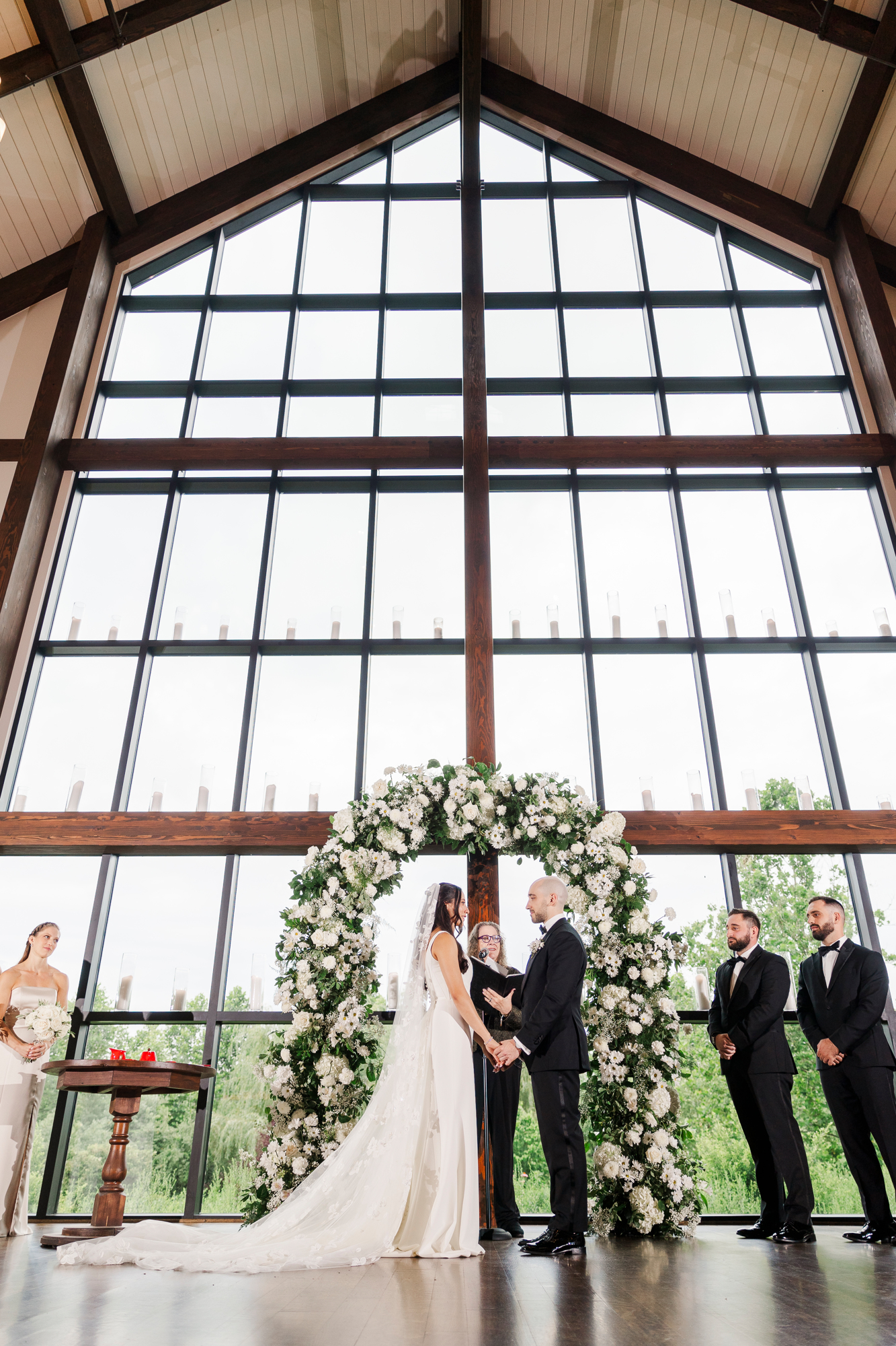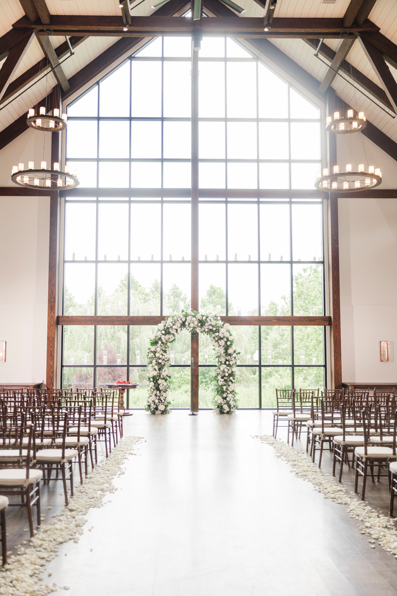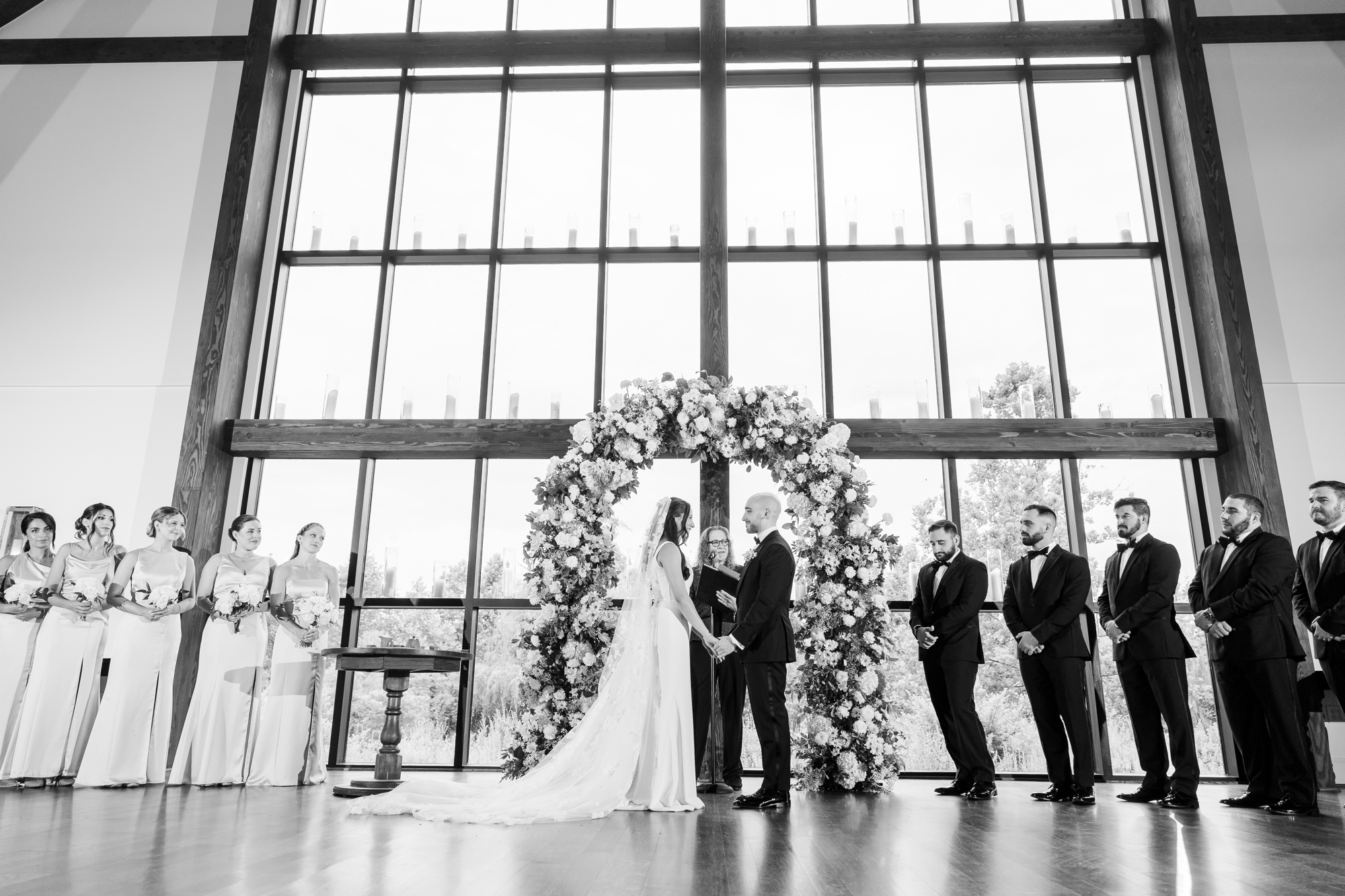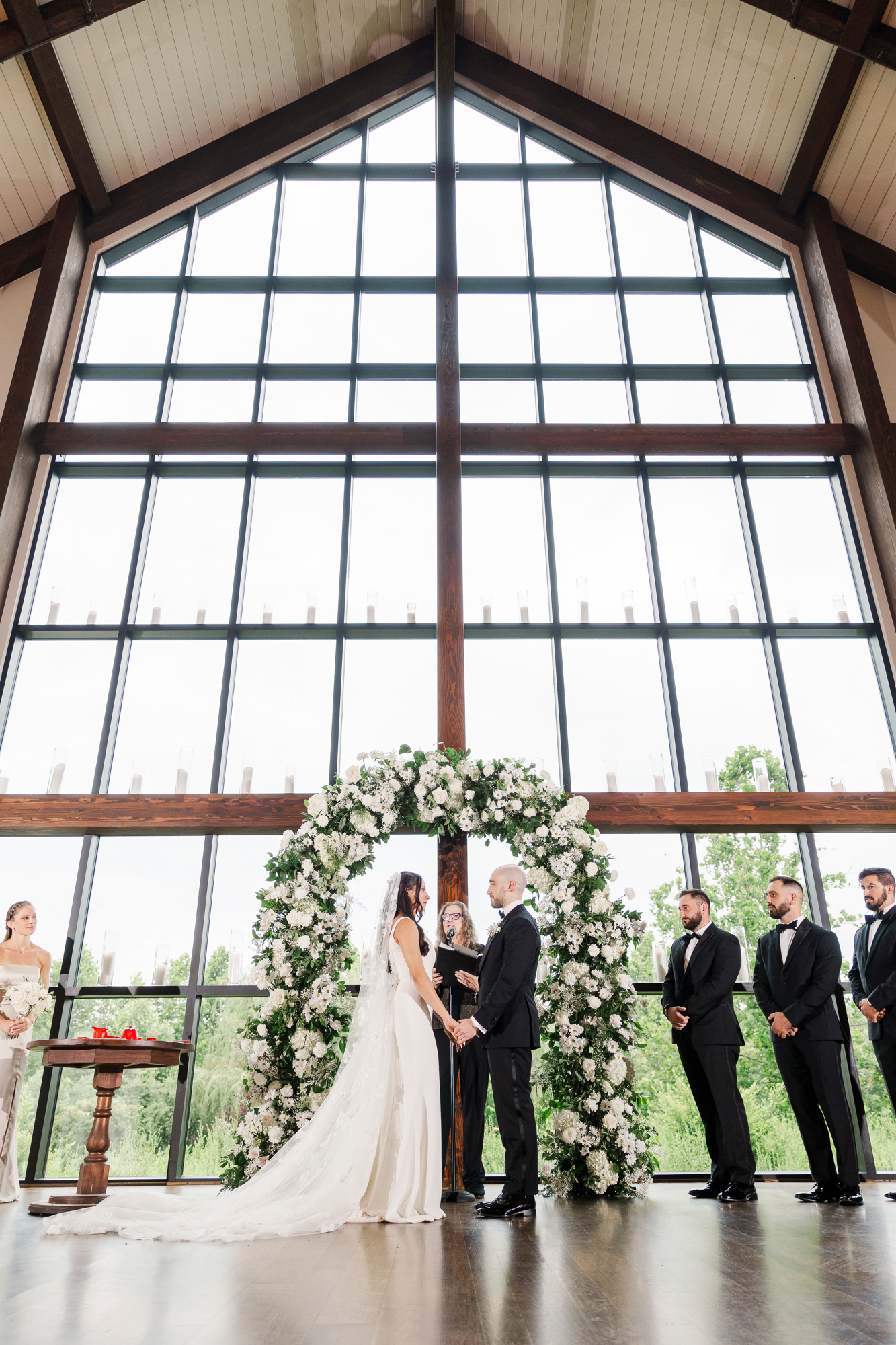 The farmhouse reception space features floor to ceiling glass walls that bring in natural light as the sun sets. Once the sun goes down, you can tell it’s time to party. From weddings for 100 guests to almost 300, this venue is 30 acres of beauty. It’s the perfect place to have a blast with your friends, family, and wedding party.