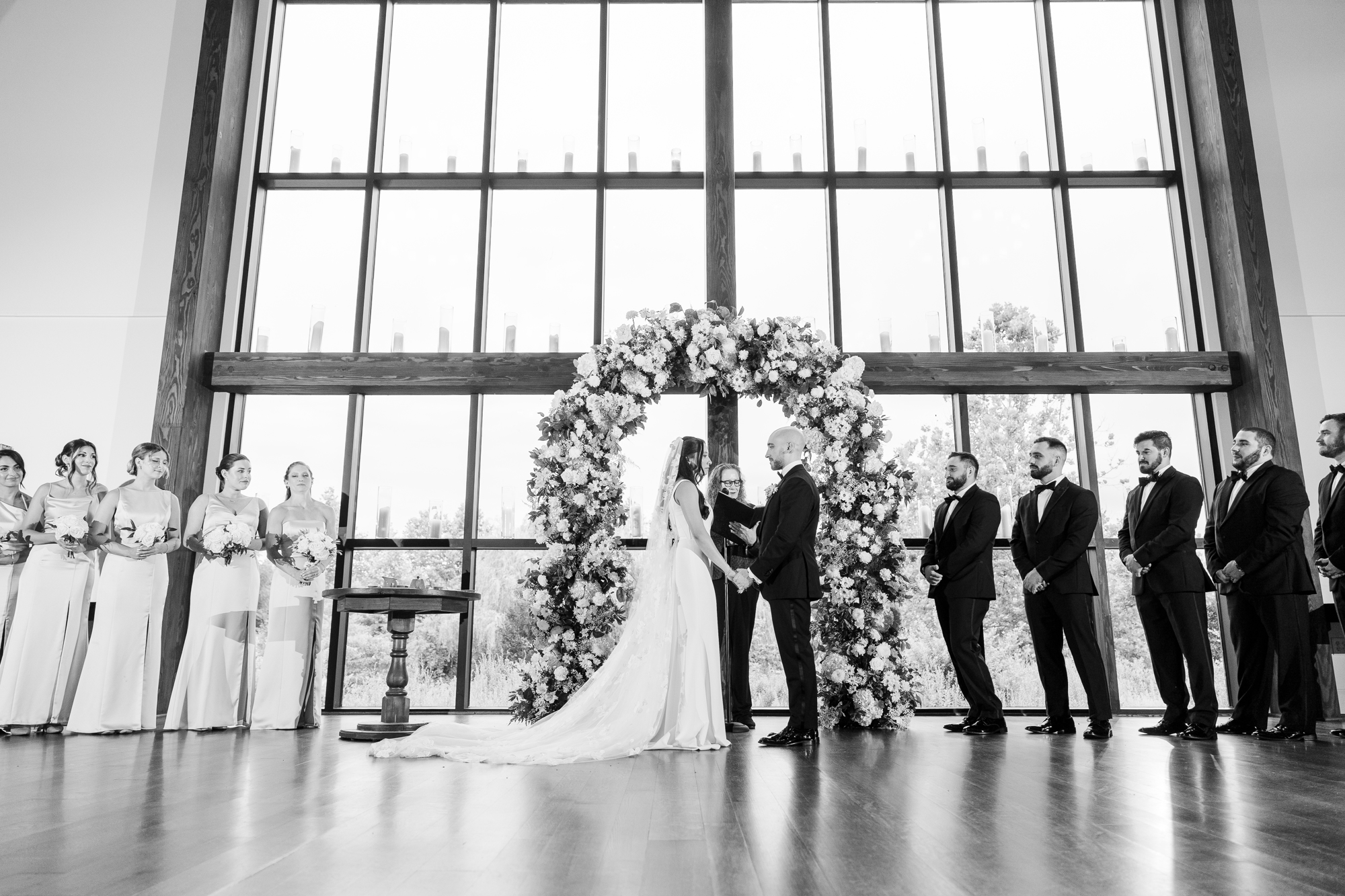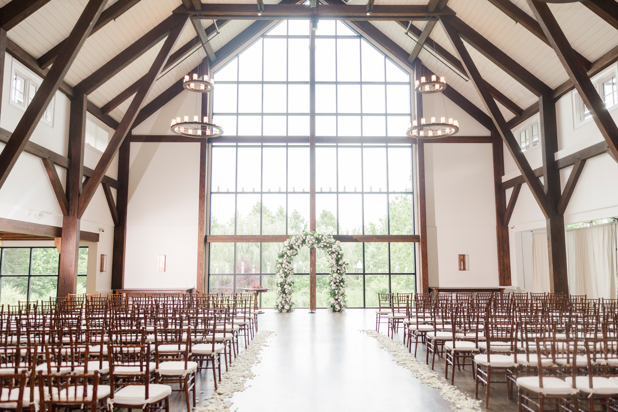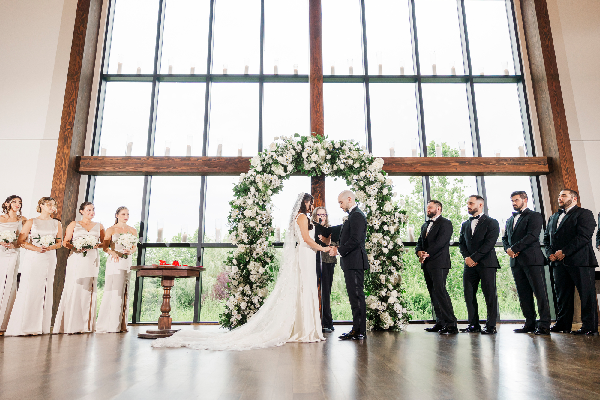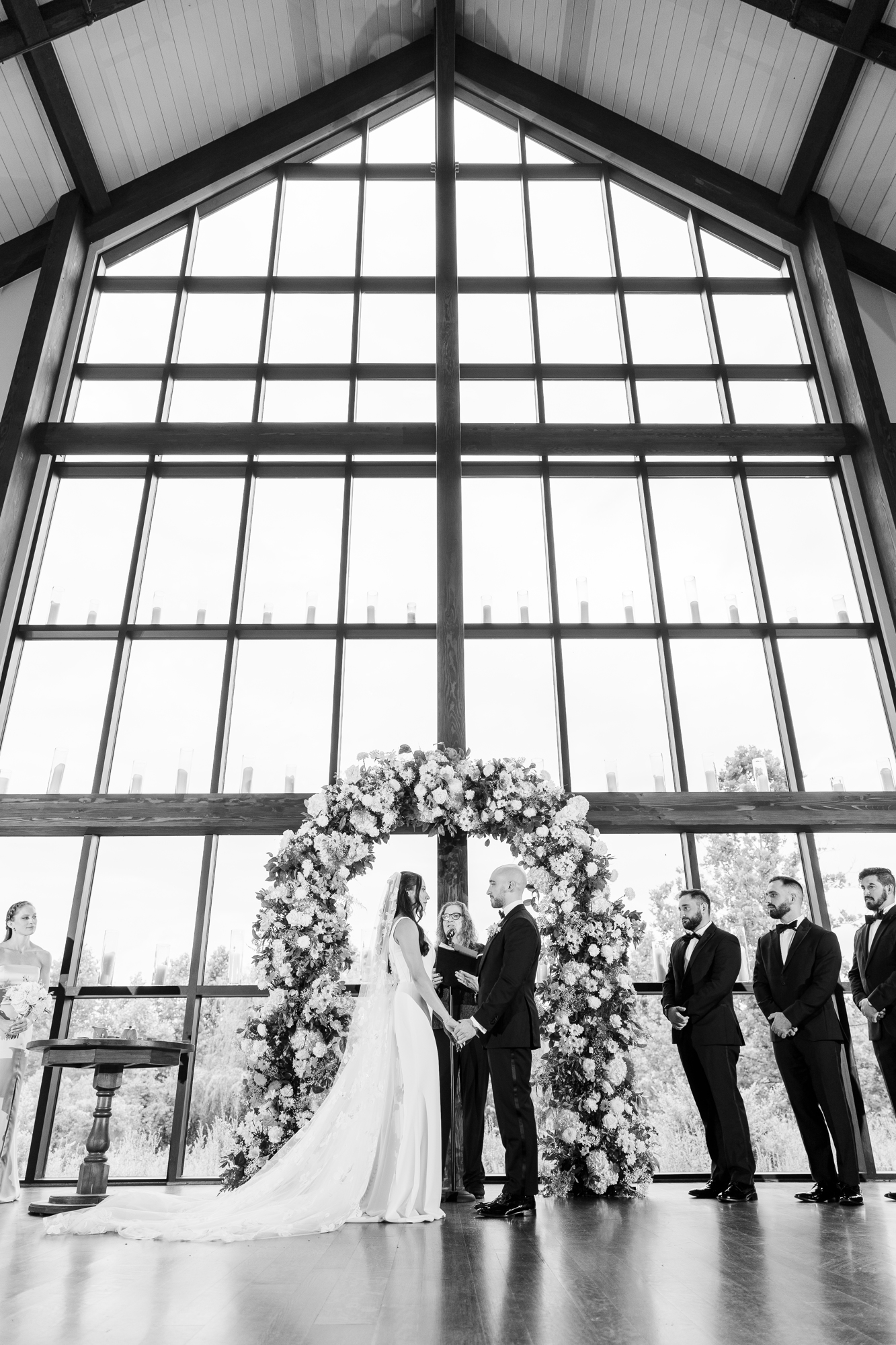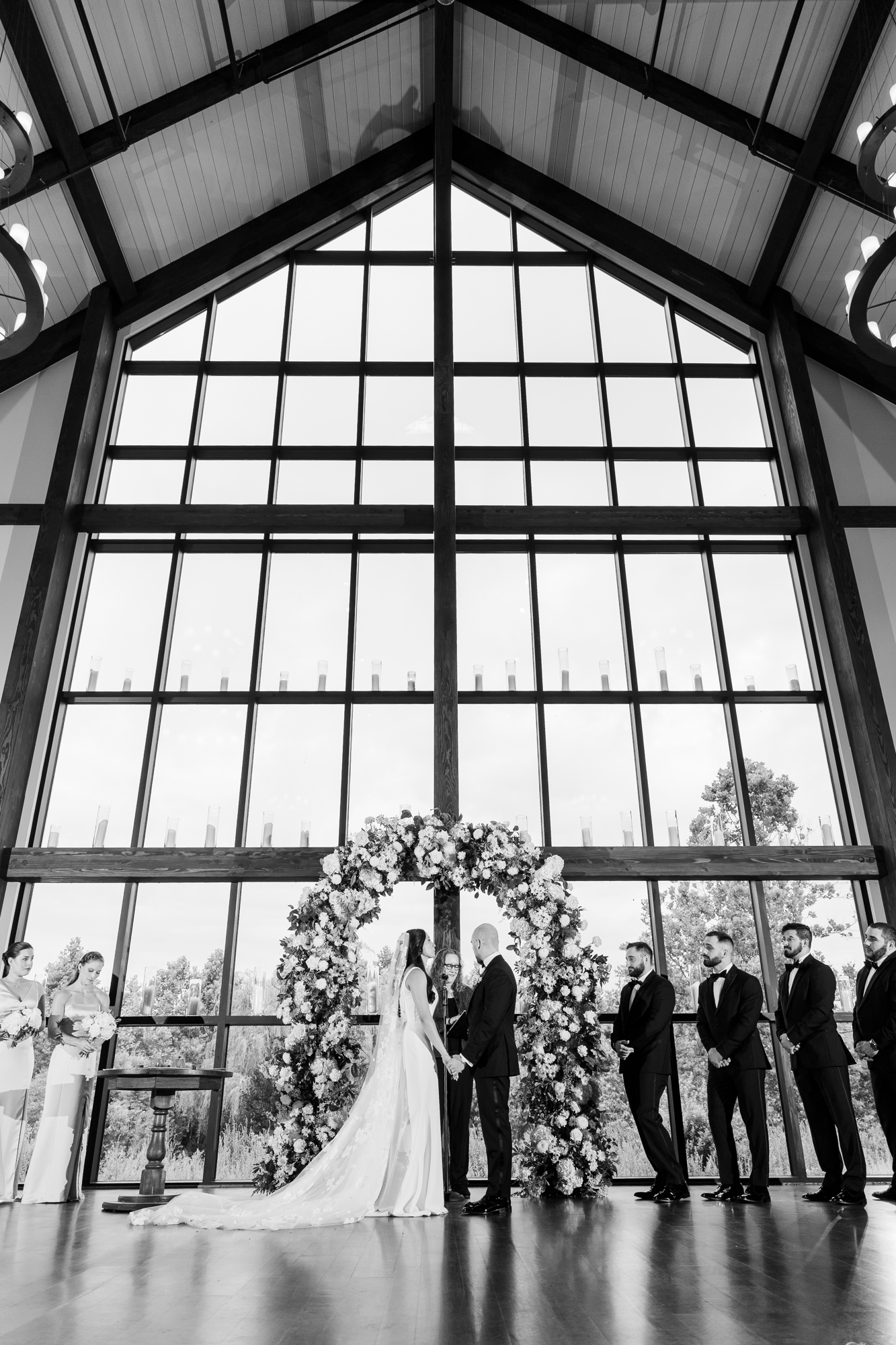The farmhouse reception space features floor to ceiling glass walls that bring in natural light as the sun sets. Once the sun goes down, you can tell it’s time to party. From weddings for 100 guests to almost 300, this venue is 30 acres of beauty. It’s the perfect place to have a blast with your friends, family, and wedding party.
