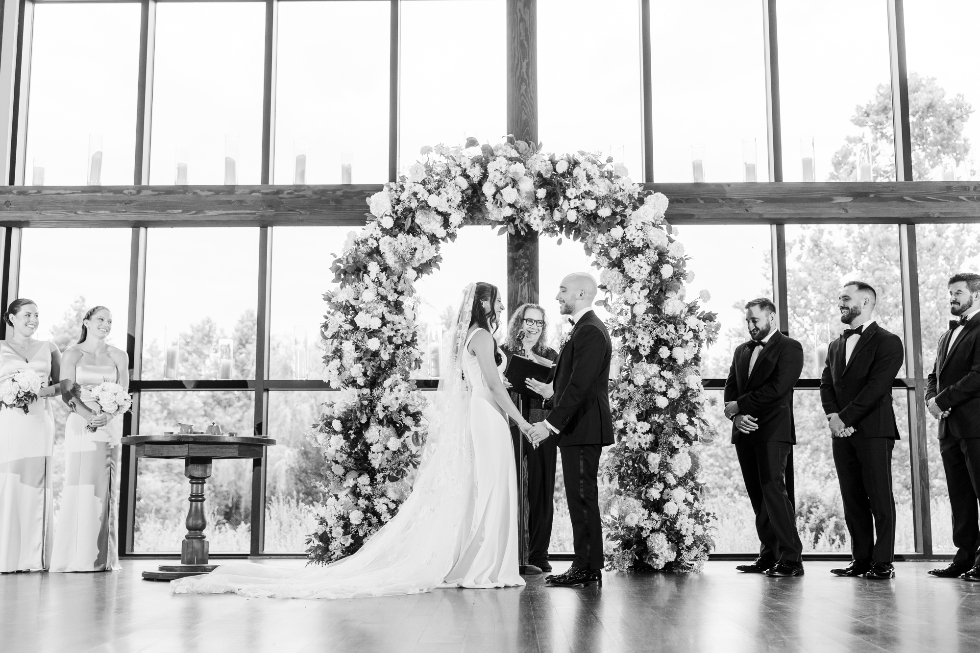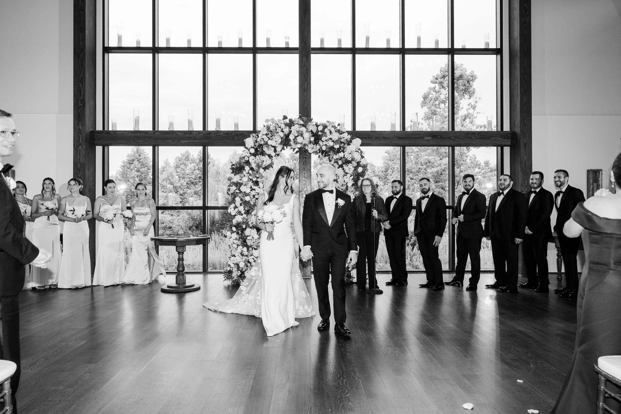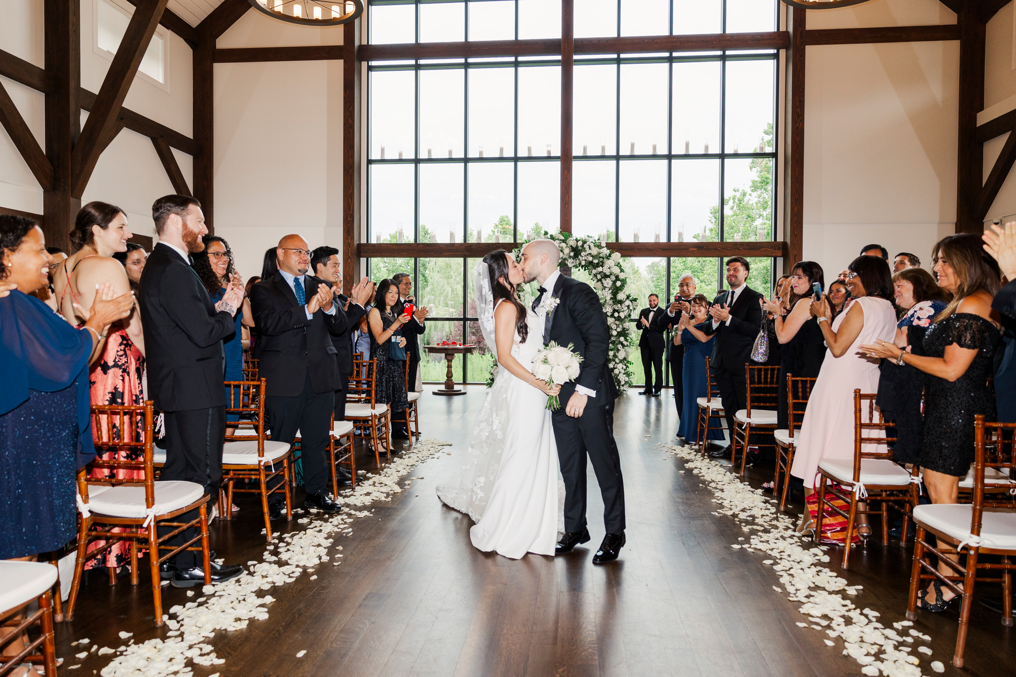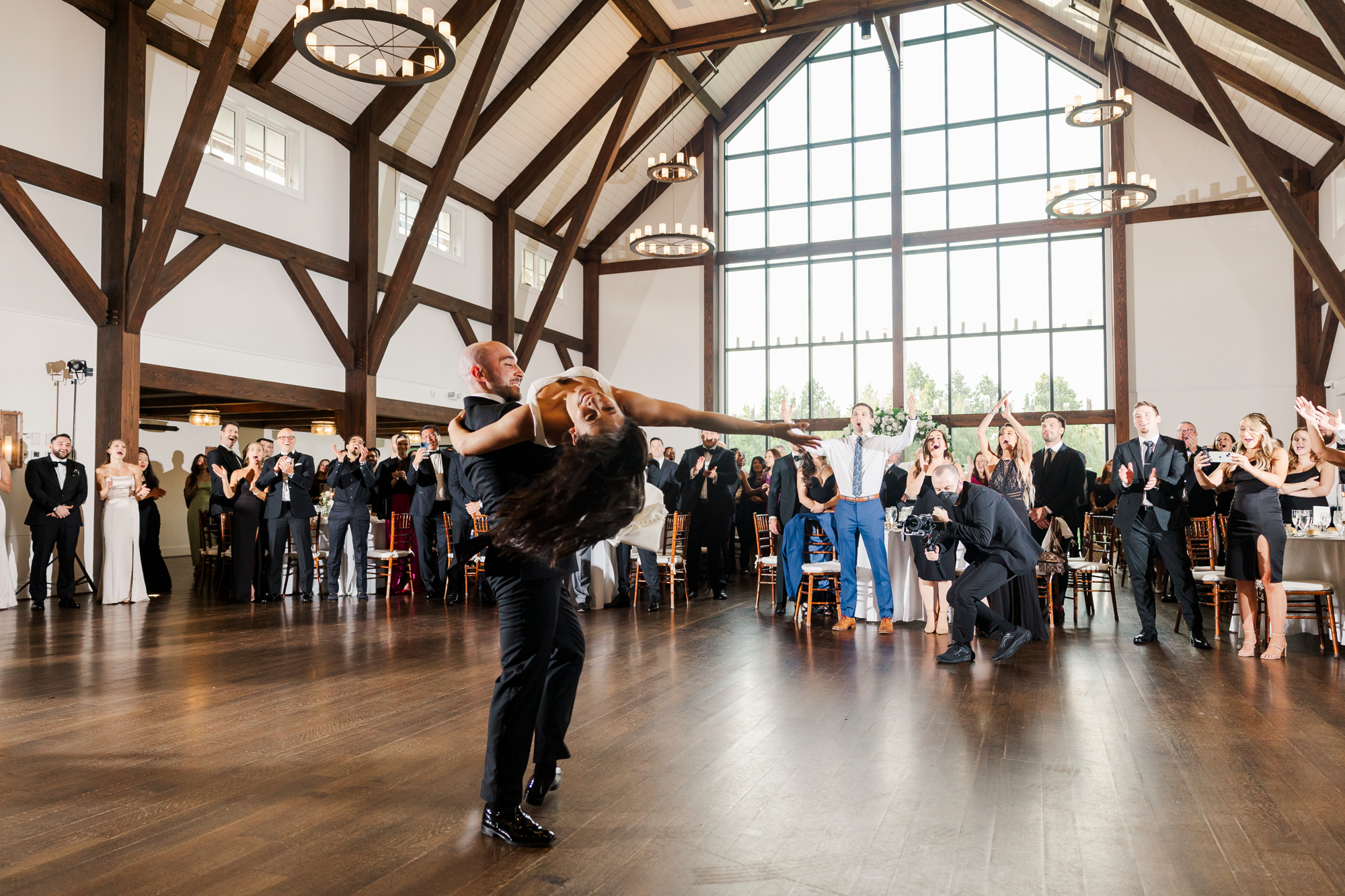 The farmhouse reception space features floor to ceiling glass walls that bring in natural light as the sun sets. Once the sun goes down, you can tell it’s time to party. From weddings for 100 guests to almost 300, this venue is 30 acres of beauty. It’s the perfect place to have a blast with your friends, family, and wedding party.