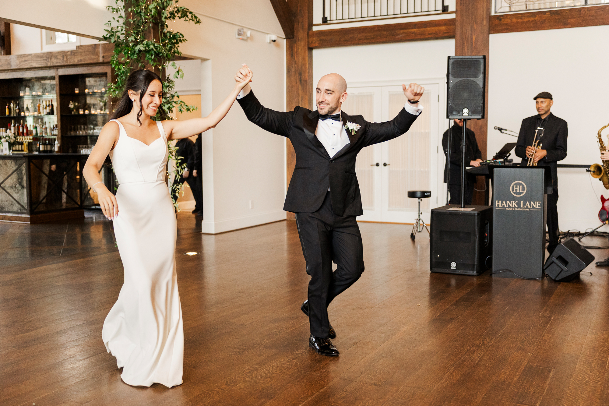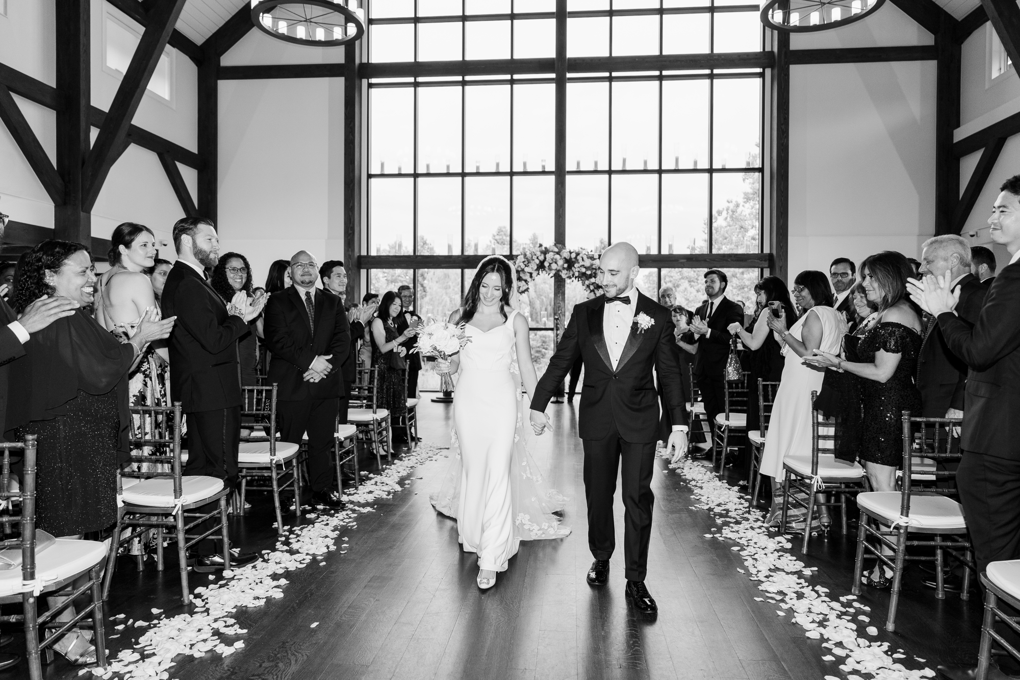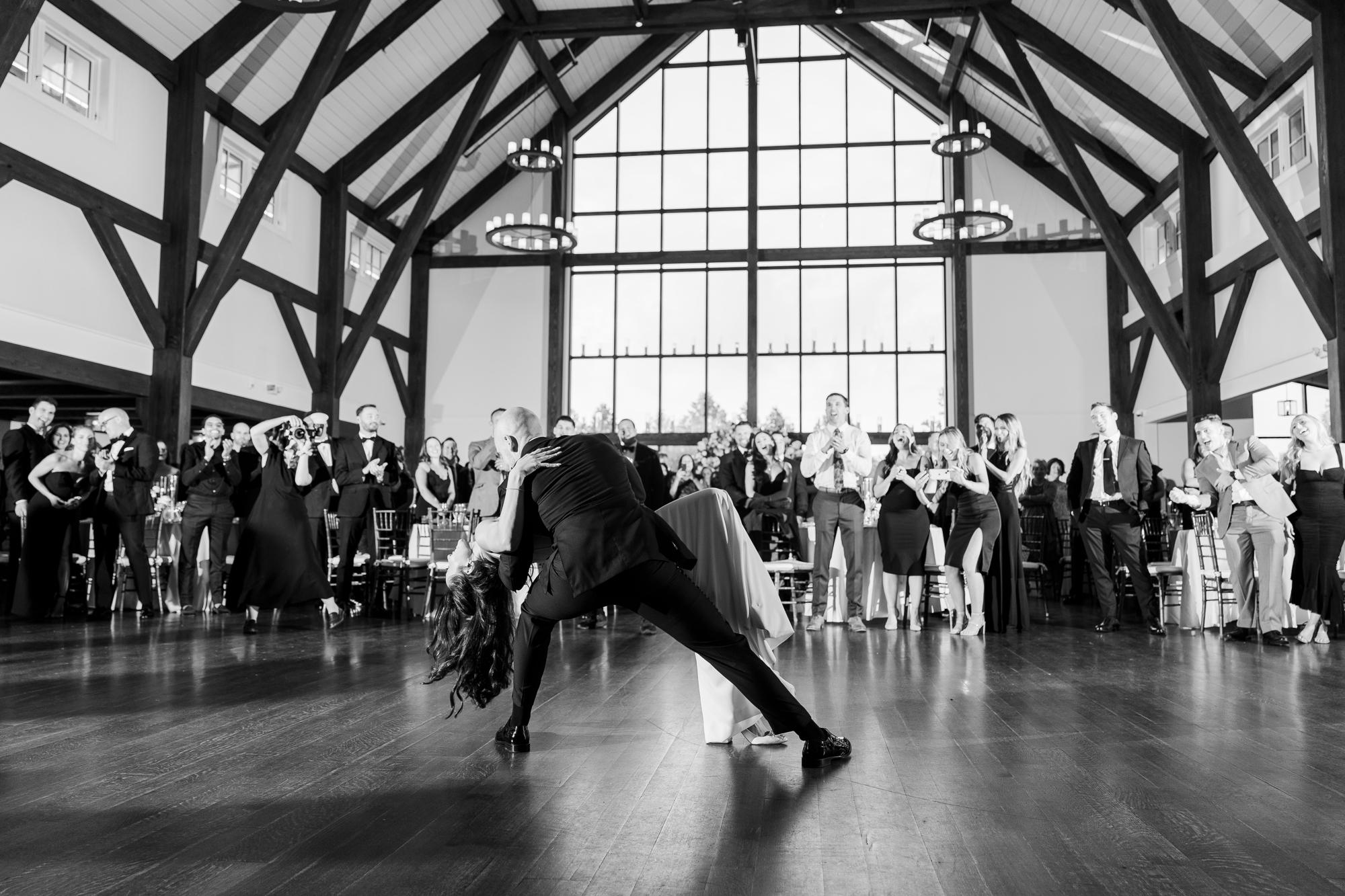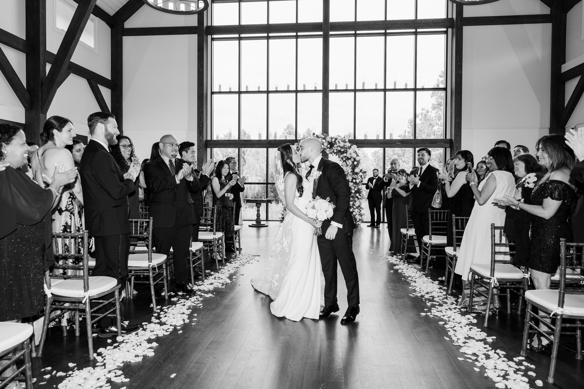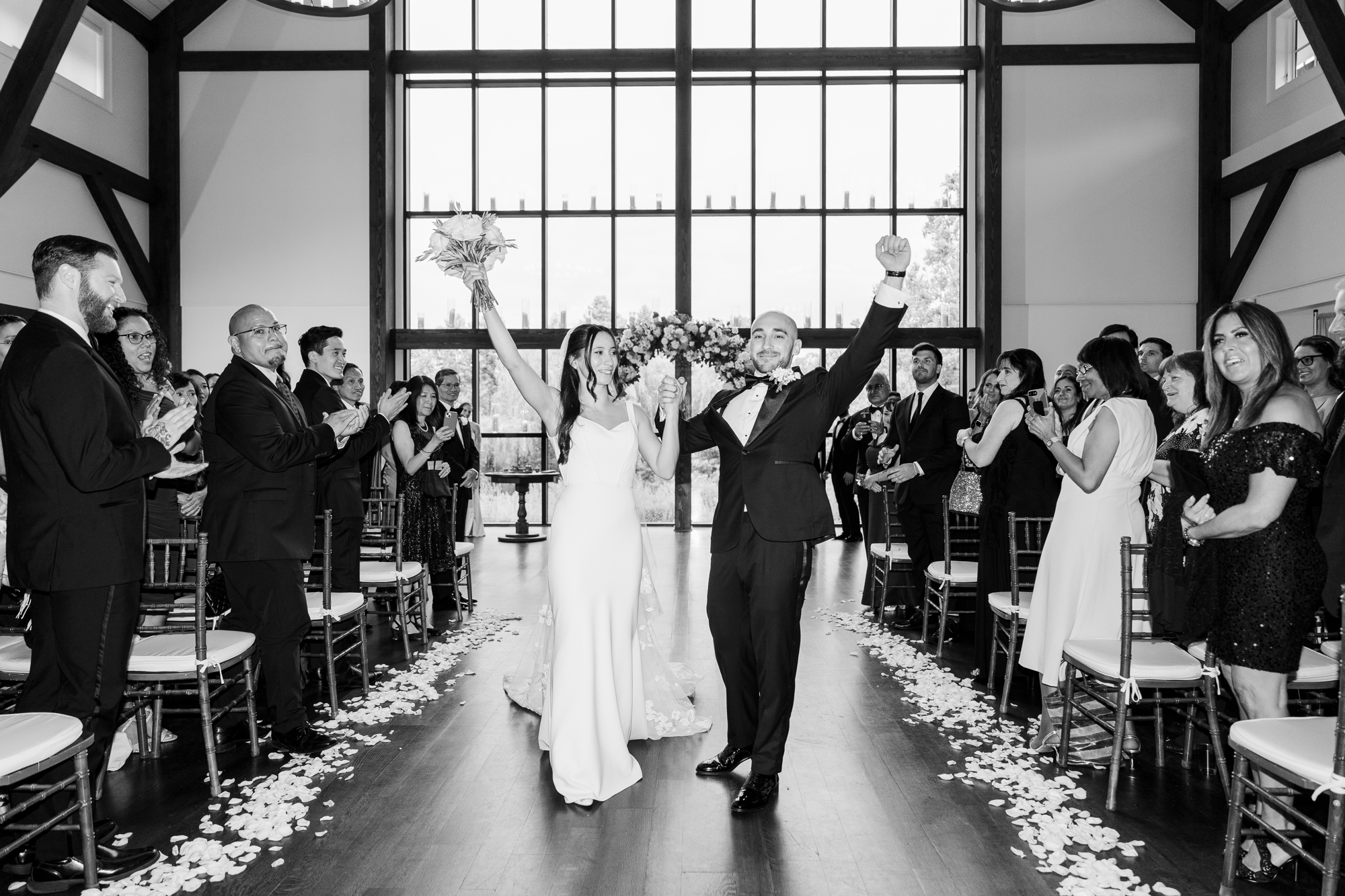The farmhouse reception space features floor to ceiling glass walls that bring in natural light as the sun sets. Once the sun goes down, you can tell it’s time to party. From weddings for 100 guests to almost 300, this venue is 30 acres of beauty. It’s the perfect place to have a blast with your friends, family, and wedding party.