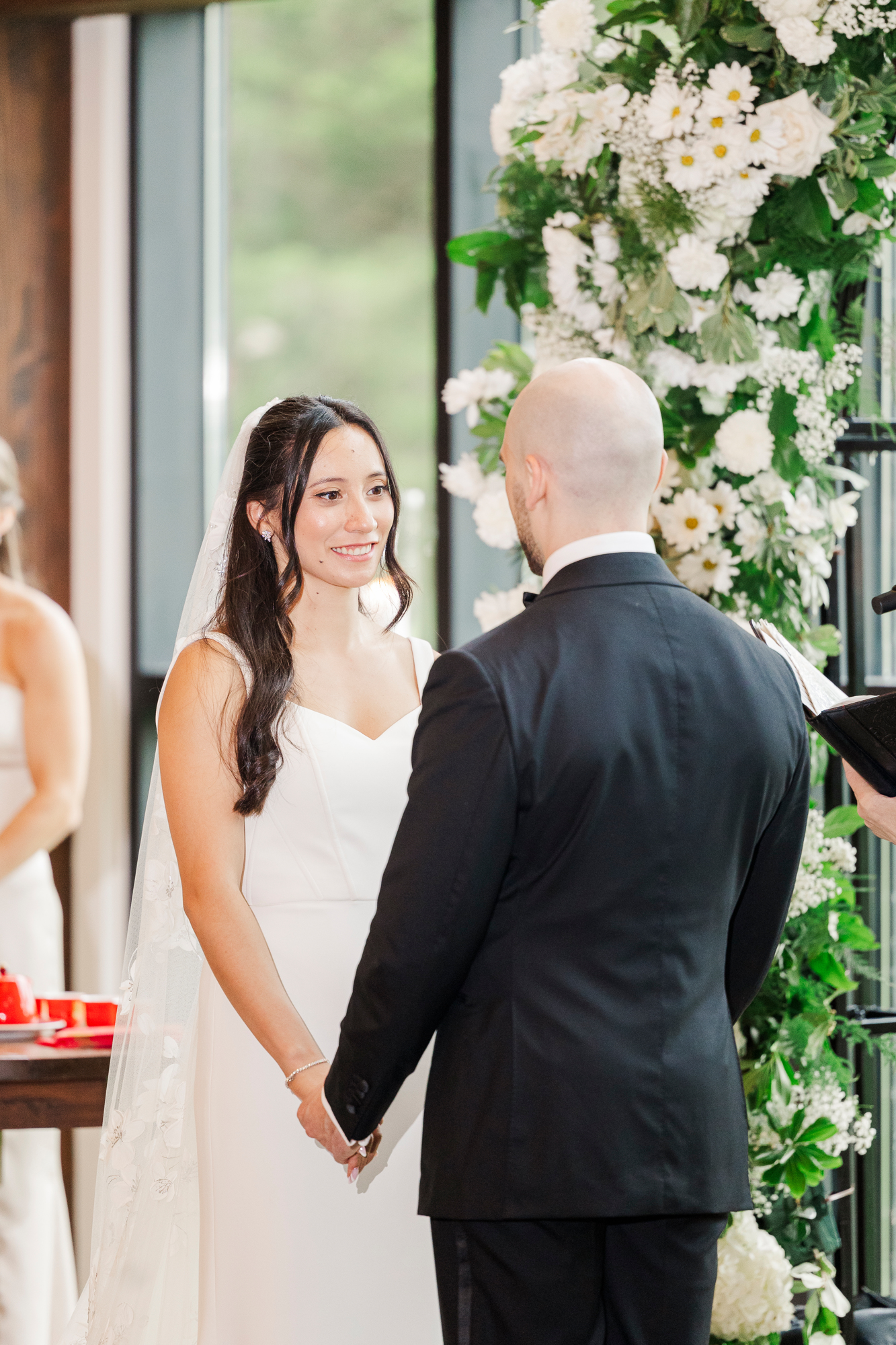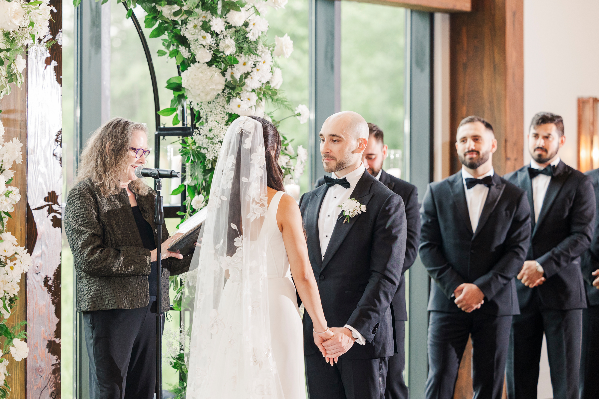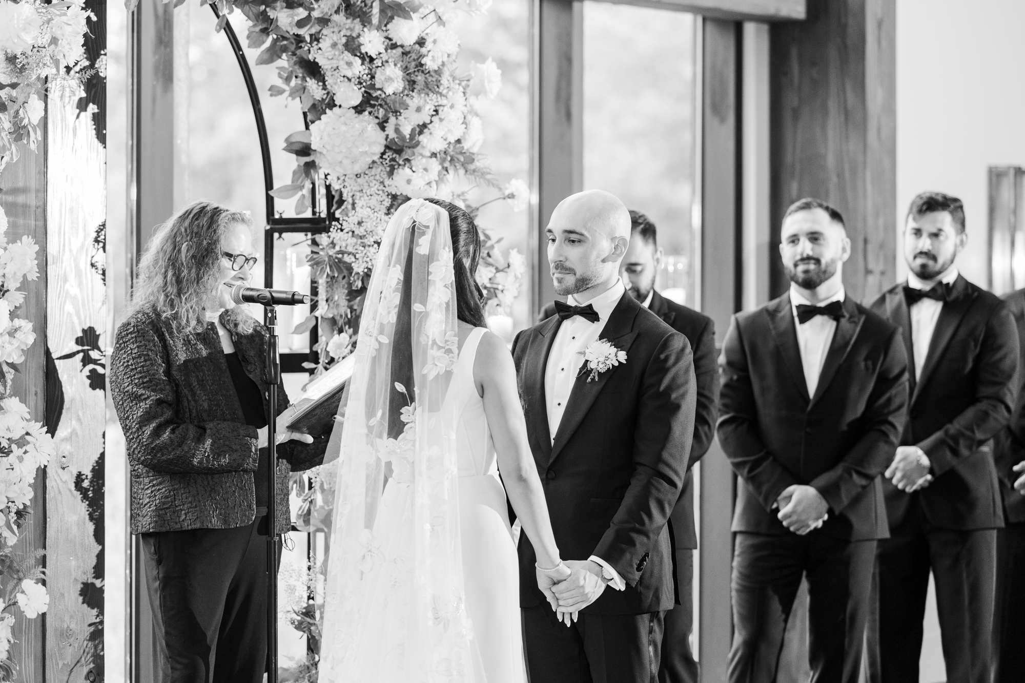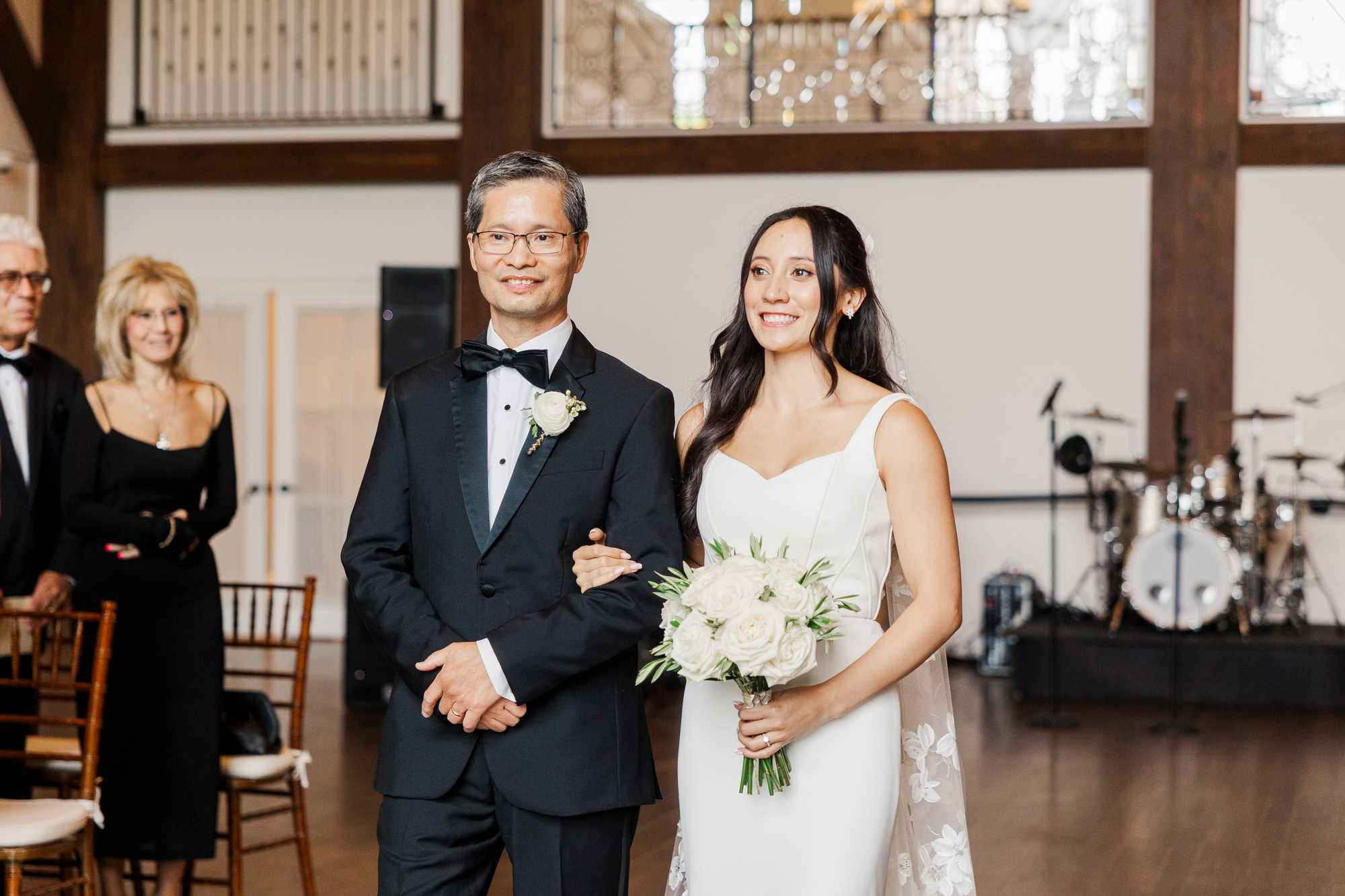 The tea ceremony for this Crossed Keys Estate wedding was beautifully lit within the space. Laura and Rob then went outside for portraits before changing back into their ceremony attire. Shortly after, they recited private vows in the farmhouse suite before walking down the aisle. The ceremony was sweet and sentimental, and perfectly reflected the couple’s love story.