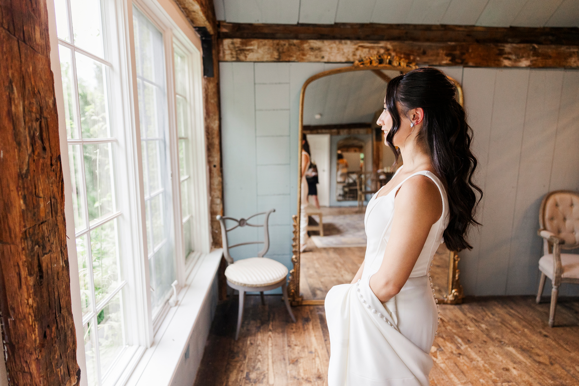 The couple each got ready at their respective parts of the property. Laura’s hair and makeup took place in the playhouse, which had gorgeous natural light and rustic details. Rob and his groomsmen got ready in the Pequest Parlor, just up the hill from the playhouse. Each space at this Crossed Keys Estate wedding felt like it was truly made for fine art wedding photography.