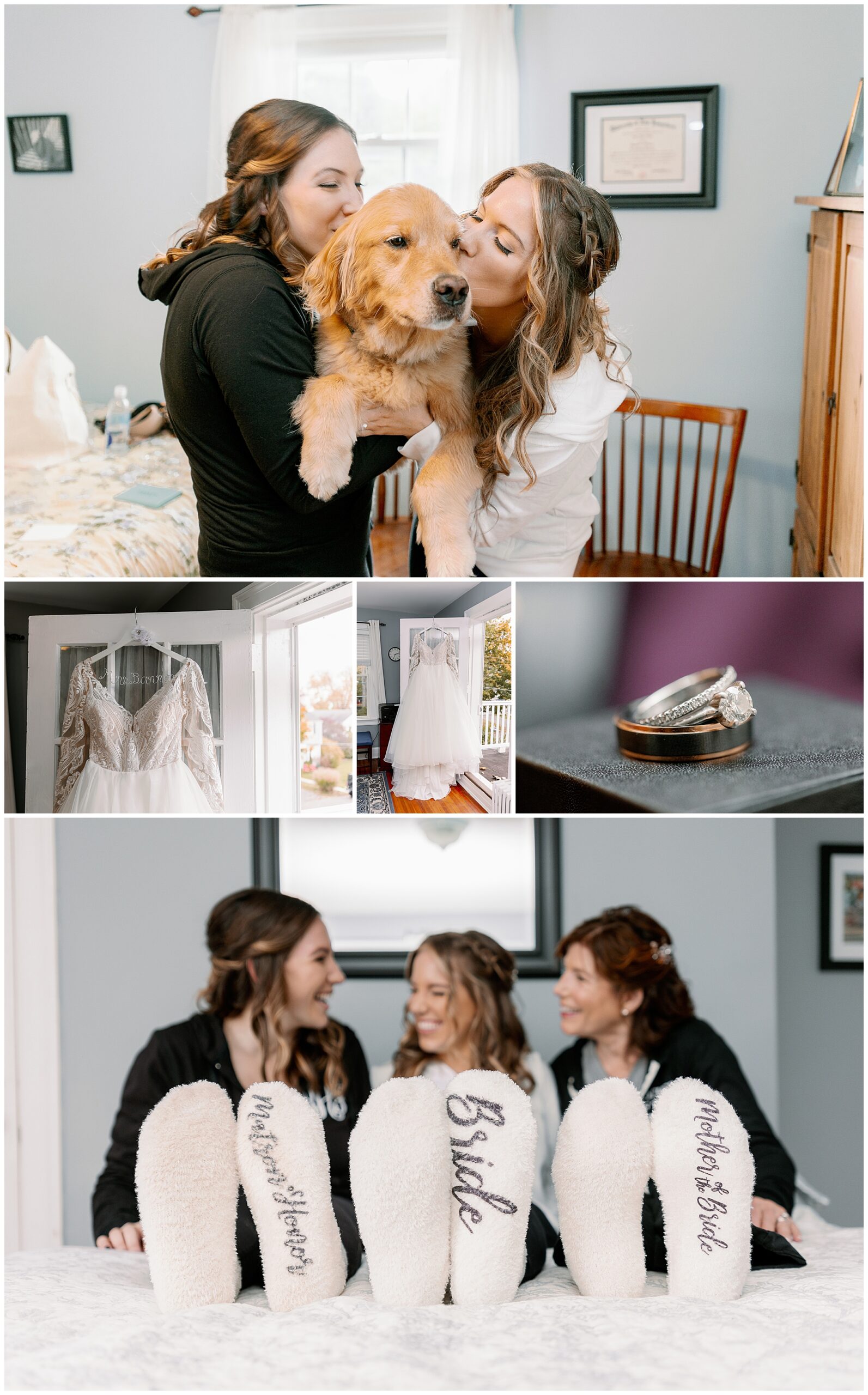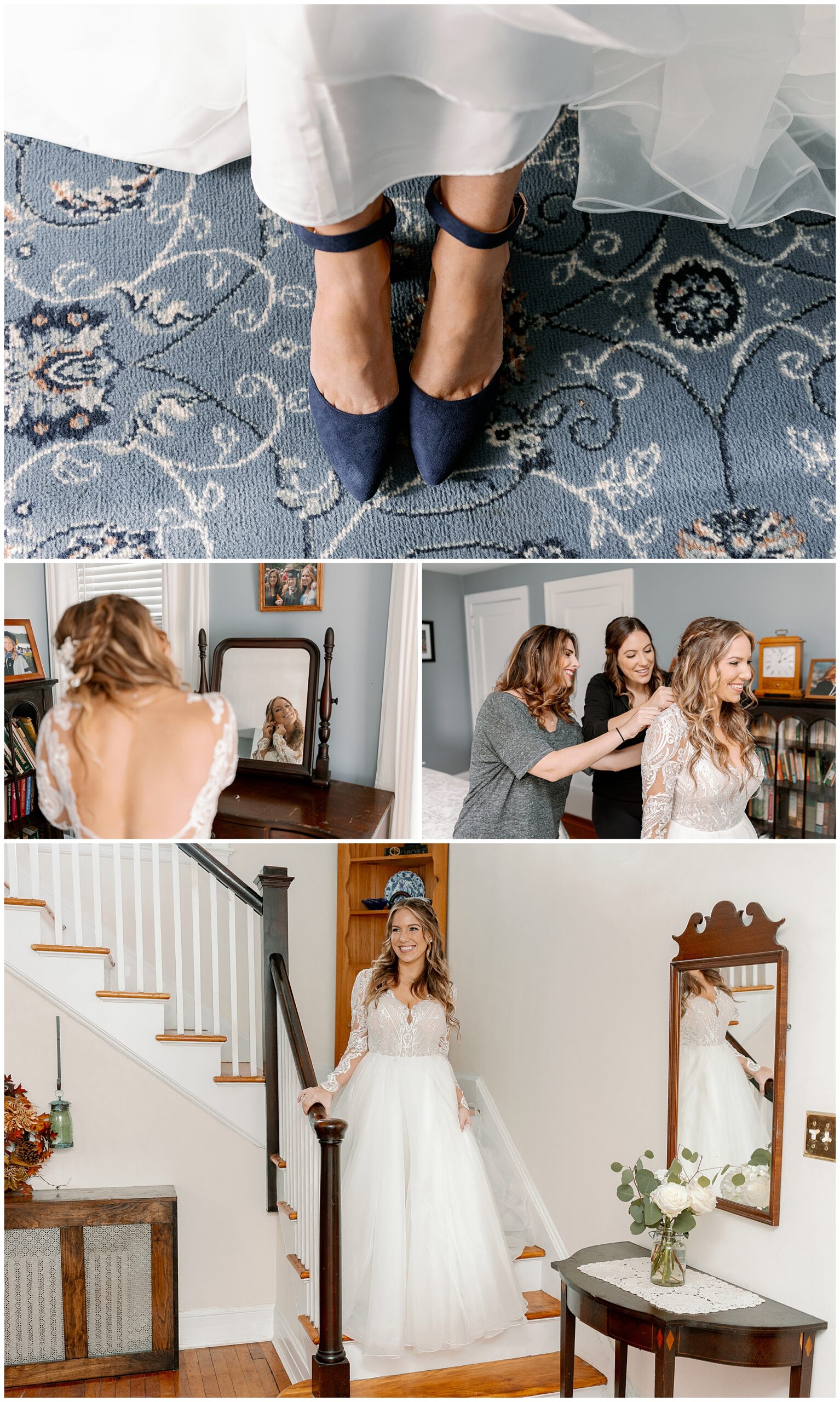 The day began with the couple getting ready in separate rooms, with Kenneth photographing the groom and Megan photographing the bride. Working as a team allows us to capture both perspectives simultaneously, making sure the couple doesn’t see each other before their first look. We started with a first look between Molly and her father on the family staircase, the same spot where her mother and grandmother were photographed decades earlier. It was such a sweet way to connect generations through wedding photos.