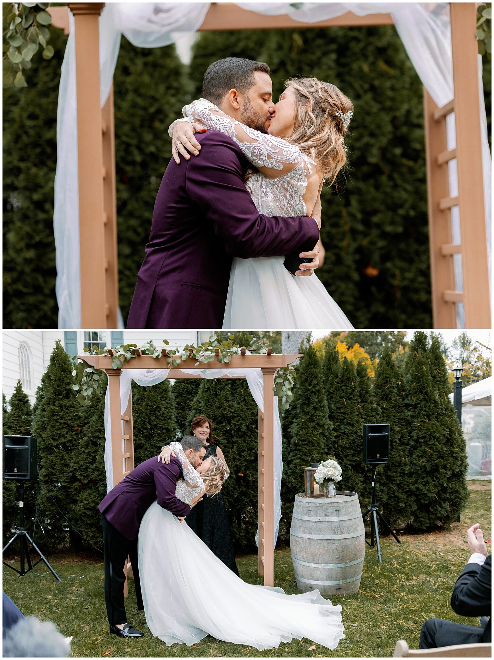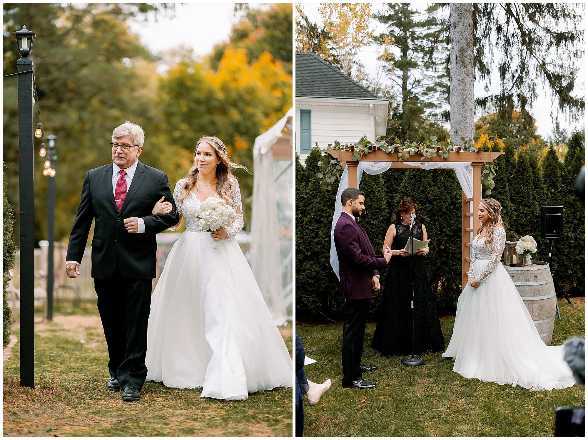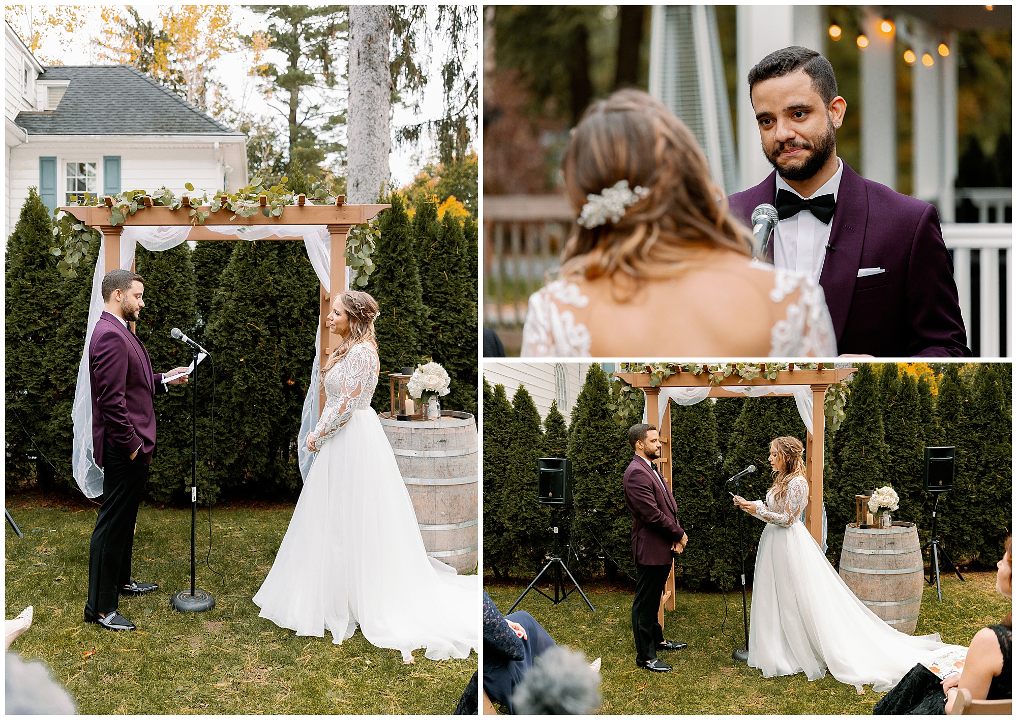 Their backyard wedding reception felt perfectly autumnal and cozy. Cocktail hour began with a home bar setup where guests mingled in small groups as string lights glowed overhead. The deep orange and plum tones of the décor complemented the colorful foliage in the yard. Molly wore a flowing gown with a soft train, and Alex’s plum suit matched the season beautifully. Every detail of their celebration reflected the warmth of an upstate New York wedding.