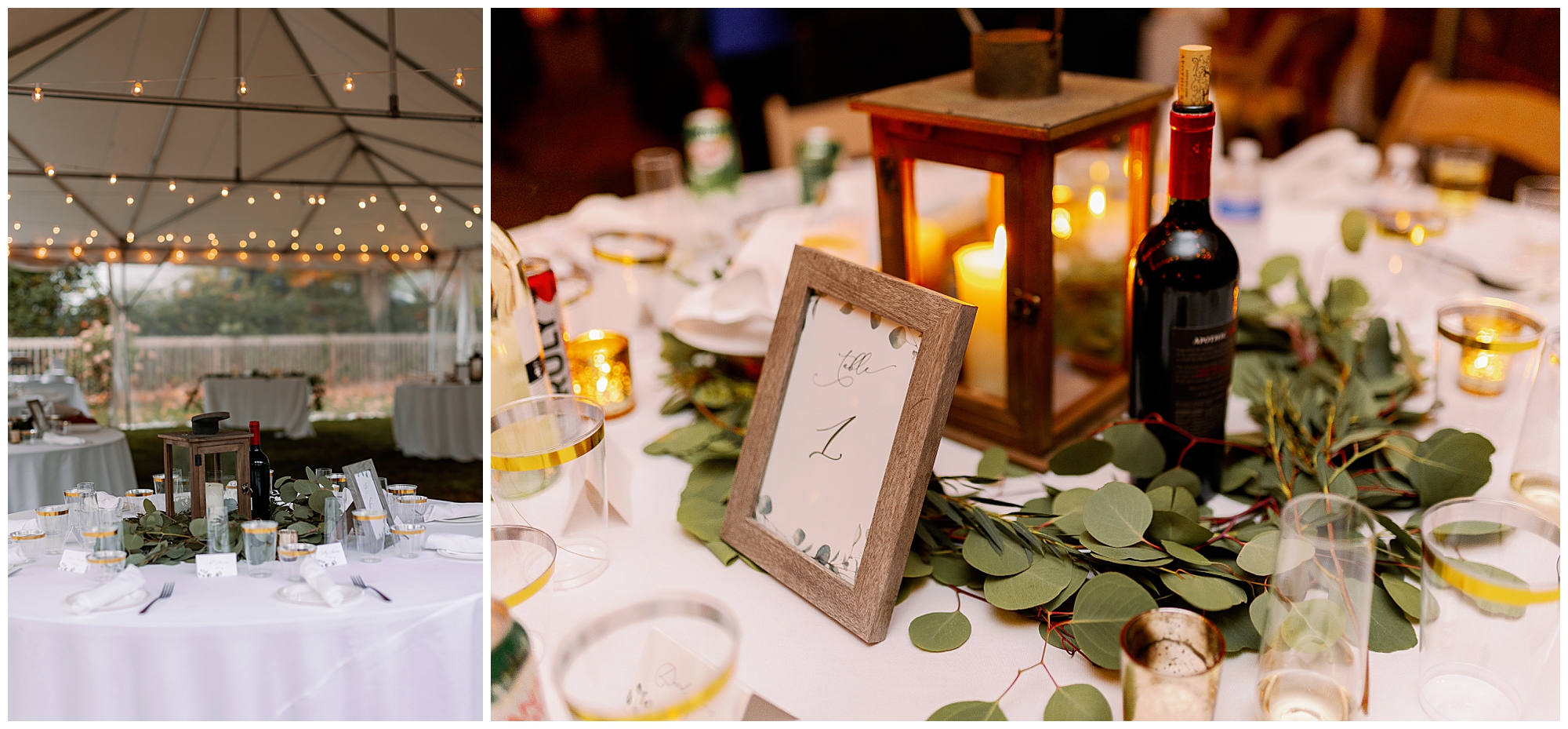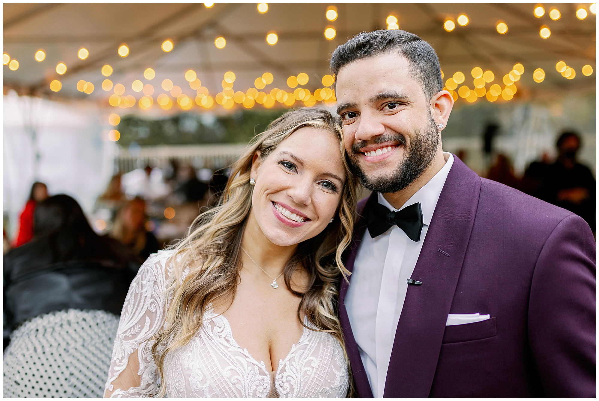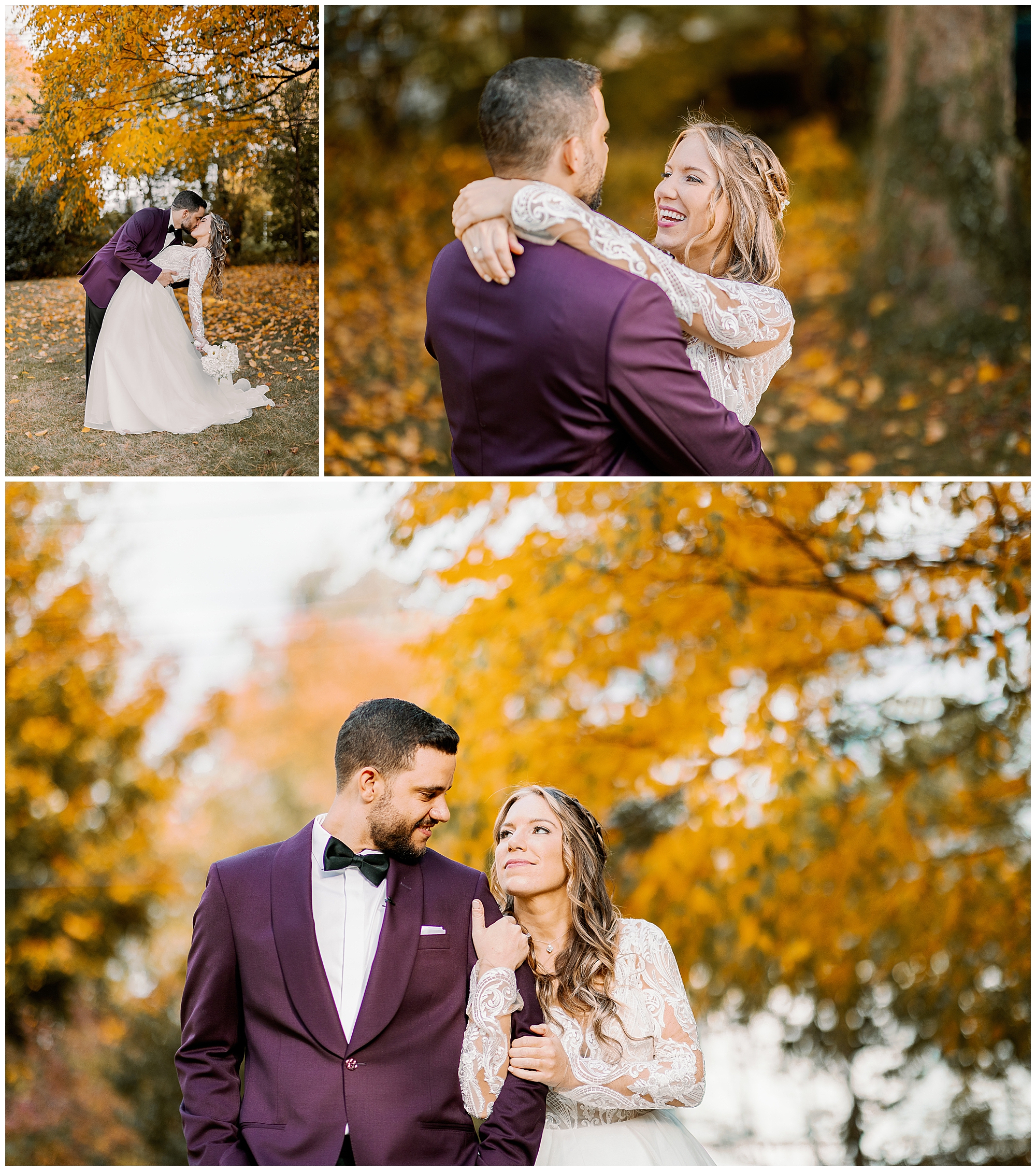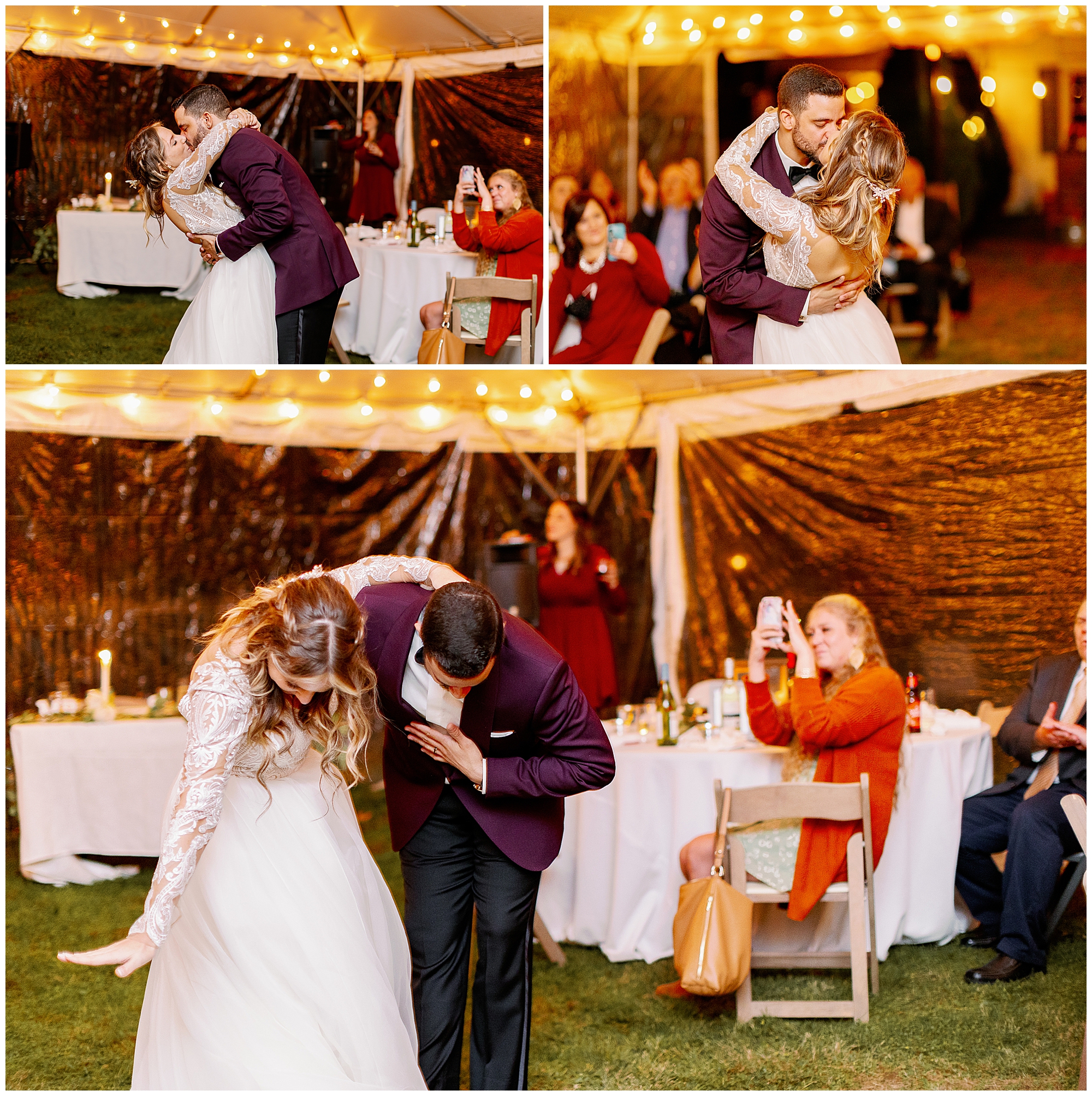 Their backyard wedding reception felt perfectly autumnal and cozy. Cocktail hour began with a home bar setup where guests mingled in small groups as string lights glowed overhead. The deep orange and plum tones of the décor complemented the colorful foliage in the yard. Molly wore a flowing gown with a soft train, and Alex’s plum suit matched the season beautifully. Every detail of their celebration reflected the warmth of an upstate New York wedding.
