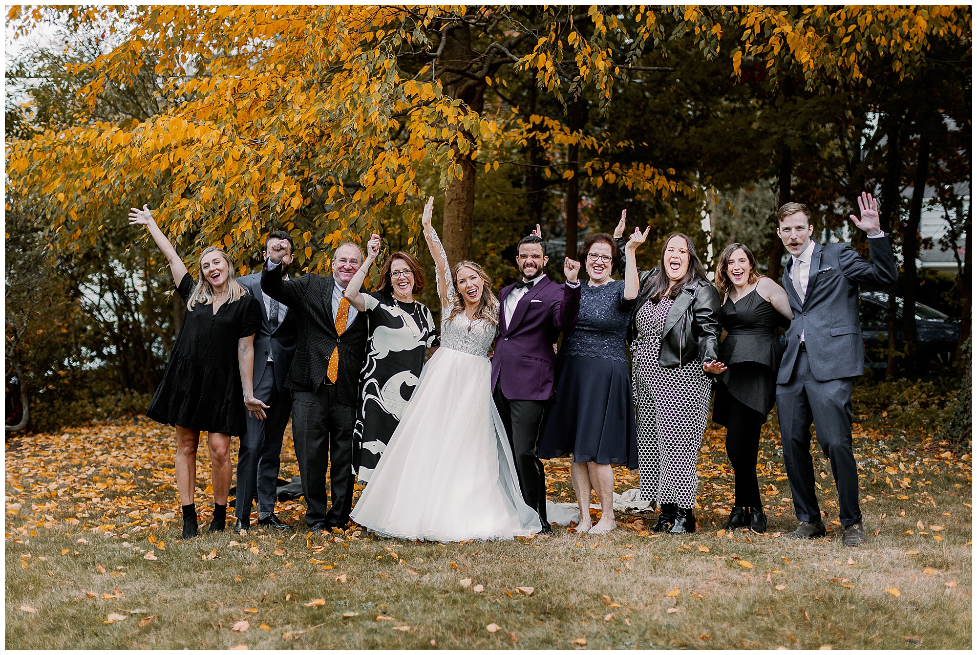 Next, Molly and Alex shared their first look under a beautiful backyard tree surrounded by vivid autumn colors. The golden light and vibrant leaves made for magical Hudson Valley fall wedding photos. After the first look, they took family photos before guests arrived to keep the day relaxed. When friends and relatives began to gather, everyone kept a comfortable distance and wore masks. The couple even created a mask and sanitizer station, a thoughtful touch for this COVID-era wedding in White Plains.