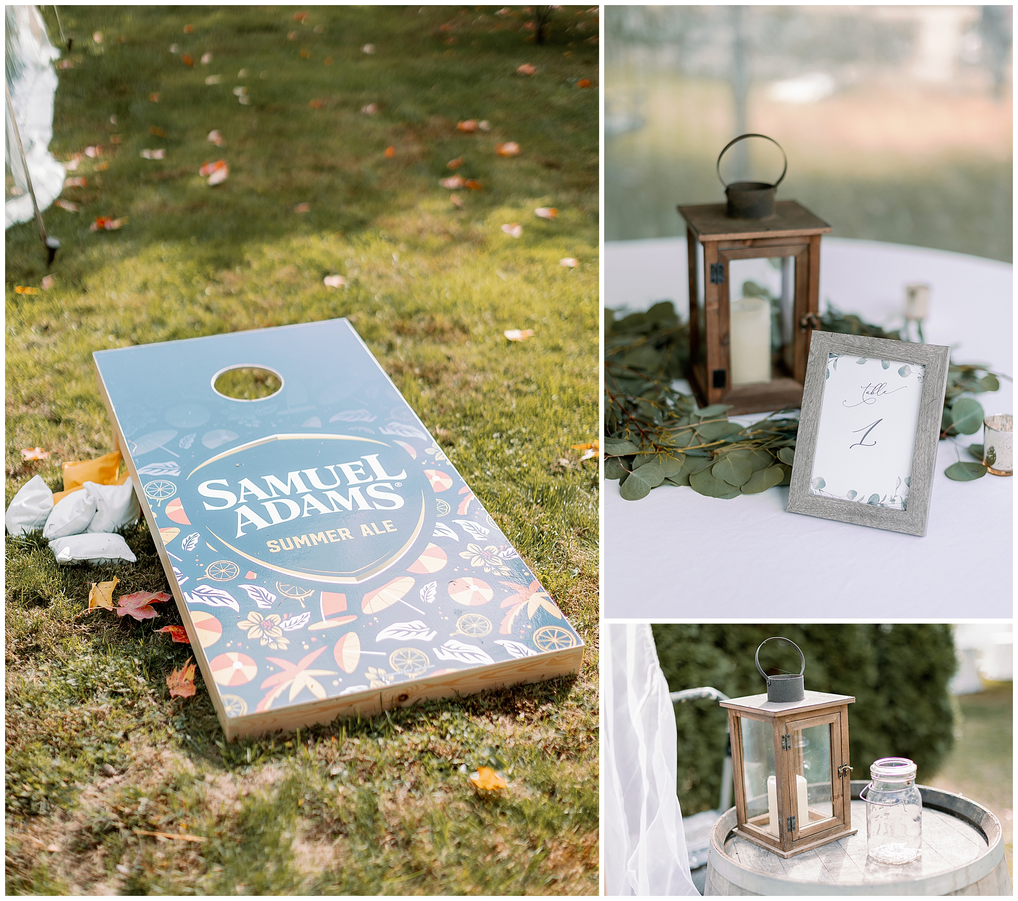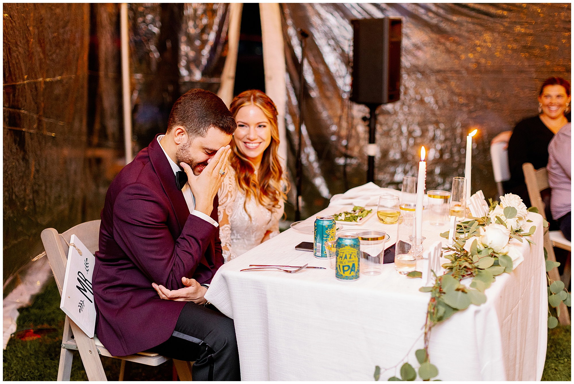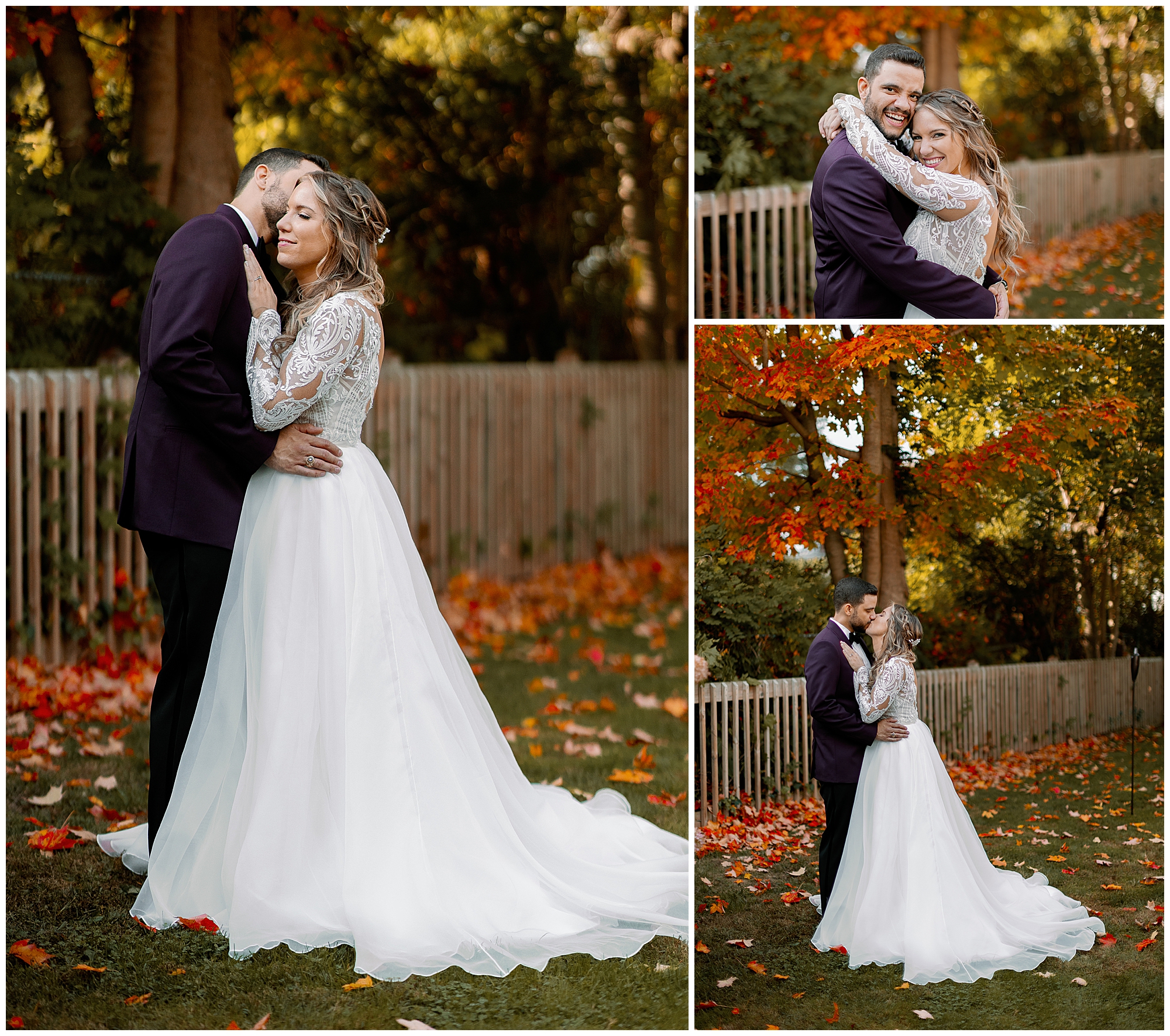 Their backyard wedding reception felt perfectly autumnal and cozy. Cocktail hour began with a home bar setup where guests mingled in small groups as string lights glowed overhead. The deep orange and plum tones of the décor complemented the colorful foliage in the yard. Molly wore a flowing gown with a soft train, and Alex’s plum suit matched the season beautifully. Every detail of their celebration reflected the warmth of an upstate New York wedding.