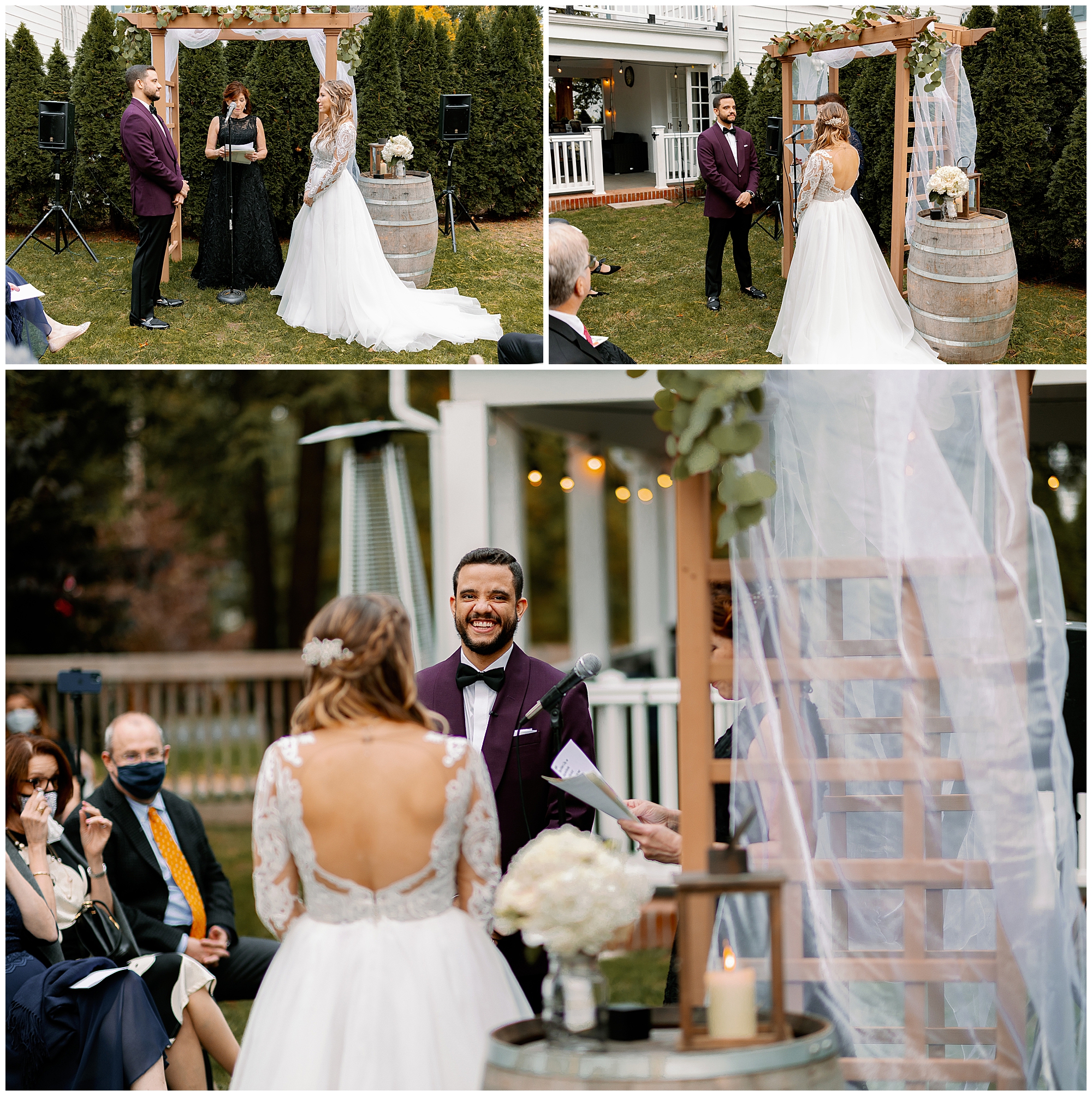 Next, Molly and Alex shared their first look under a beautiful backyard tree surrounded by vivid autumn colors. The golden light and vibrant leaves made for magical Hudson Valley fall wedding photos. After the first look, they took family photos before guests arrived to keep the day relaxed. When friends and relatives began to gather, everyone kept a comfortable distance and wore masks. The couple even created a mask and sanitizer station, a thoughtful touch for this COVID-era wedding in White Plains.