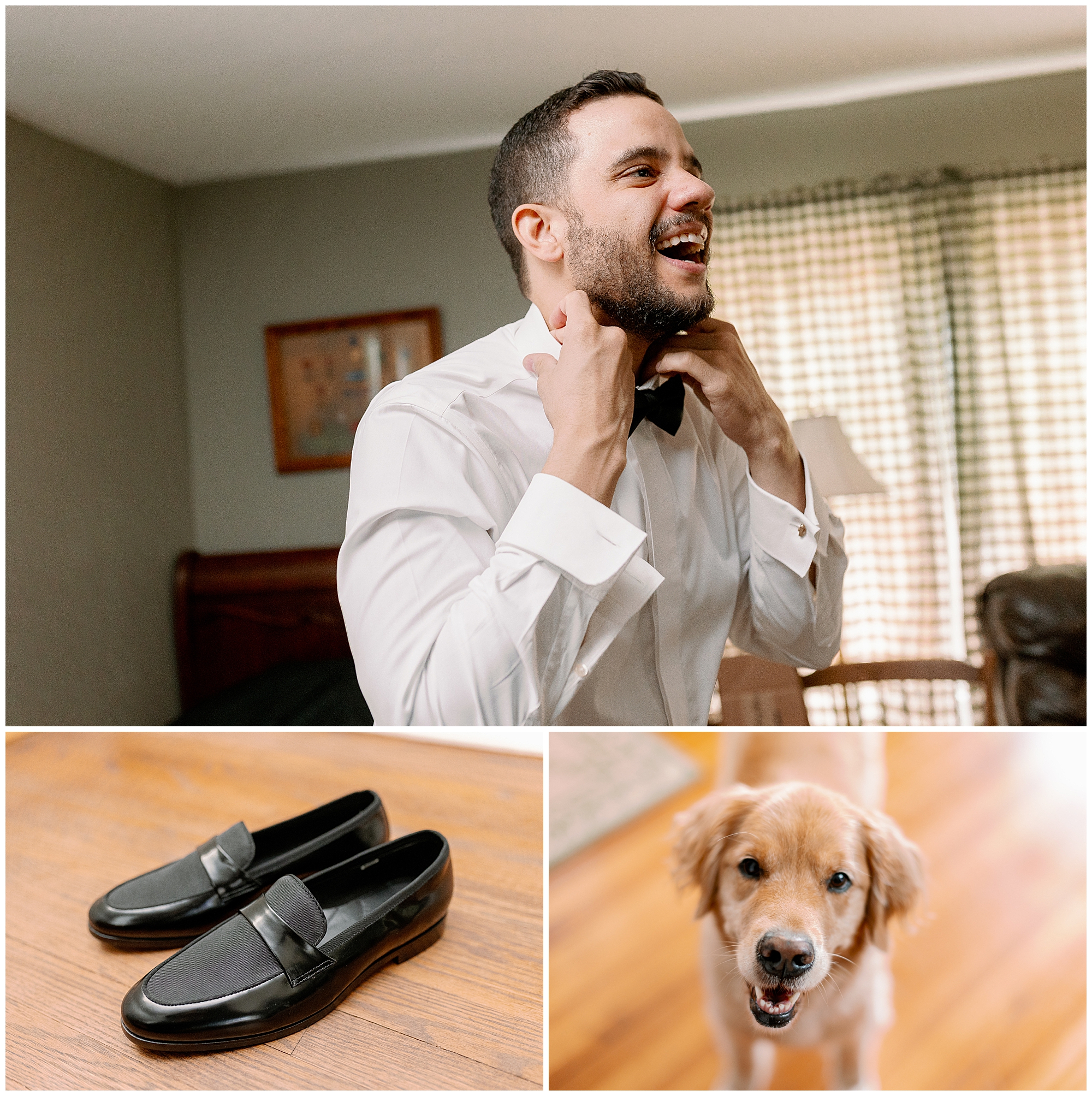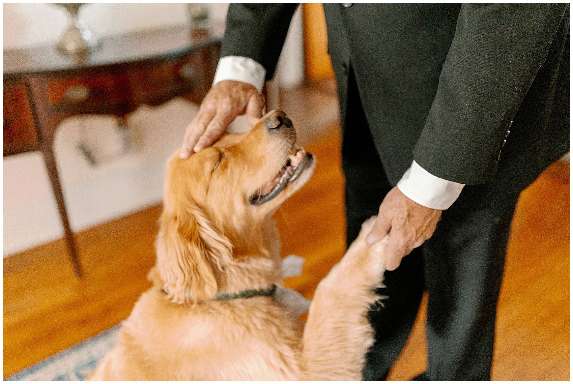 The day began with the couple getting ready in separate rooms, with Kenneth photographing the groom and Megan photographing the bride. Working as a team allows us to capture both perspectives simultaneously, making sure the couple doesn’t see each other before their first look. We started with a first look between Molly and her father on the family staircase, the same spot where her mother and grandmother were photographed decades earlier. It was such a sweet way to connect generations through wedding photos.